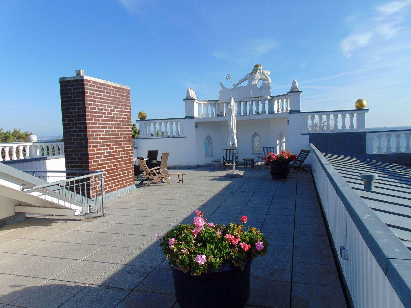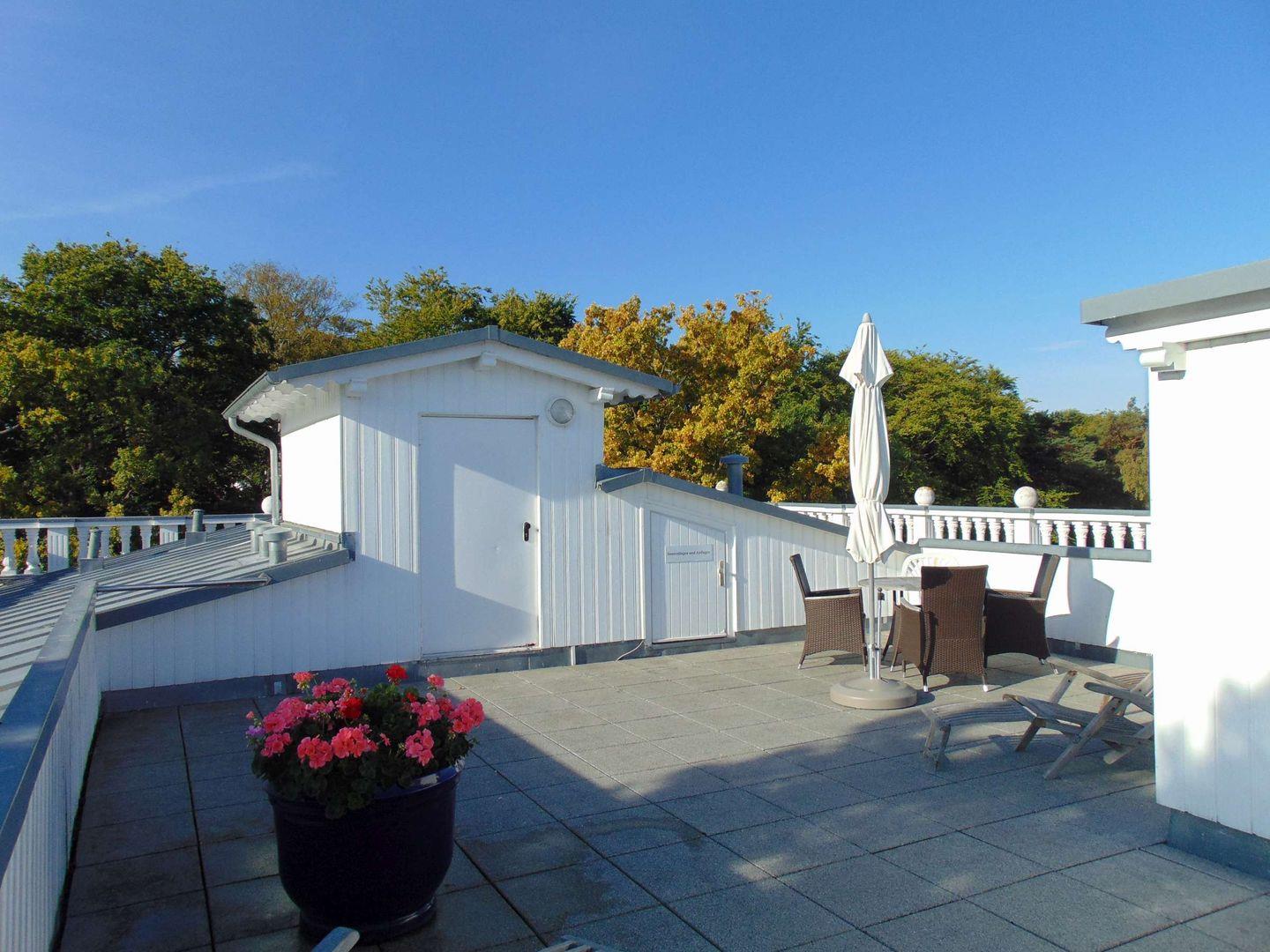 Die Dachterrasse bietet Ihnen und den anderen Gästen des Hauses gemütliche Sitz- und Liegemöglichkeiten. Von hier aus genießen Sie einen herrlichen Blick über die Ostsee. Perfekt für ein schönes Frühstück oder ein Mittagsschläfchen! Die Terrasse erreichen Sie über den Aufzug; Auflagen für die Gartenmöbel befinden sich in einem Extraraum.