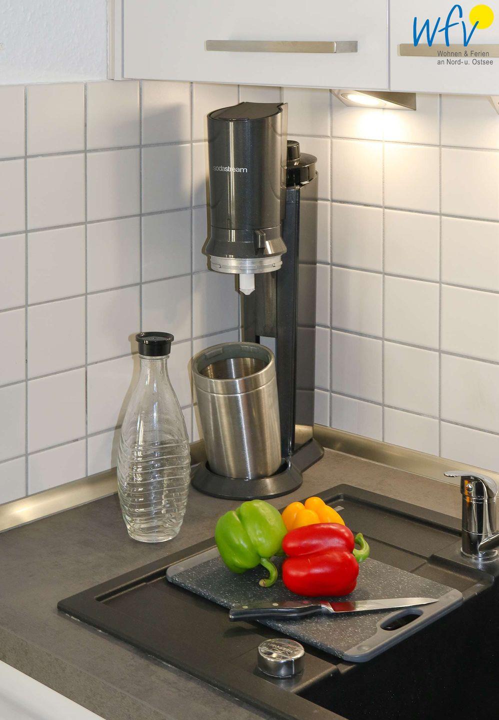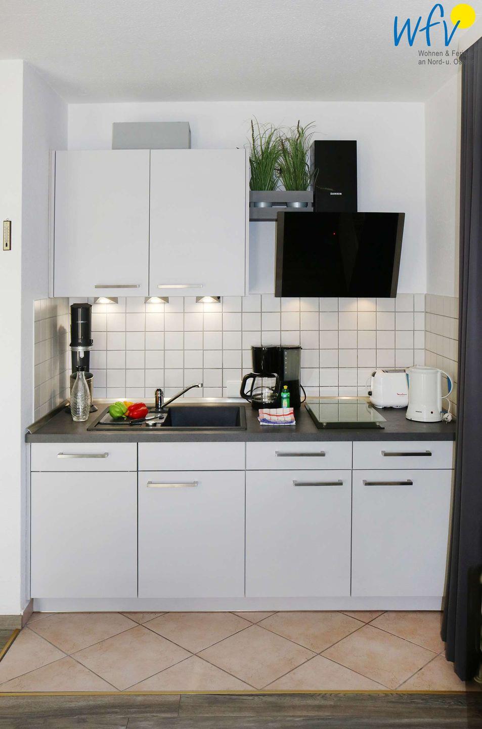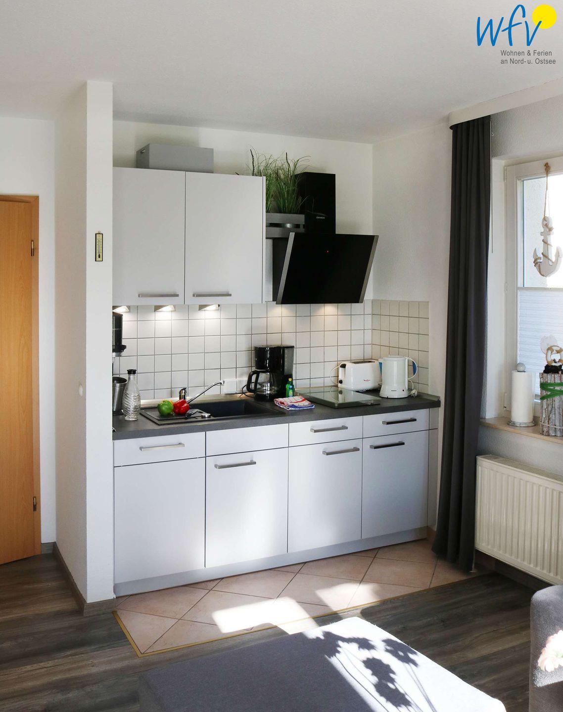 Das Ferienfrühstück, kleine Snacks oder leckere Mahlzeiten lassen sich bequem und einfach in der offenen Küche mit 2-Platten-Ceranfeld und Mikrowelle zubereiten. Kleingeräte wie Wasserkocher, Kaffeemaschine, Toaster und Eierkocher komplettieren die Ausstattung. So können Sie sich in Ihrem Urlaub bequem selbst verpflegen.