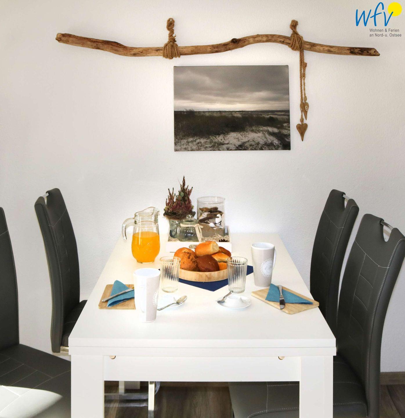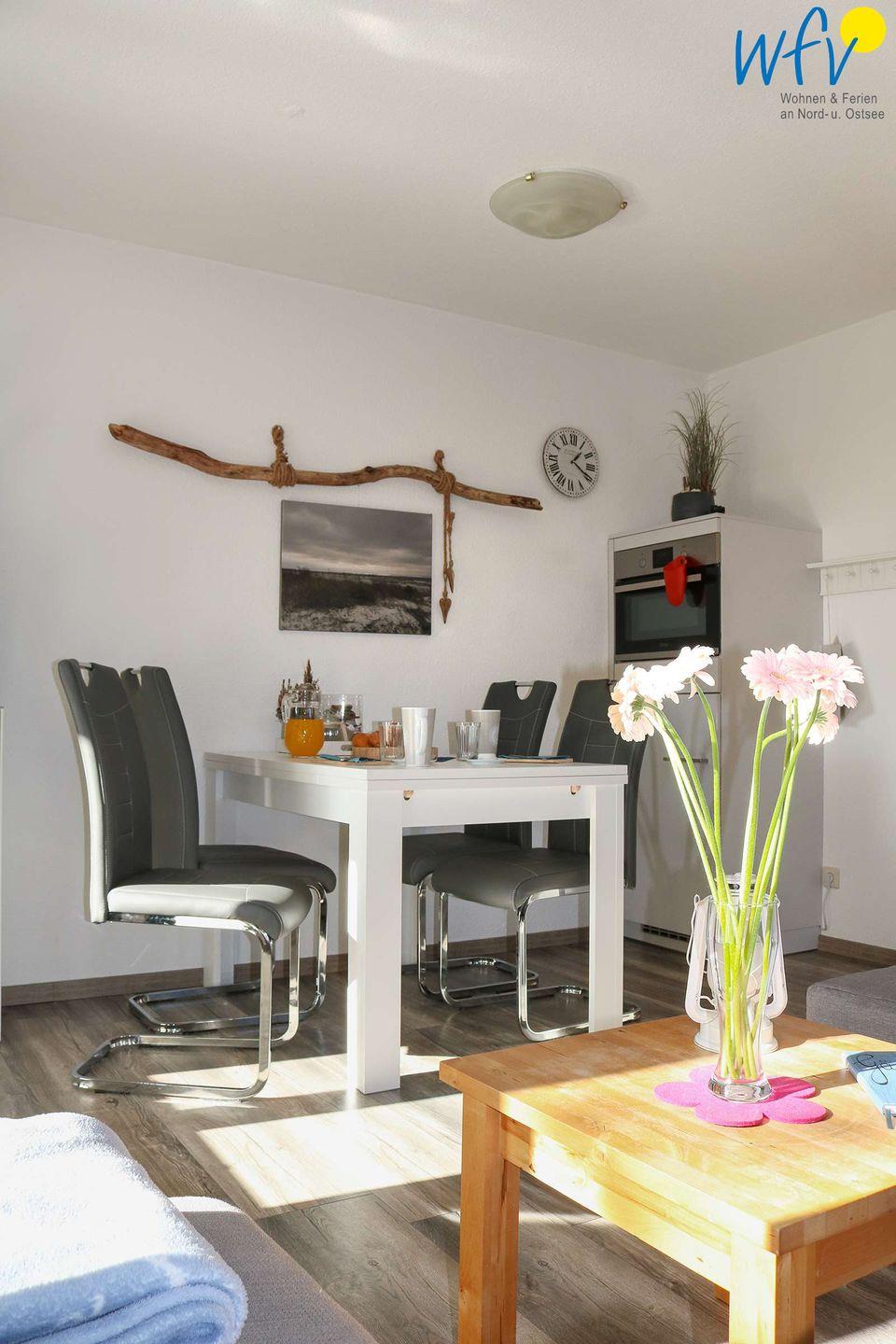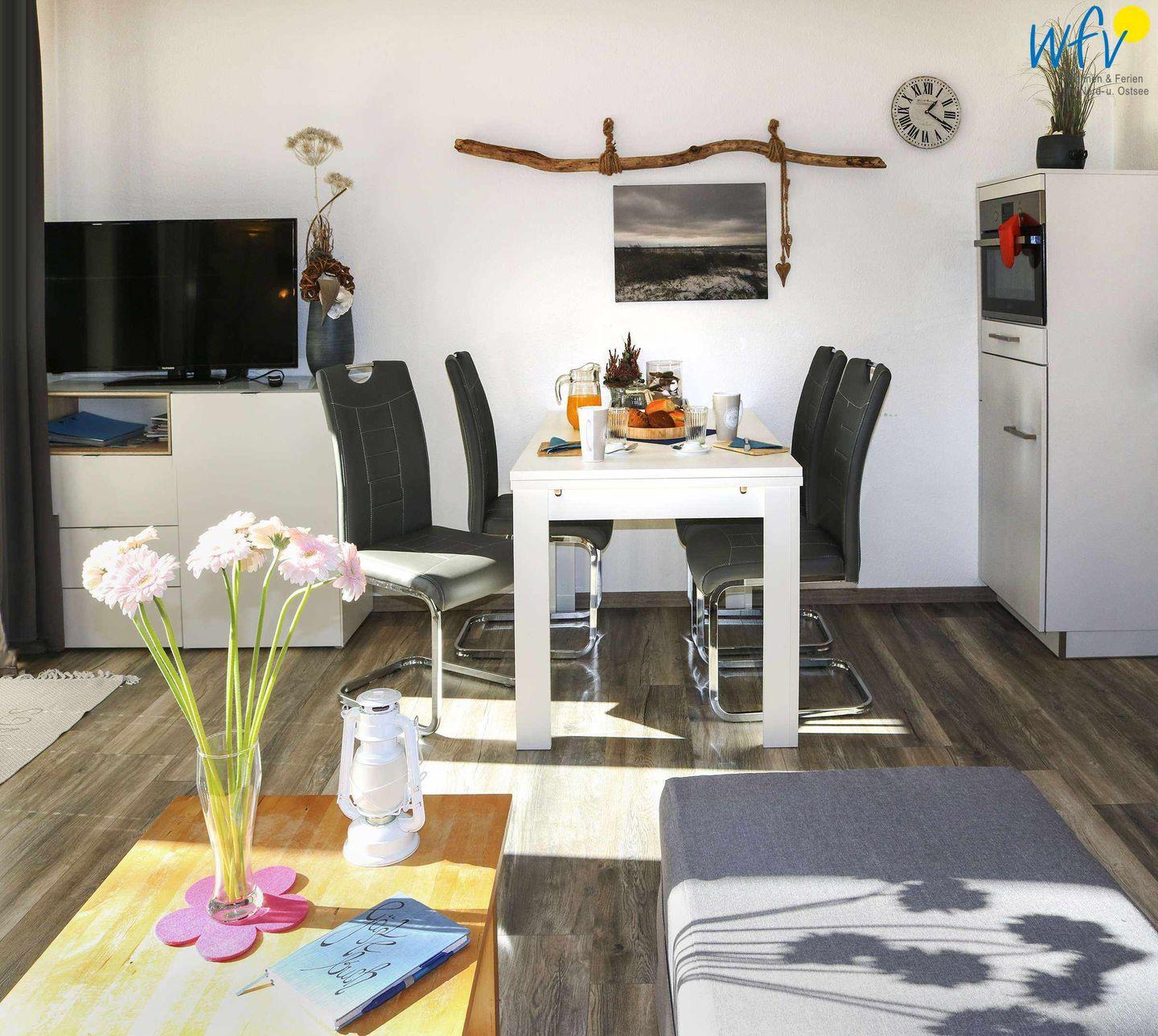 Das im Erdgeschoss liegende Appartement verfügt über eine Wohnfläche von 46 m² und ist ideal geeignet für zwei bis vier Personen. Es erwartet Sie ein heller Wohnraum mit Essbereich und offener Küche, ein separates Schlafzimmer sowie ein weiß gefliestes Bad mit Dusche und Fenster. Eine stilvolle Einrichtung in harmonischen Farben verleiht der Wohnung eine freundliche Atmosphäre.