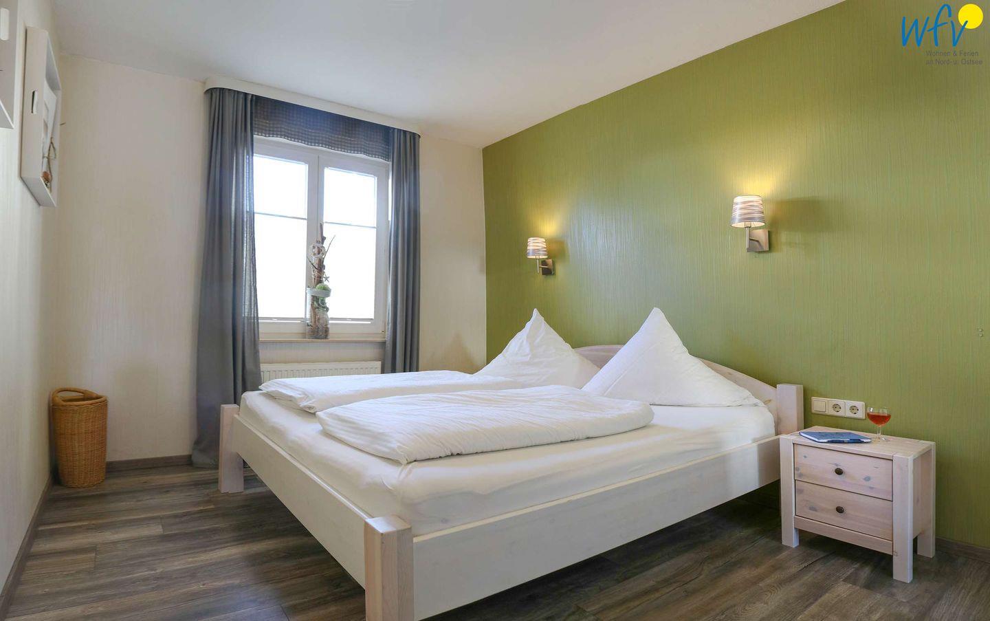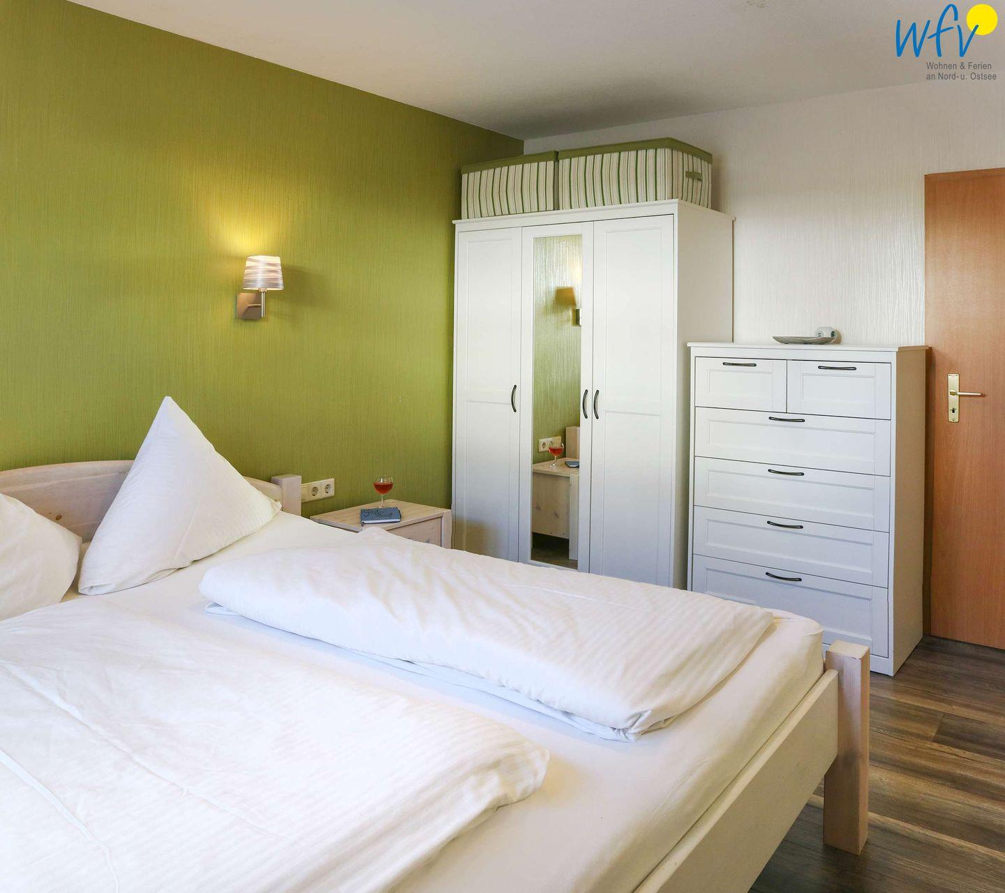 Das separate Schlafzimmer der Ferienwohnung in Binz ist mit einem Doppelbett und einem Kleiderschrank ausgestattet. Eine Schlafcouch im Wohnzimmer kann als Aufbettung für zwei weitere Personen genutzt werden.