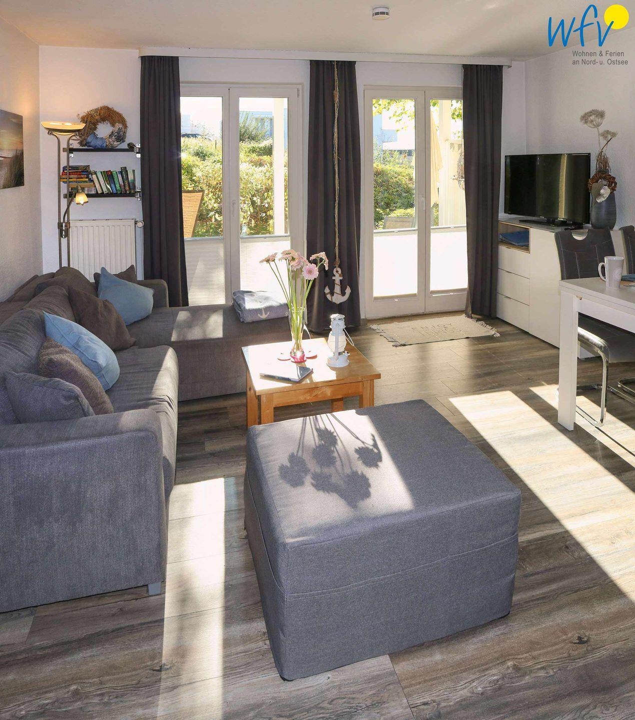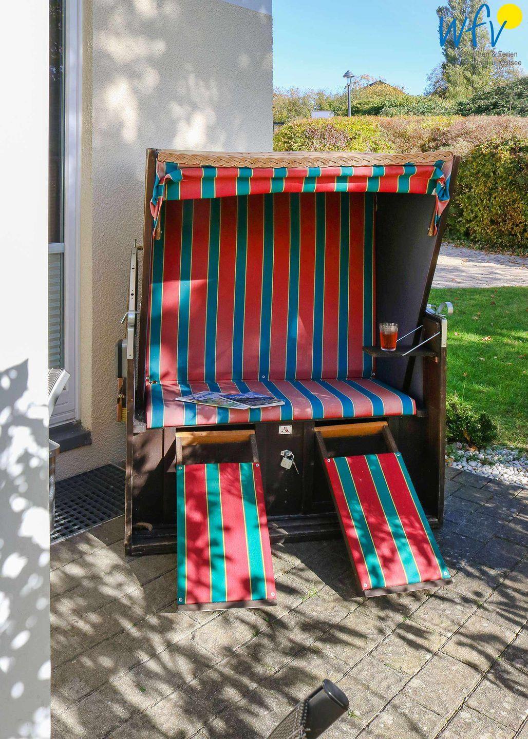 In dem gemütlich eingerichteten Wohnraum können Sie in der Couchecke mit TV und Radio entspannen. Oder Sie genießen Sonnenstunden auf der Südterrasse! Eine Gartensitzgruppe sowie ein eigener Strandkorb laden zu herrlichen Stunden zum Relaxen ein. Für unsere kleinen Gäste befindet sich direkt um die Ecke ein kleiner Spielplatz mit Strandsand.