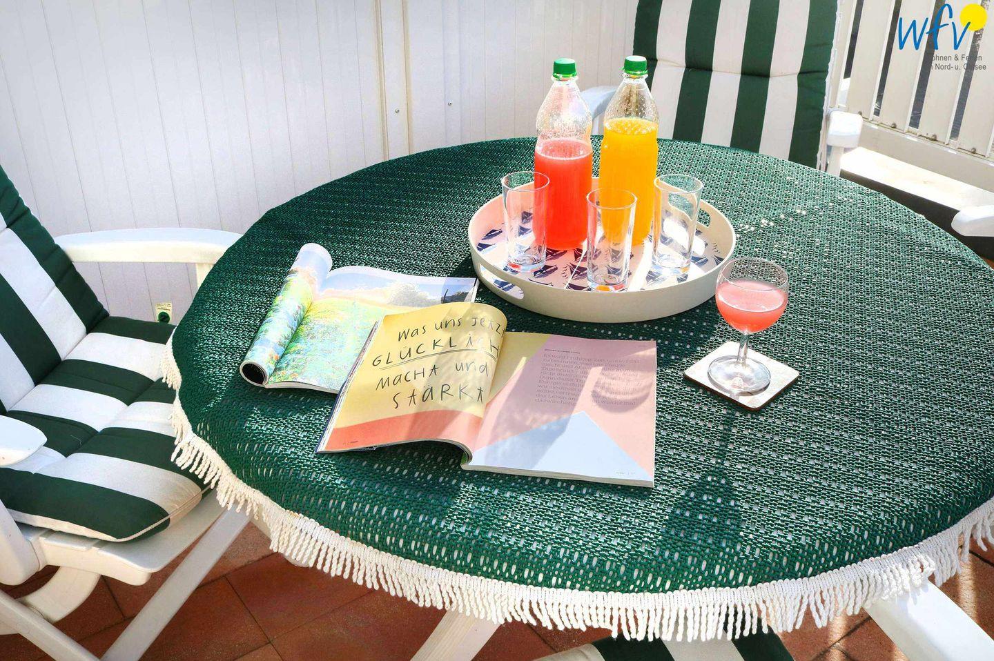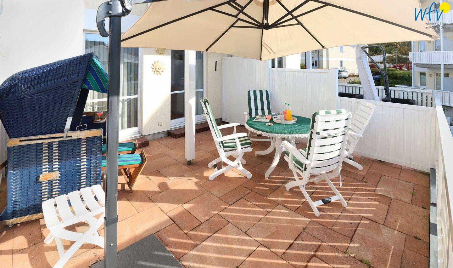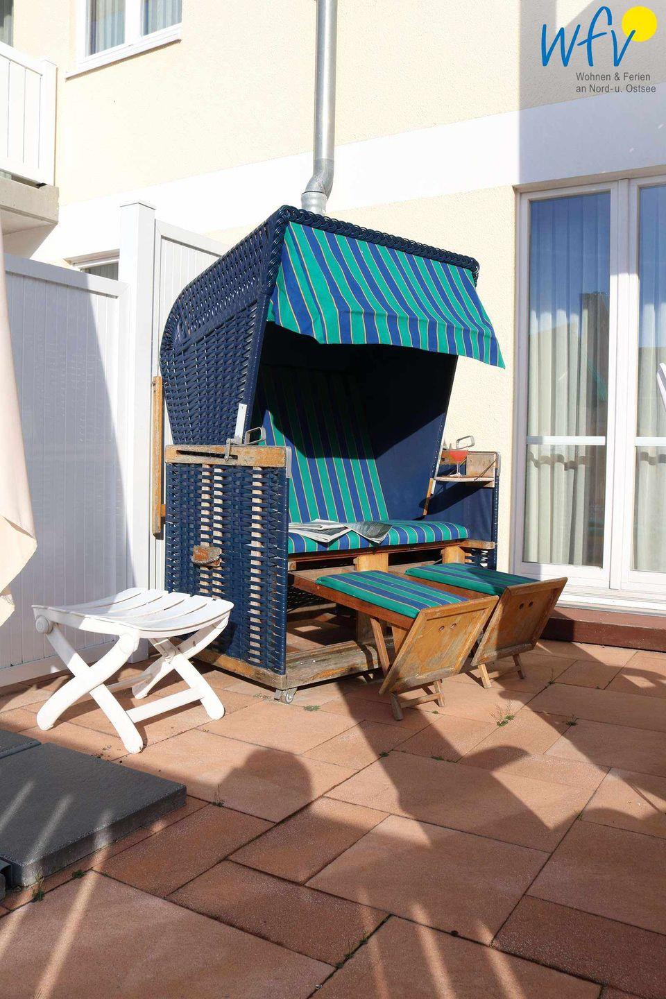 Vom Wohnzimmer aus gelangen Sie auf die großzügige Hochterrasse (ca. 17 m² !), die mit einem Gartentisch und vier Hochlehnstühlen sowie mit zwei Liegen und einem gemütlichen Strandkorb ausgestattet ist. Ein wunderschöner Ort, um erholsame Urlaubsmomente zu verbringen, in Ruhe zu lesen oder einfach mal die Seele baumeln zu lassen.
