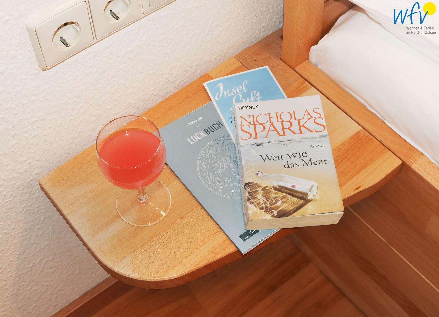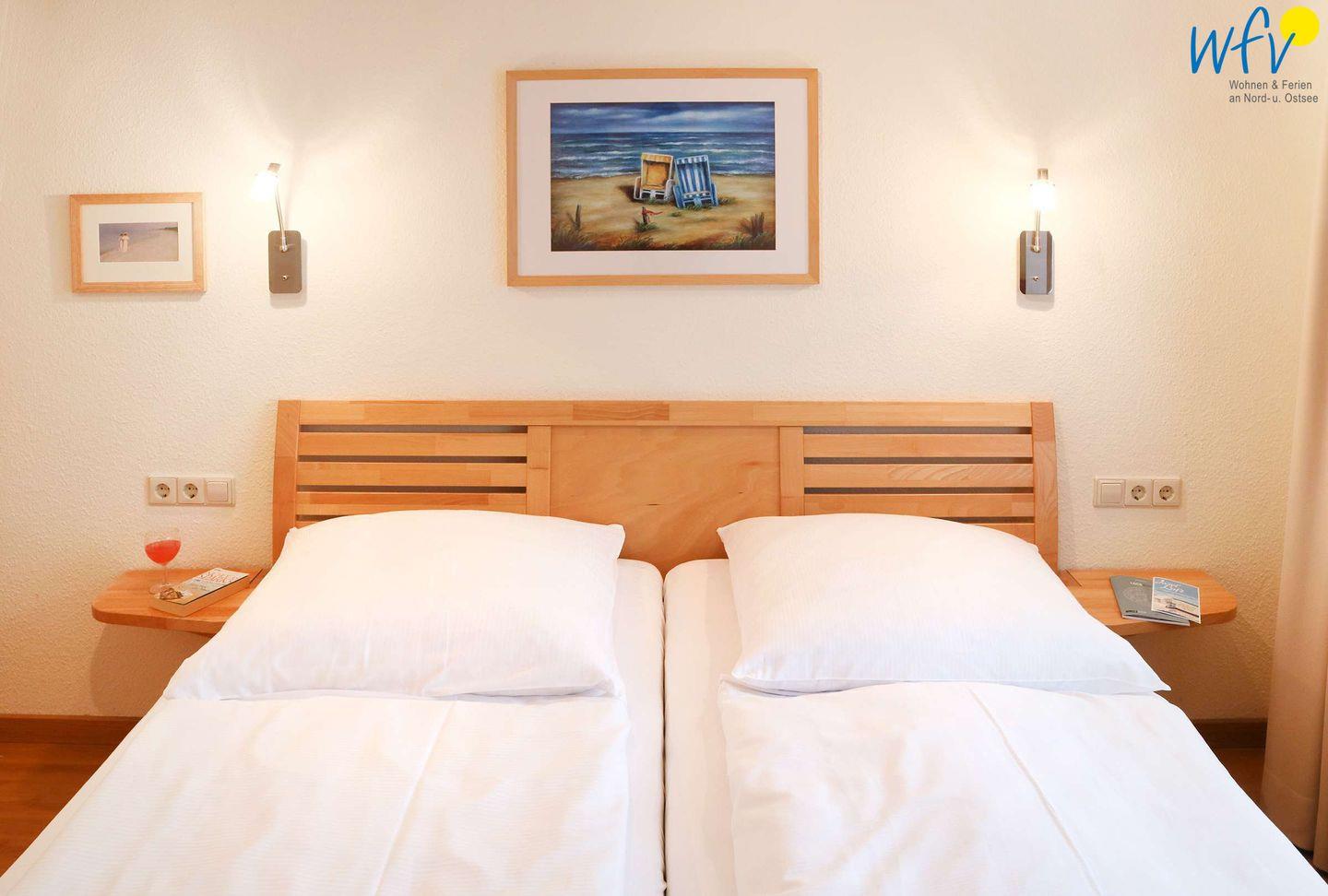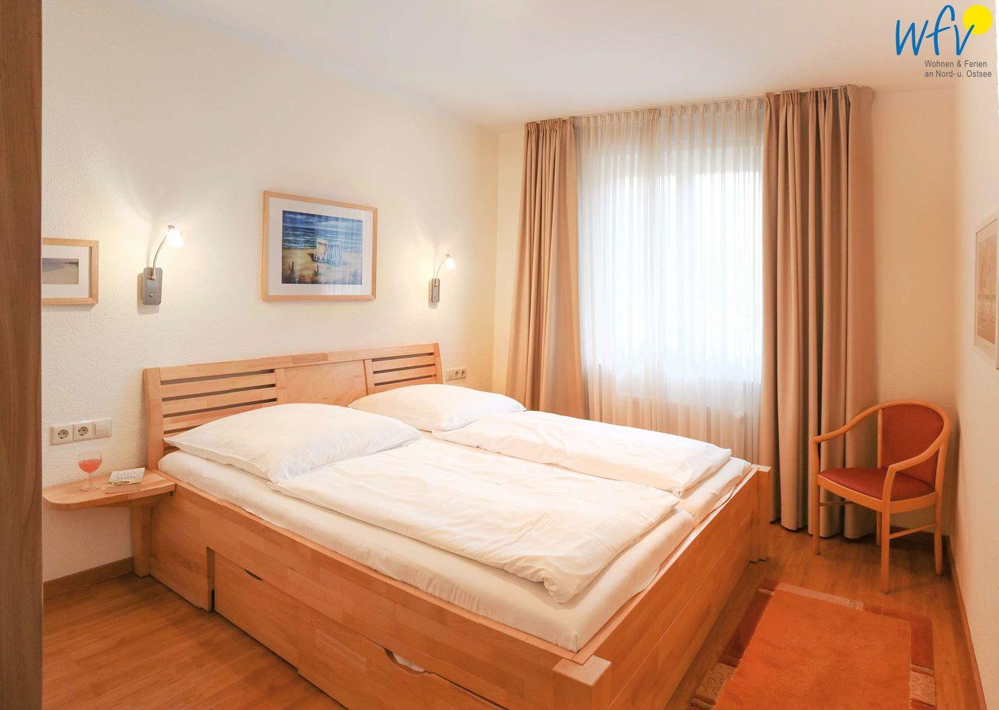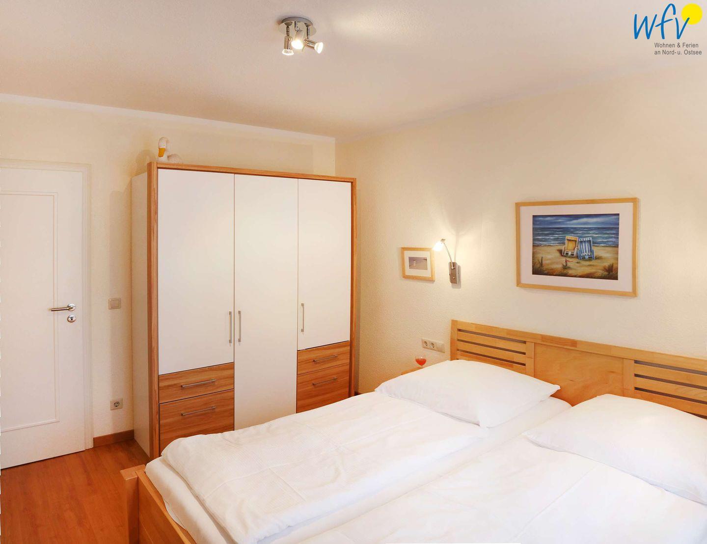In dem separaten Schlafzimmer der Ferienwohnung befindet sich ein Doppelbett (1,80 m x 2 m). Das bequeme Schlafsofa im Wohnzimmer bietet eine Aufbettung für zwei weitere Personen (Liegefläche 1,40 m).