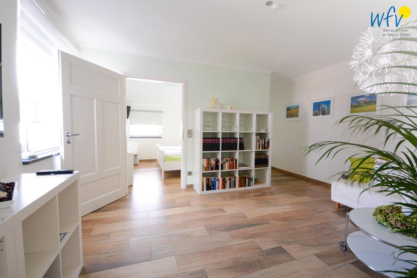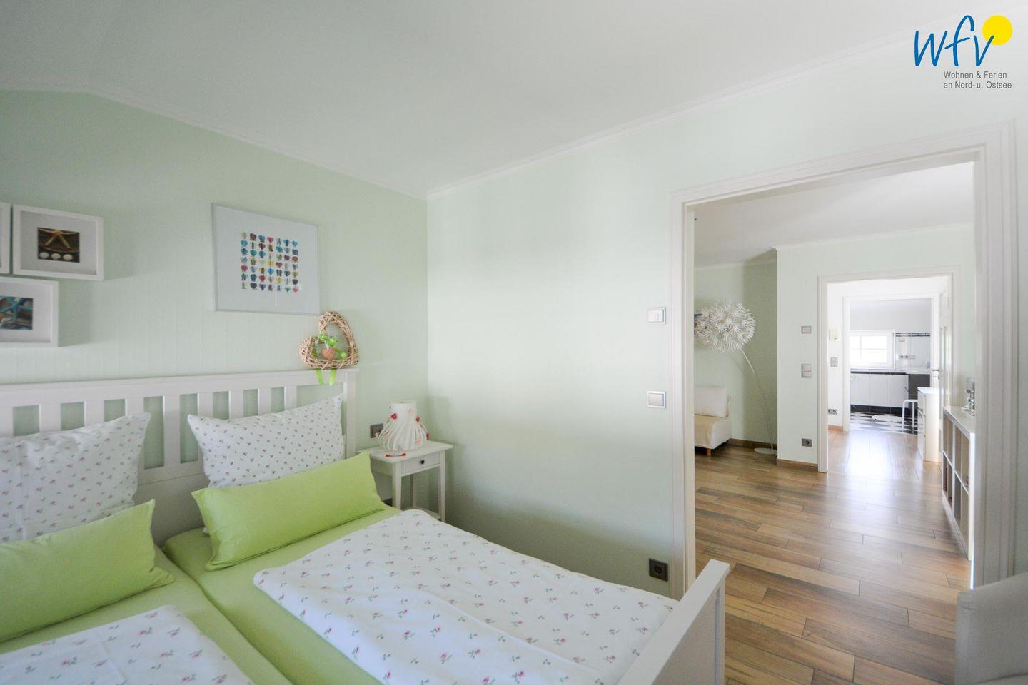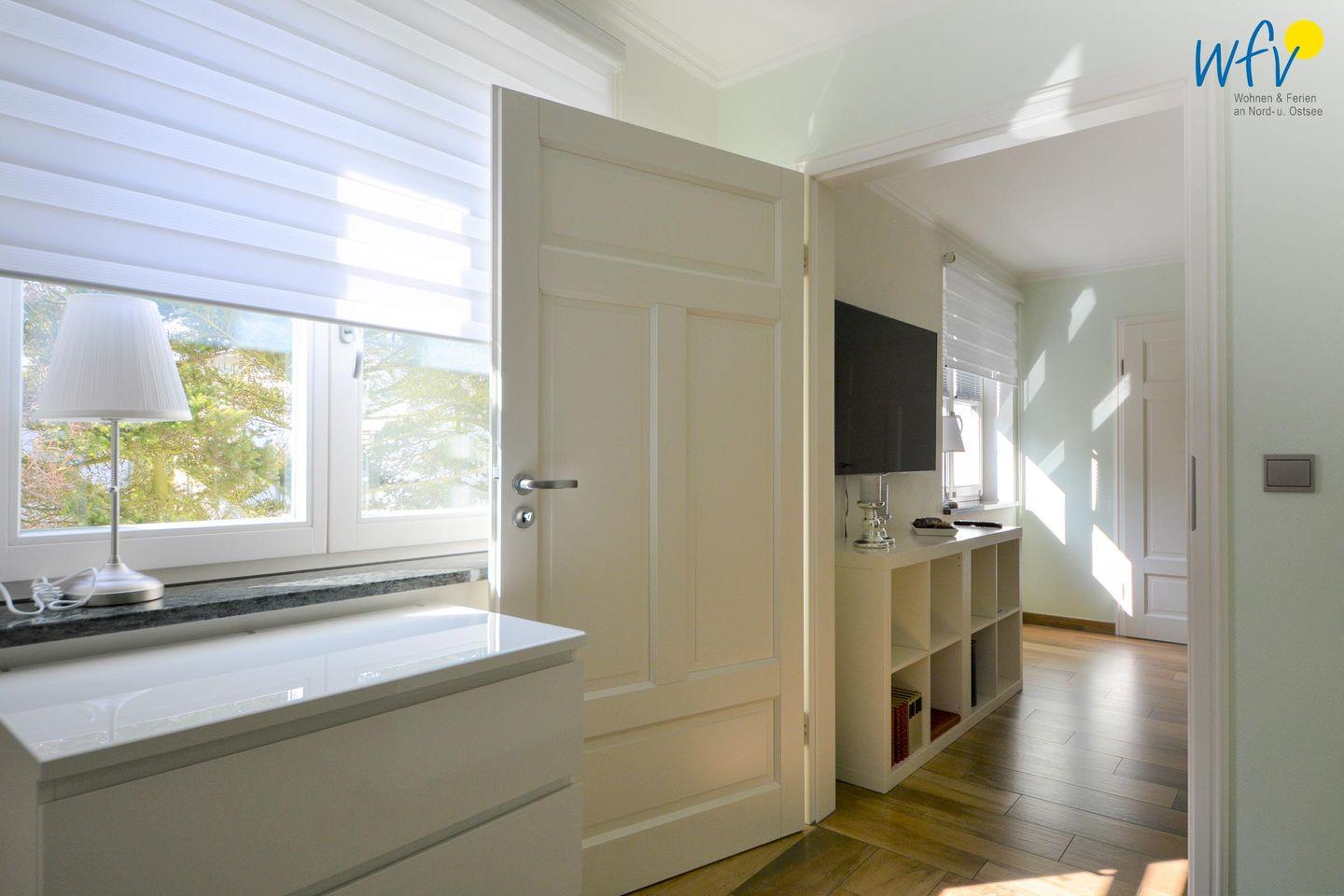 In dem separaten Schlafraum der Ferienwohnung in Binz befindet sich ein komfortables Doppelbett und ein TV. Übernachtungsmöglichkeiten für eine weitere Person besteht durch die Schlafcouch im Wohnraum.