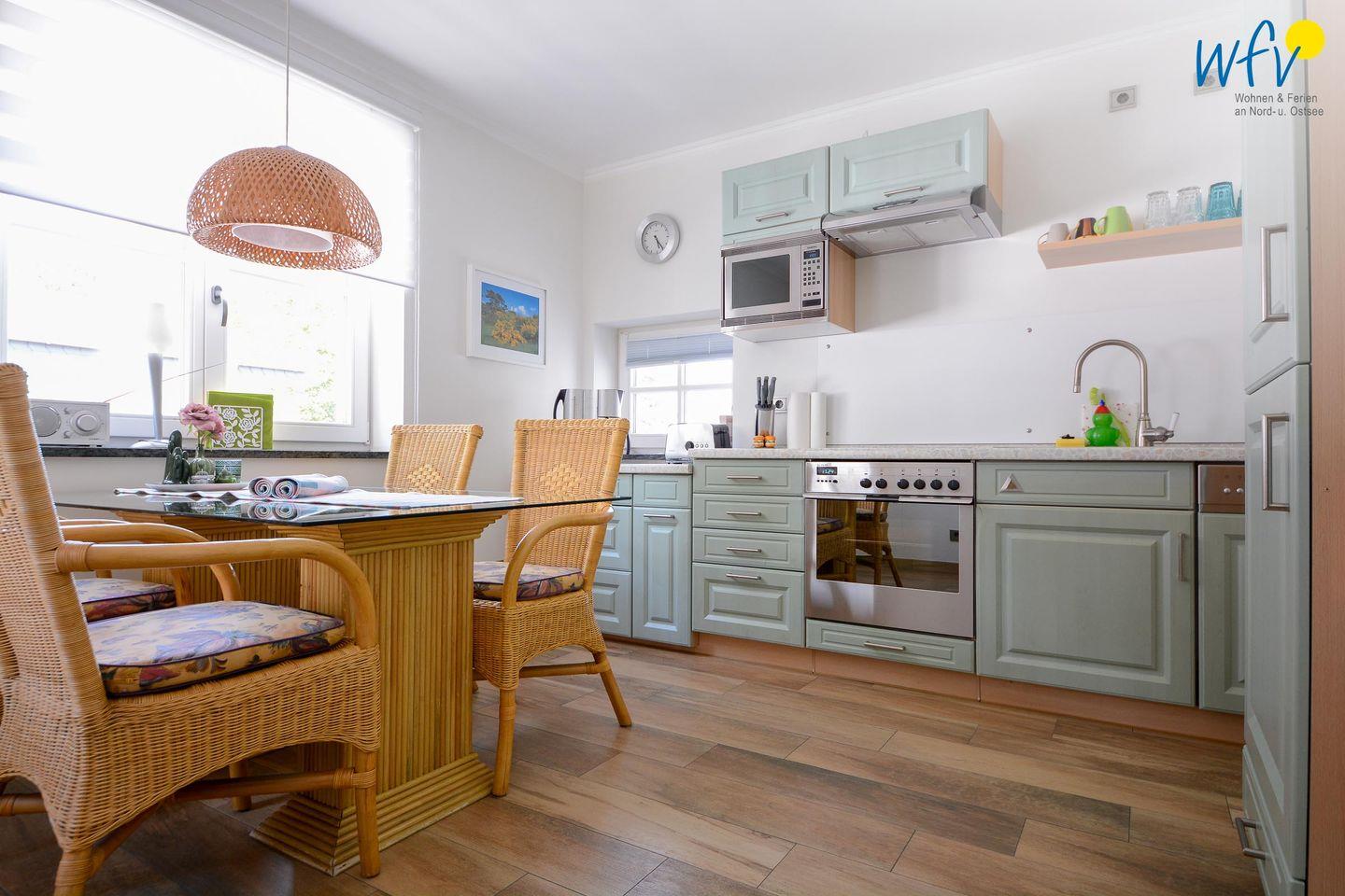 Für die bequeme Selbstverpflegung verfügt die separate Küche über einen Herd mit Backofen, eine Mikrowelle und eine Spülmaschine. Auch eine Heißluftfritteuse / Airfryer, Fabrikat Ninja ist vorhanden. Zu gemeinsamen Mahlzeiten lädt der hübsche Glasesstisch mit Korbstühlen ein.