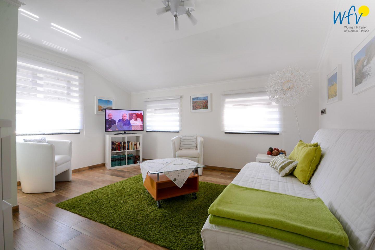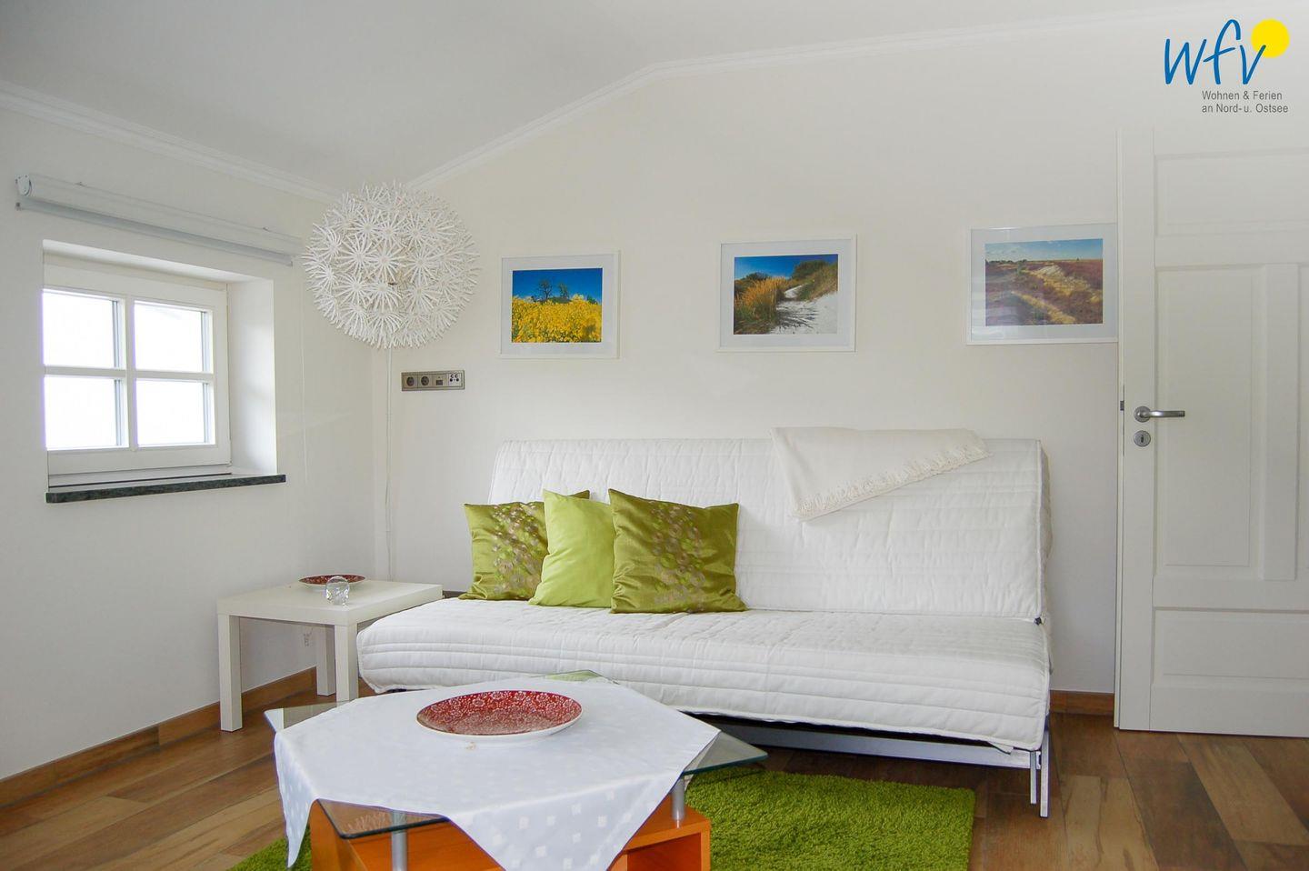 Urlaubszeit heißt Zeit zum Relaxen! Herrlich entspannen können Sie vor allem im Wohnraum der Ferienwohnung. Eine bequeme Sitzgruppe mit TV lädt zu gemütlichen Filmabenden ein. Es besteht die Möglichkeit, einen DVD-Player für Ihren Aufenthalt zu erhalten. Zum Surfen vom Smartphone aus empfangen Sie freies WLAN.