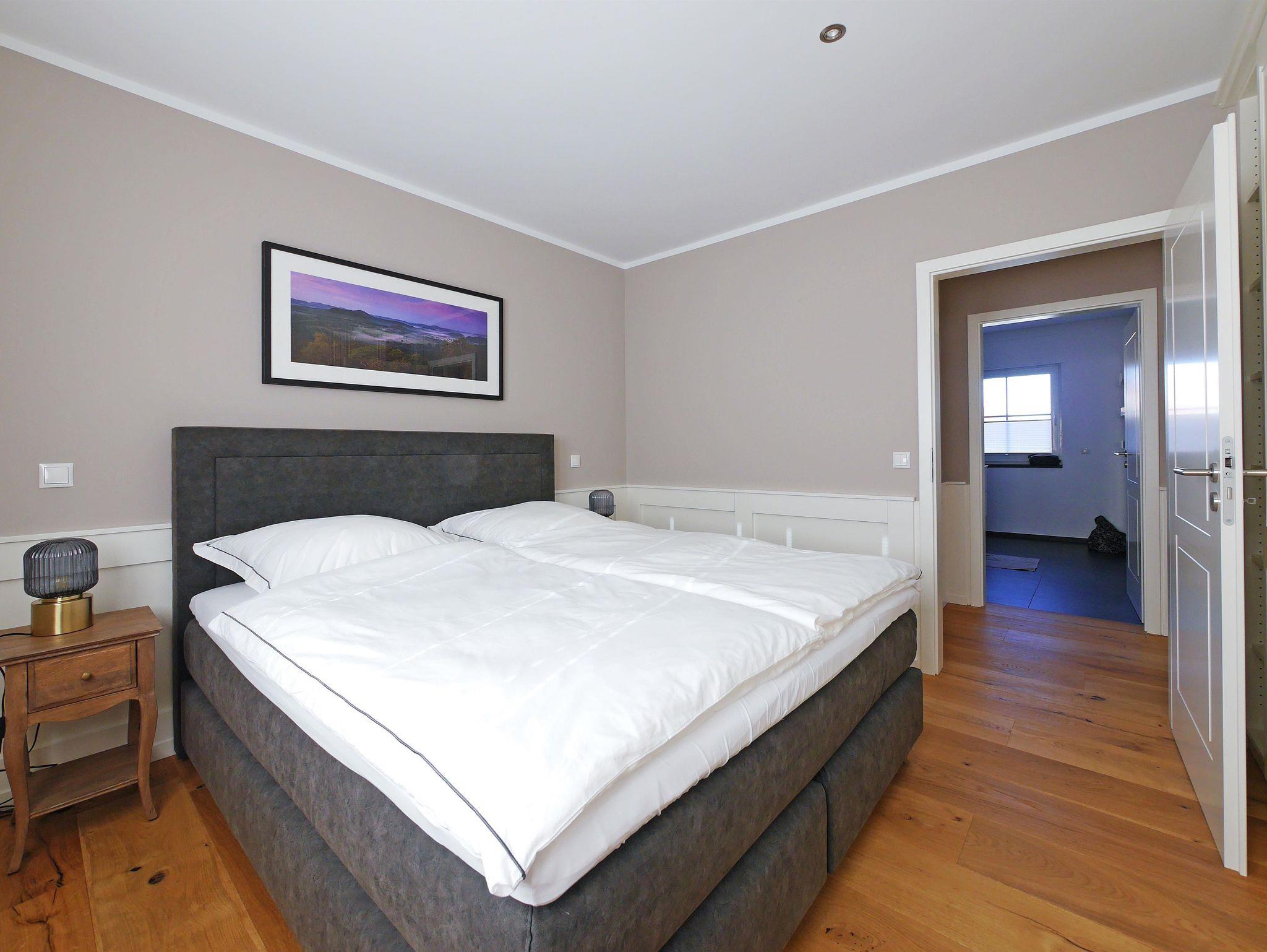 Diese Ferienwohnung liegt im ersten Stock und ist über eine Außentreppe zu erreichen. Durch einen kleinen Flur kommt man in die liebevoll ausgestattete Wohnung, welche über ein großzügiges Wohnzimmer mit gemütlicher Couch, Flatscreen-TV und Leseecke verfügt. Angrenzend befindet sich eine geräumige und voll ausgestattete Küche mit kleiner Eckbank. Das helle Schlafzimmer bietet Ihnen ein Doppel-Boxspringbett und einem Platz bietendem Schrank. Das Badezimmer der Wohnung verfügt über Tageslicht, eine komfortable Dusche, ein Waschbecken mit Spiegelschrank und ein WC. Über die Wohnzimmertür gelangen Sie auf die große Terrasse mit einladender Sitzmöglichkeit. Es handelt sich um eine Nichtraucherwohnung, in der Haustiere nicht erlaubt sind. Einen Parkplatz finden Sie direkt vor dem Haus.