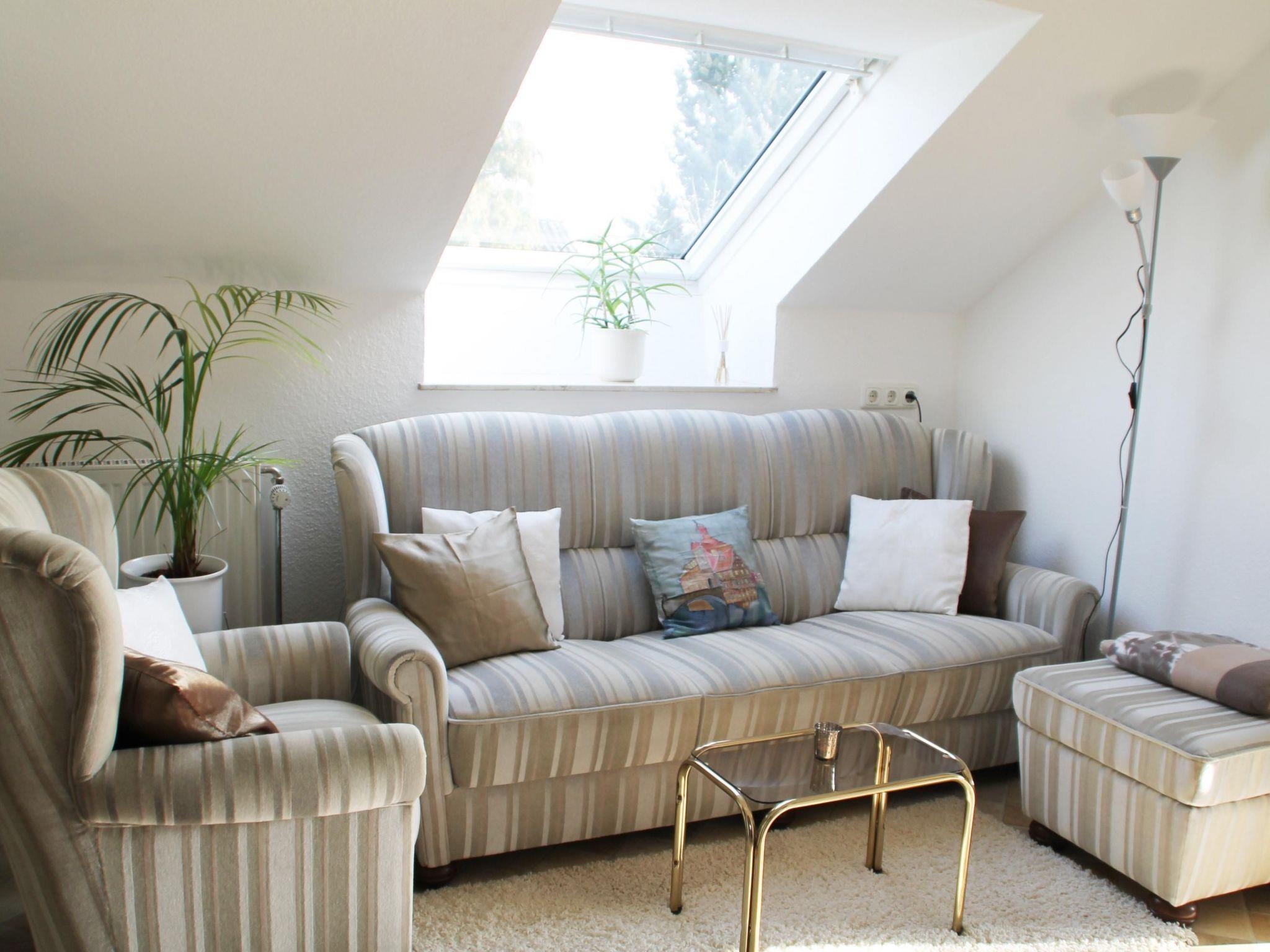 The 60 m² holiday flat was renovated in 2014 and is comfortably furnished. It is located on the top floor of a traditional Franconian house. The flat has two bedrooms, which are furnished with a double bed (2 beds 95 x 200 cm) and two single beds (95 x 200 cm). The living room has a cosy seating area. The bright, modern kitchen has a dining area and is fully equipped. The bathroom has a shower and WC and there is an additional WC in the entrance area. All rooms can be heated.
