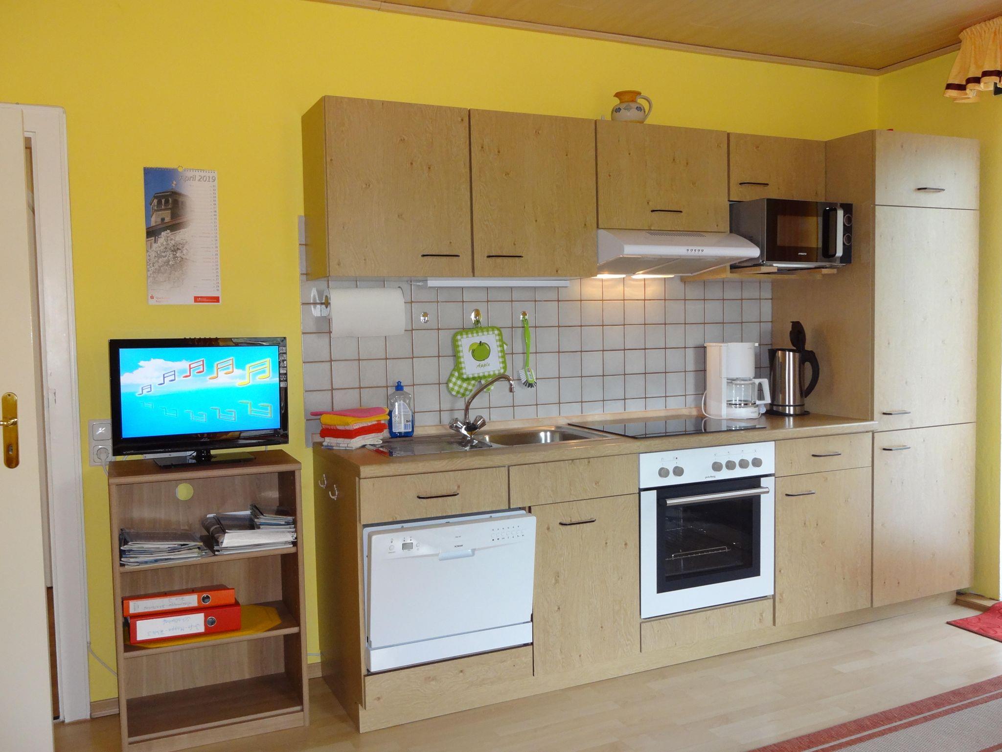 Küchenzeile mit Spülmaschine, Toaster, Kaffeemaschine, Wasserkocher, Eckbank, Backofen mit Ceranfeld, Kühlschrank mit Gefrierfach