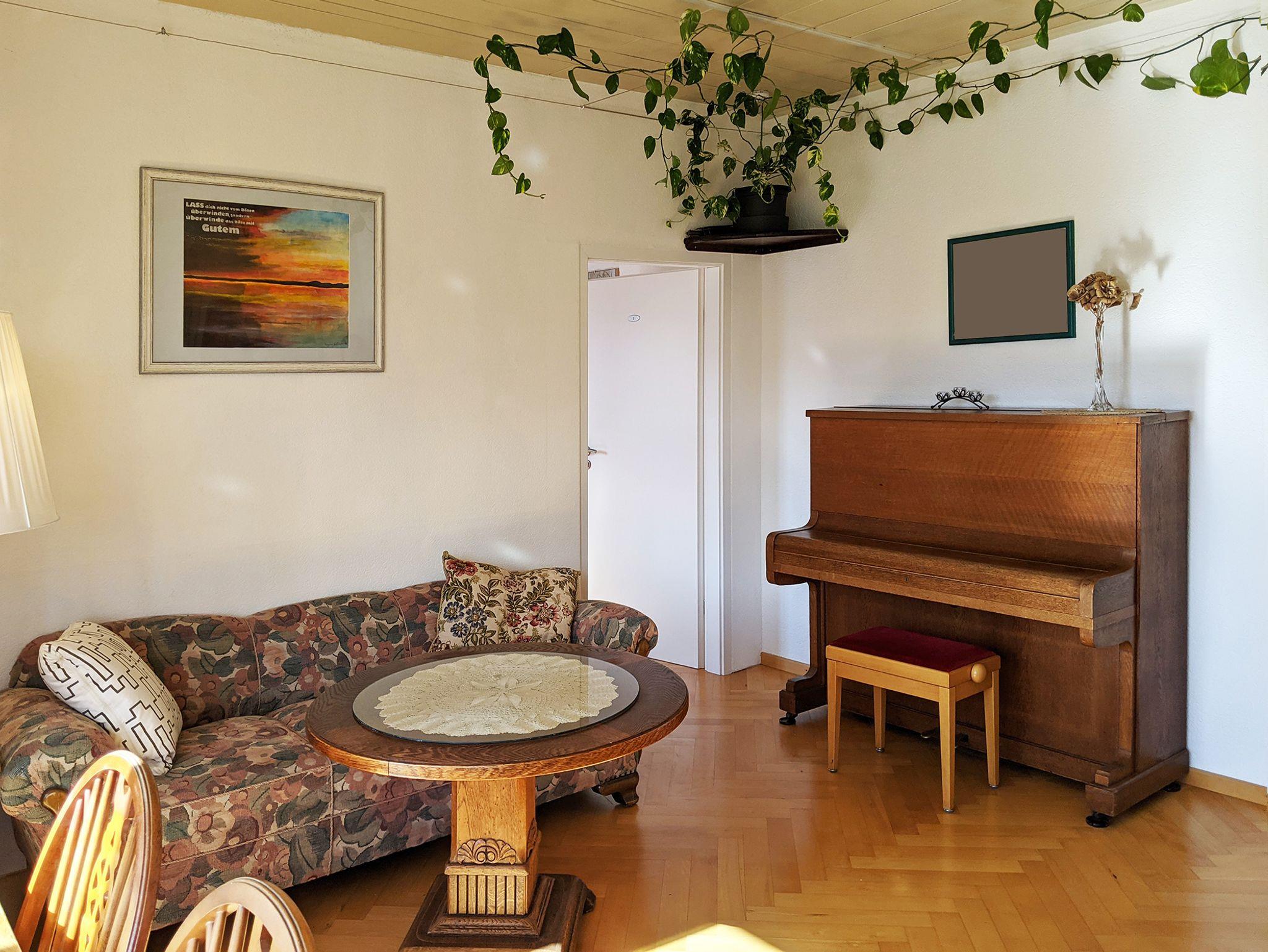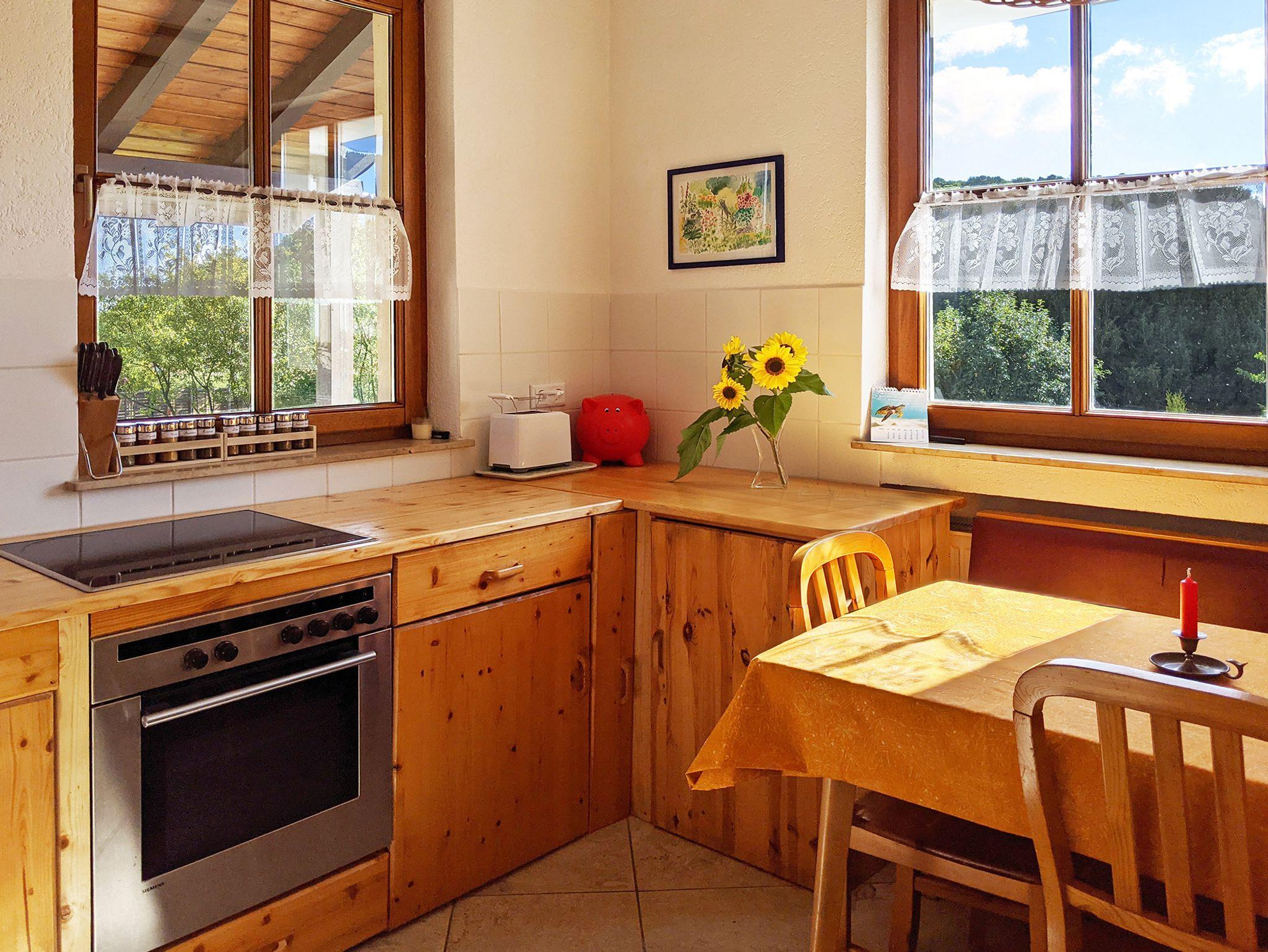 Die liebevoll eingerichtete Ferienwohnung befindet sich im Erdgeschoss einer im Grünen gelegenen Villa und bietet auf 90 Quadratmetern Platz für bis zu 8 Personen. Sie verfügt über zwei gemütlich eingerichtete Schlafzimmer, jeweils mit einem Doppelbett und einem süßen Kinder-Spiel-Bettchen, sowie über ein weiteres Zimmer mit einem Stockbett. Die sehr geräumige Designer-Küche ist mit Ceran-Kochfeld, Backofen, Mikrowelle, Toaster, Sandwich-Maker, Spülmaschine, Kaffemaschine, Wasser- und Eier-Kocher, Kühl-Gefrier-Kombi-Gerät, Waffeleisen, Popcorn Maker, Pürierstab und Mixer bestens ausgestattet. Ein paar Kochbücher und eine Vielfalt an vorhandenen Küchengerätschaften sollen Ihre kulinarische Kreativität anregen. In der Küche finden Sie auch eine Essecke mit Tisch, Stühlen, Eckbank und einer wunderschönen Aussicht ins Grüne. Vom Wohnzimmer aus haben Sie einen großartigen unverbauten Panoramablick auf den Kreuzberg. Es enthält einen großen Esstisch für bis zu 8 Personen, der sogar noch vergrößert werden kann, ein Sofa, einen Schaukelstuhl und ein Klavier sowie einen SAT-Fernseher mit Internetzugang. Ein Spieleschrank mit einer alten Puppenküche, vielen Kinderbüchern sowie Spiel-, Mal- und Bastelsachen sorgen dafür, dass sich Kinder auch bei schlechtem Wetter gut beschäftigen können. In einer kleinen Hausbibliothek finden Sie die unterschiedlichsten Bücher in verschiedenen Sprachen und eine große Sammlung Brettspiele. Das geräumige Badezimmer verfügt über Badewanne, Dusche, WC, Bidet, Wickelauflage, Waschmaschine, Wäschetrockner und Wäscheständer, Föhn, Bügeleisen, Bügelbrett, Staubsauger und ist mit großen Spiegeln ausgestattet. Bei schönem Wetter können Sie auf der sonnigen Veranda sitzen; die Kinder können im Garten spielen oder bei Gartenarbeiten mithelfen.