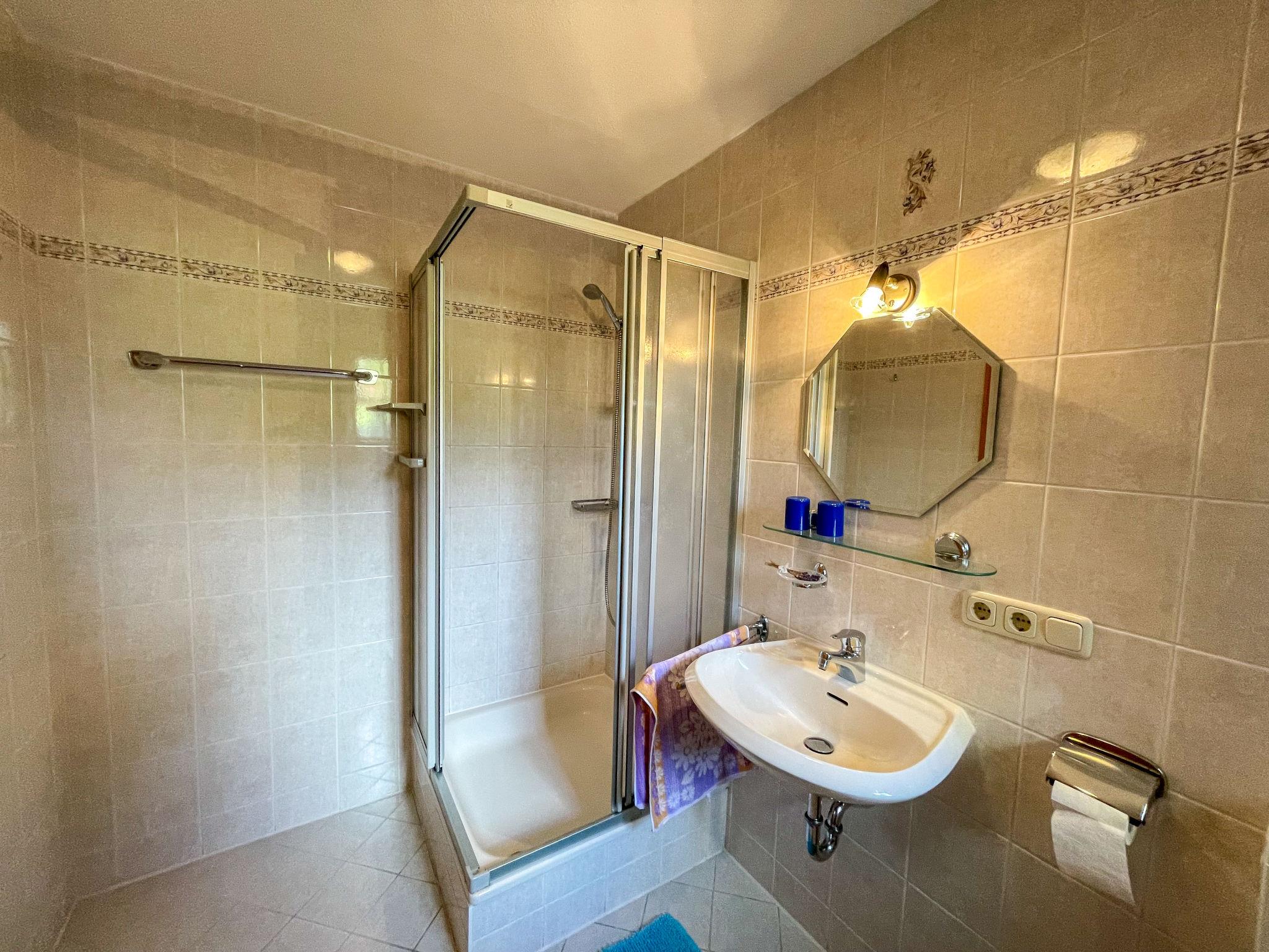 3-room apartment 60 m2, on the upper ground floor. Cosy furnishings: living/dining room with dining nook and satellite TV. Exit to the balcony. 1 double bedroom. 1 room with 2 beds. Kitchenette (oven, dishwasher, 4 ceramic glass hob hotplates, toaster, kettle, microwave, electric coffee machine). Shower/WC. Oil heating. Balcony. Balcony furniture, deck chairs. Beautiful view of the countryside. Facilities: children's high chair, baby cot. Internet (WiFi, free). Please note: non-smokers only. Smoke alarm, fire extinguisher. Bookings accepted for holiday purposes only.