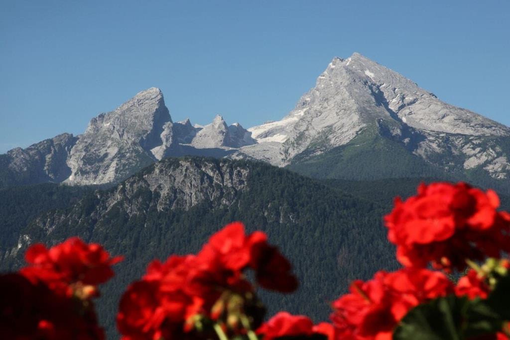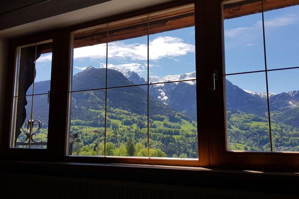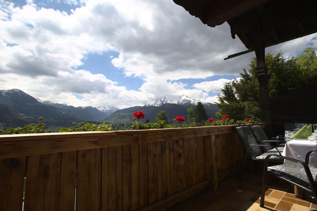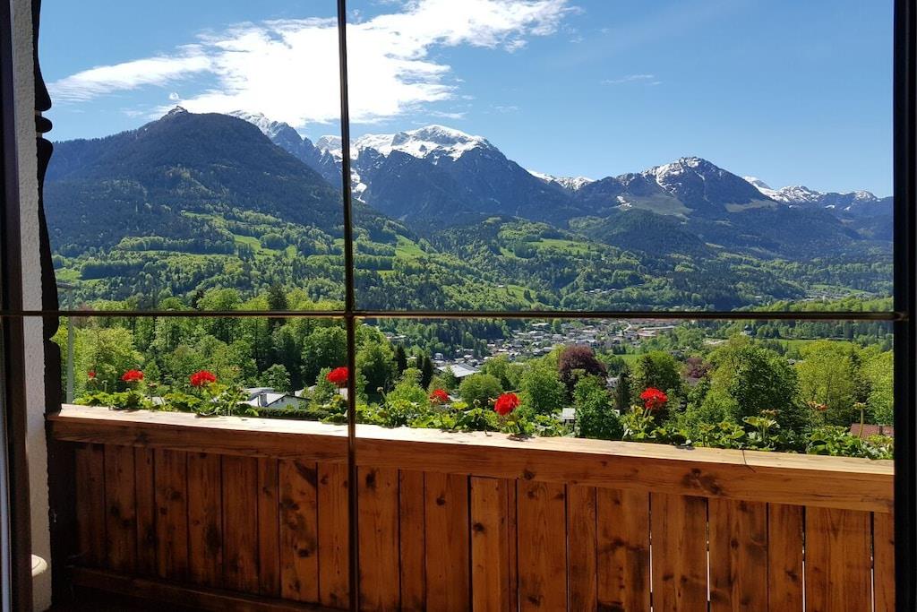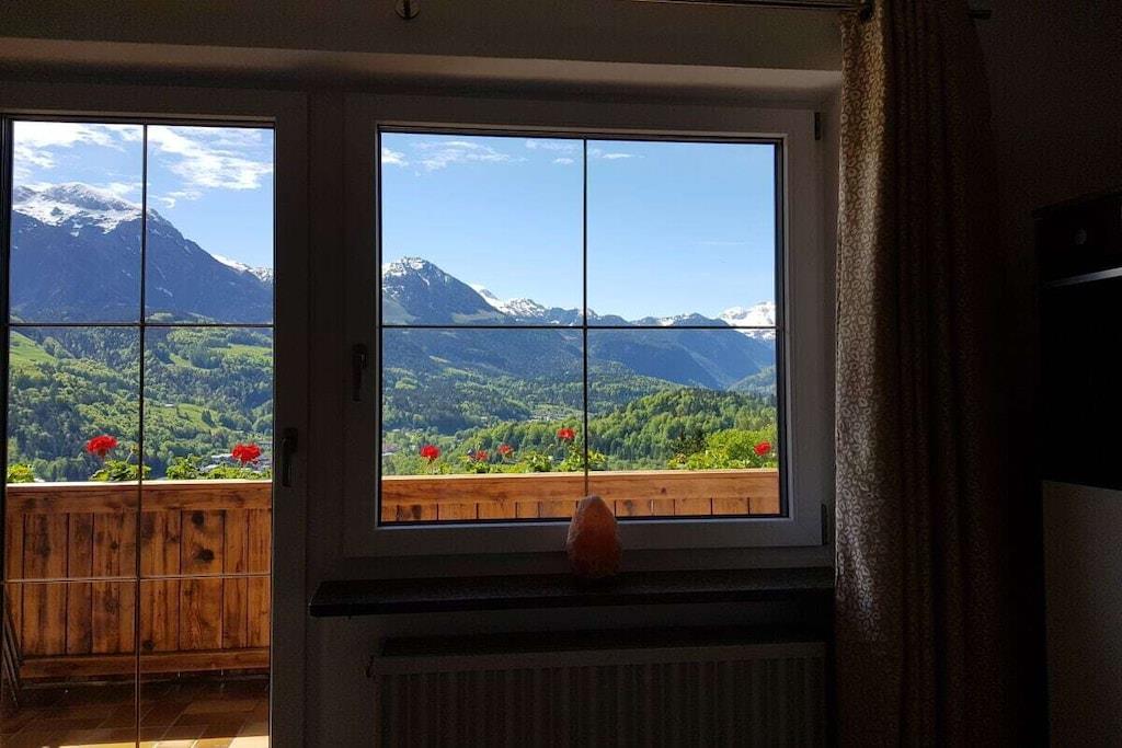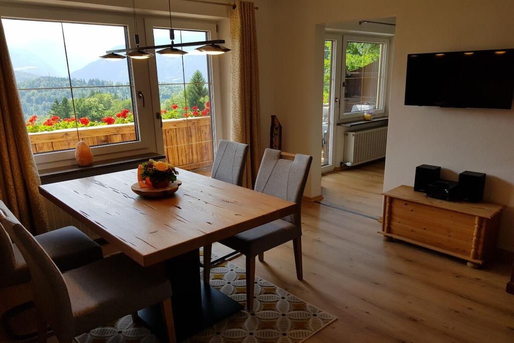 Alle Zimmer unserer liebevoll eingerichteten Ferienwohnung liegen zur Südseite mit einzigartigem Panoramablick auf die Berchtesgadener Berge. Zur Ausstattung gehören ein gemütliches Wohnzimmer mit ausziehbarer Eckcouch, ein Schlafzimmer mit Doppelbett und separatem gr. Schlafsessel, ein Badezimmer mit Dusche/WC, separates WC, eine vollausgestattete Einbauküche mit vielen Extras wie z. B. Spülmaschine, Toaster, Backofen, Ceranfeld, Kaffeemaschine, ein schönes Esszimmer, ein kl. Waschraum mit Waschmaschine, Trockner, Bügelbrett und Bügeleisen, sowie ein gr. Südbalkon mit Sitzgelegenheit und Liegestühlen.