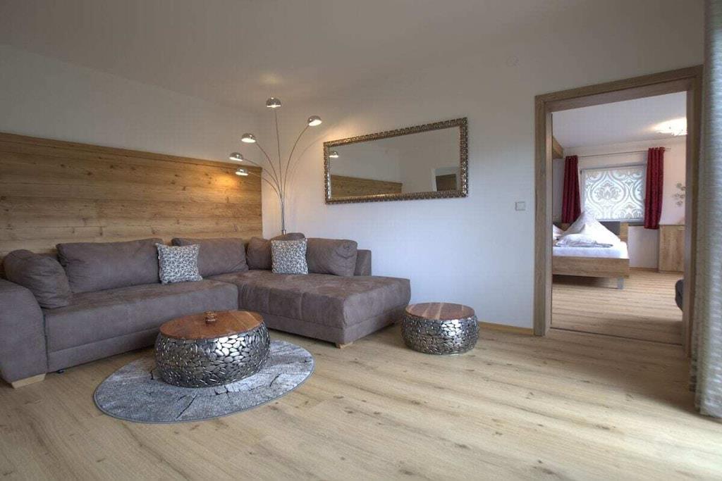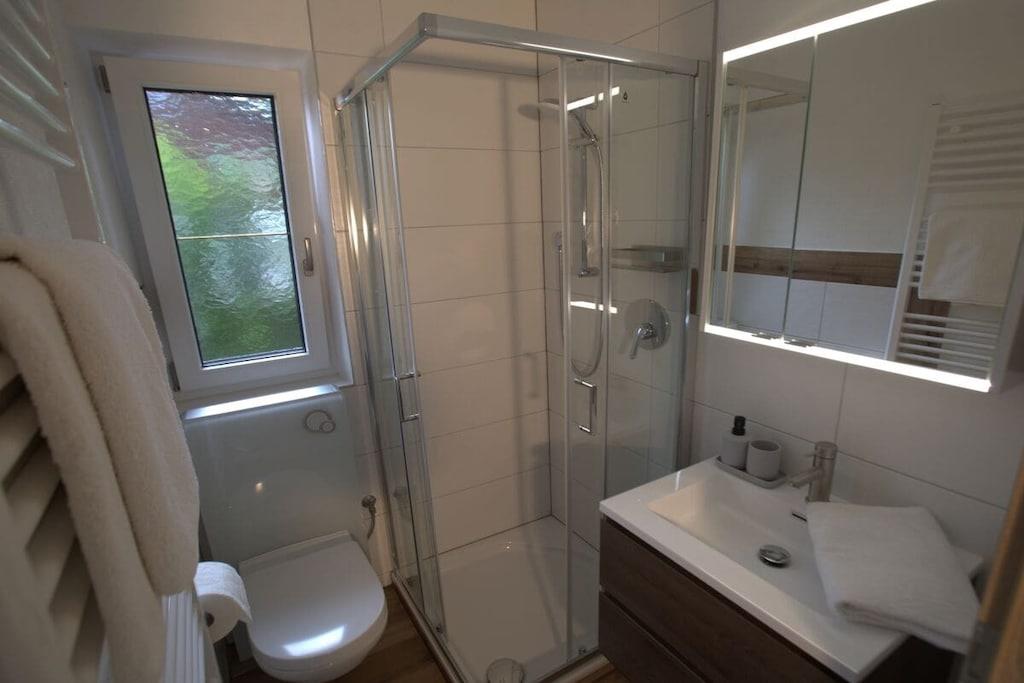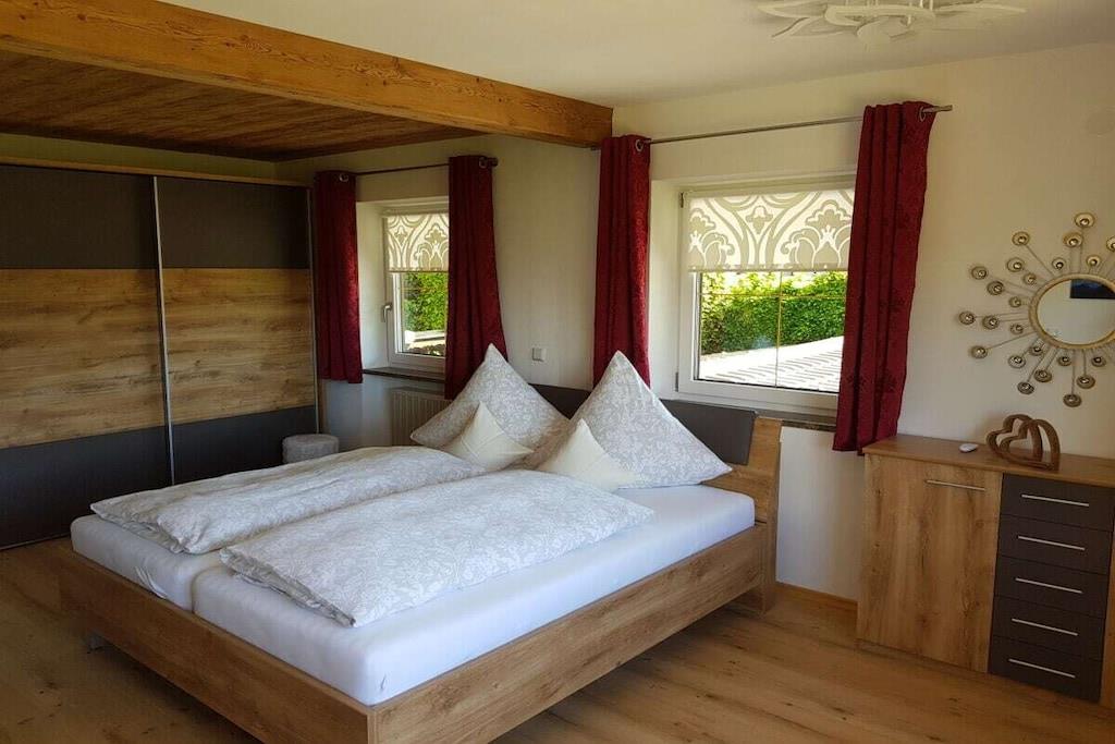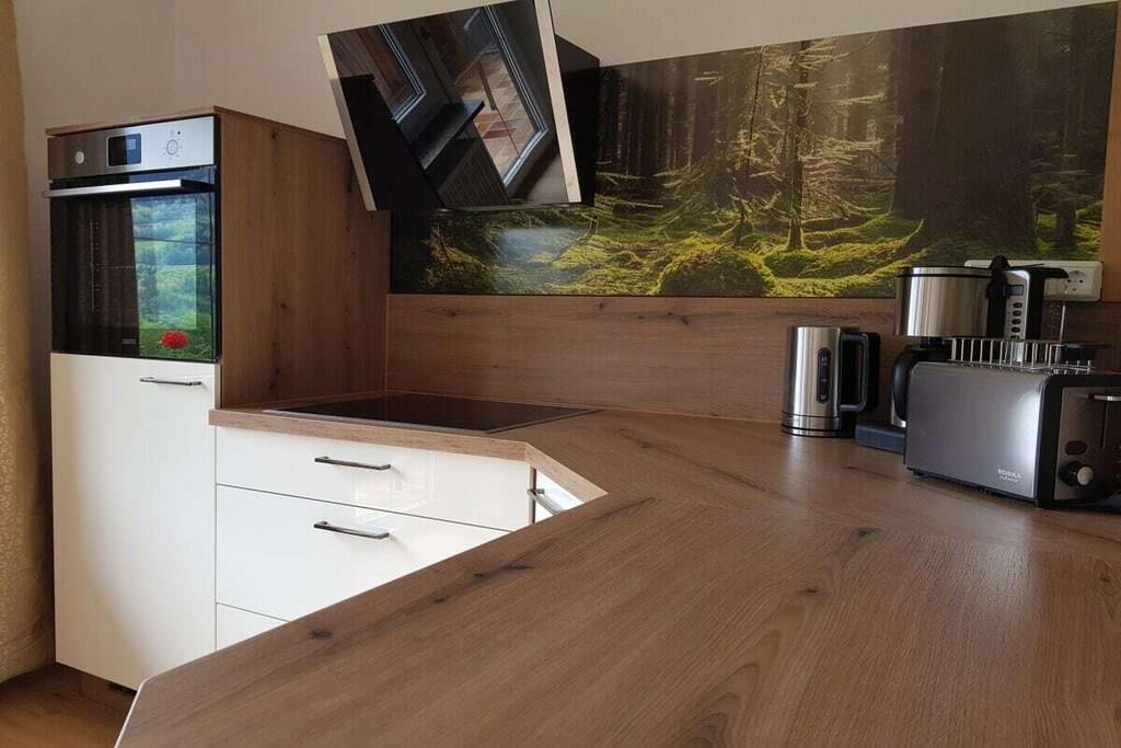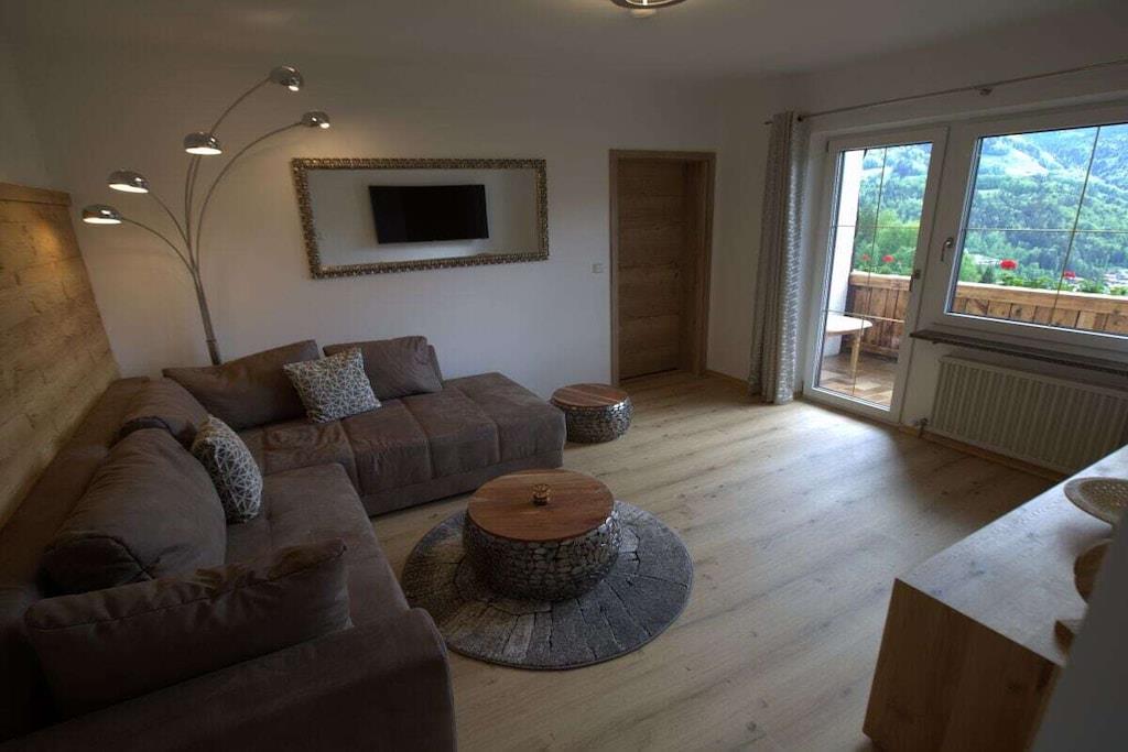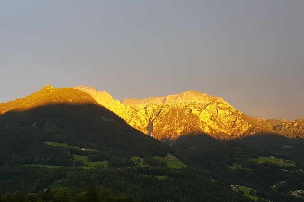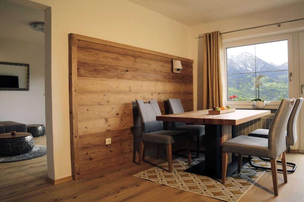 Alle Zimmer unserer liebevoll eingerichteten Ferienwohnung liegen zur Südseite mit einzigartigem Panoramablick auf die Berchtesgadener Berge. Zur Ausstattung gehören ein gemütliches Wohnzimmer mit ausziehbarer Eckcouch, ein Schlafzimmer mit Doppelbett und separatem gr. Schlafsessel, ein Badezimmer mit Dusche/WC, separates WC, eine vollausgestattete Einbauküche mit vielen Extras wie z. B. Spülmaschine, Toaster, Backofen, Ceranfeld, Kaffeemaschine, ein schönes Esszimmer, ein kl. Waschraum mit Waschmaschine, Trockner, Bügelbrett und Bügeleisen, sowie ein gr. Südbalkon mit Sitzgelegenheit und Liegestühlen.