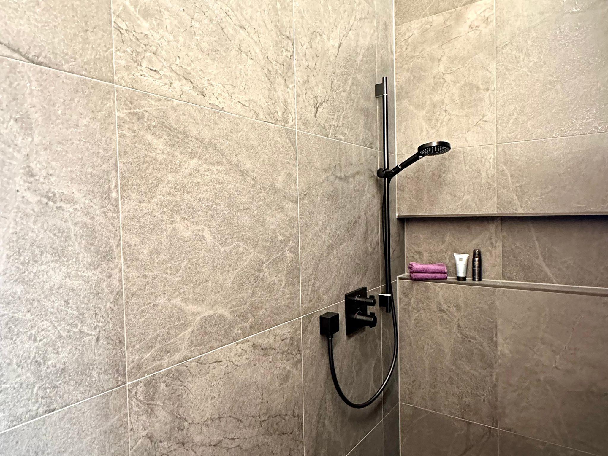 Das Badezimmer ist mit einer ebenerdigen Dusche mit Regendusche ausgestattet.