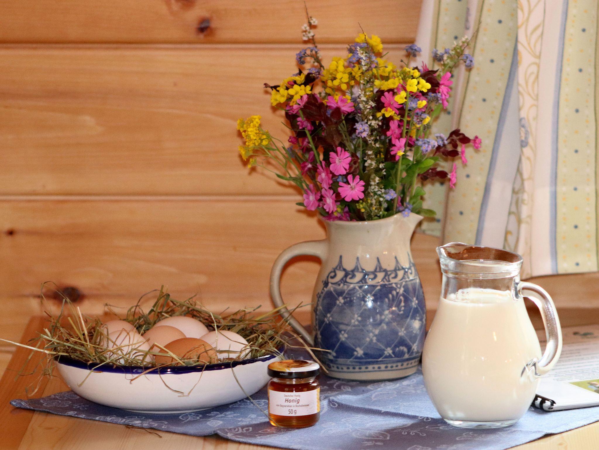Wir sind ein kinderfreundlicher Bio-Bauernhof mit Kühen, Kälbern, Hasen, Zwergesel, Honigbienen, Zwergziegen, Katzen und Hühner mit Gockel, umgeben von Wiesen und Wäldern am Fuße der Schlafenden Hexe. Ruhige, sonnige Lage, Gartenanlage mit Liegestühlen. Spielwiese mit Schaukel, Rutsche, Wippe, Sandkasten und Fuhpark. Grillplatz und Tischtennis. Umfangreiche Babyausstattung: Kinderbett, Hochstuhl, Badewanne, Windeleimer, Fläschchenwärmer, Unterlage, Brötchenservice. Zustellbetten für Kinder auf Anfrage möglich. Gerne können Sie Ihre Wäsche im Waschraum (Waschmaschine, Wäschetrockner) waschen. Ein Staubsauger oder Putzutensilien stehen unseren Gästen auch zur Verfügung.