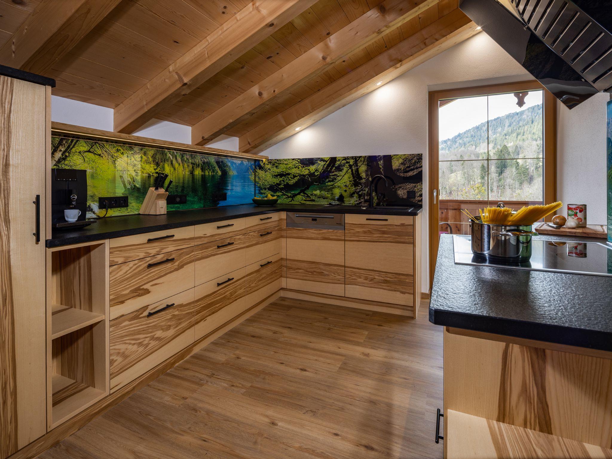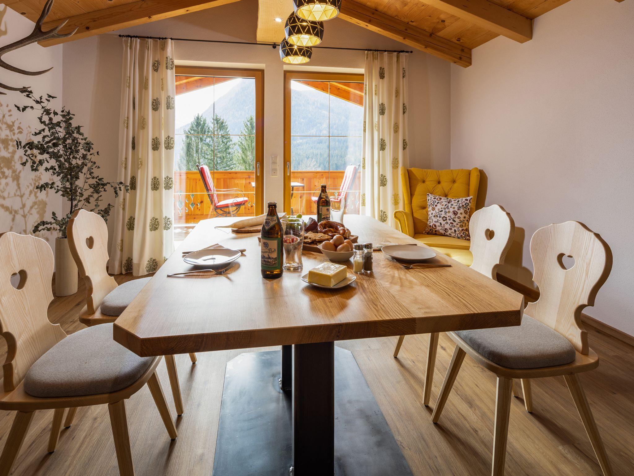 Das luxuriöse Chalet Apartment Himmelszelt bietet auf 80qm einen Hauch von Luxus für 2 Personen.Dieses mit viel Liebe eingerichtete Apartment befindet sich im 2. Obergeschoß mit Sichtdachstuhl, großem Balkon mit Sitzlounge und Essbereich im Freien nach Süden ausgerichtet.Das Schlafzimmer ist gen Osten ausgerichtet – hier können Sie die frische Morgenluft und den Sonnenaufgang vom Balkon aus genießen – mit Blick auf den Kehlstein und die angrenzende r geräumige Wohnbereich mit offener Küche und gemütlicher Kuschelecke lädt zum Verweilen und Entspannen ein. Wir haben natürlich hochwertige Materialien wie Steinerloden und Schreinermöbel verwendet und mit viel Herzblut Farben und Stoffe ausgesucht.Das Badezimmer ist nach Westen gelegt und hat ebenfalls einen direkten Balkonzugang mit Sitzgelegenheit.80 qm Wohnfläche, exklusiv für 2 PersonenSchlafzimmer: großes Doppelbett , Balkonzugang, Sat TV, Safe, zertifizierte Feder und Daunenkissen, Matratzen aus Österreichgroßzügiger offener Wohn-/ Essbereich mit Panoramaverglasung , 55? Sat-TV, gemütliches Sofakomplett ausgestattete Schreinerküche mit E-Herd und Backofen von Miele, Kühlschrank mit Gefrierfach von Liebherr , Geschirrspüler, Jura-Kaffeevollautomat, Wasserkocher, Eierkocher, MilchaufschäumerGeschirr und Gläser, Salz, PfefferHand-, Bade- und Geschirrtücher und Bettwäsche vorhandenBademäntelkostenloses WLANGroßer Süd-Balkon mit Loungesessel, Essbereich mit herrlichem Blick auf Berge und die umliegende NaturBadezimmer mit edlem Duschbereich, Regendusche, Balkonzugang, Bademäntel, Föhn, Schminkspiegel, Radio und Handtuchwärmerhochwertige Naturkosmetik von Chiemsee LiebeBalkon nach Osten mit Sitzmöglichkeit für den MorgenkaffeeGemütlicher Relaxsessel im Wohnbereich sorgt für einen zusätzlichen Hauch von Luxus.
