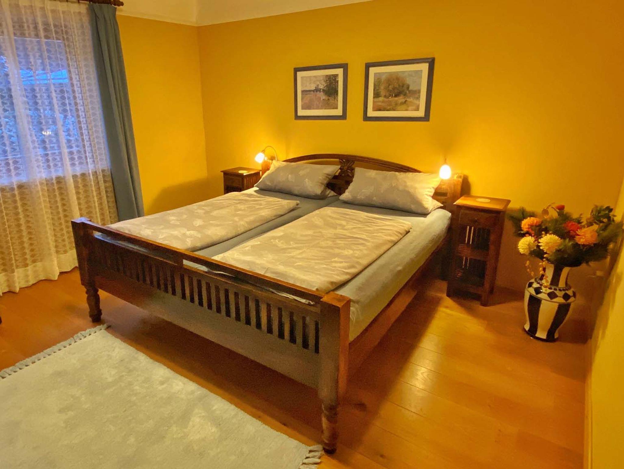 Nichtraucher-Ferienwohnung mit ca. 52 qm, Erdgeschoss1 Schlafzimmer mit Doppelbett, ggf. Kindergitterbett und Kinder-Reisebett; Wohnzimmer mit Ausziehcouch; separate Zweizeiler-Küche mit üblichen Zusatzgeräten; Dusche/WC; große, teilüberdachte Terrasse und Liegewiese.