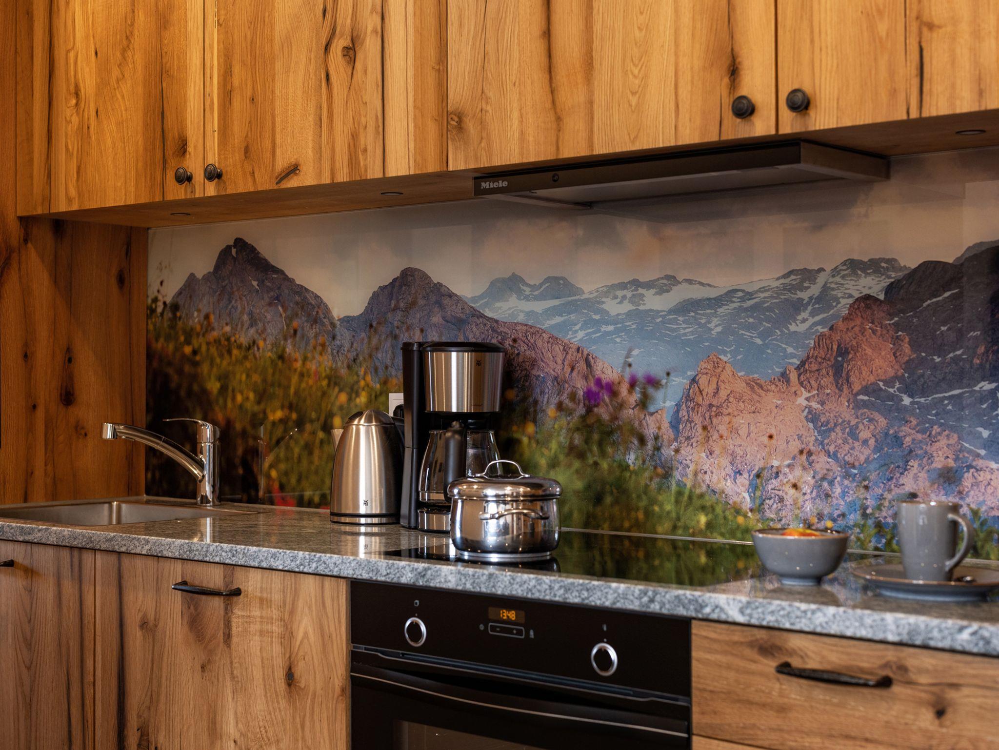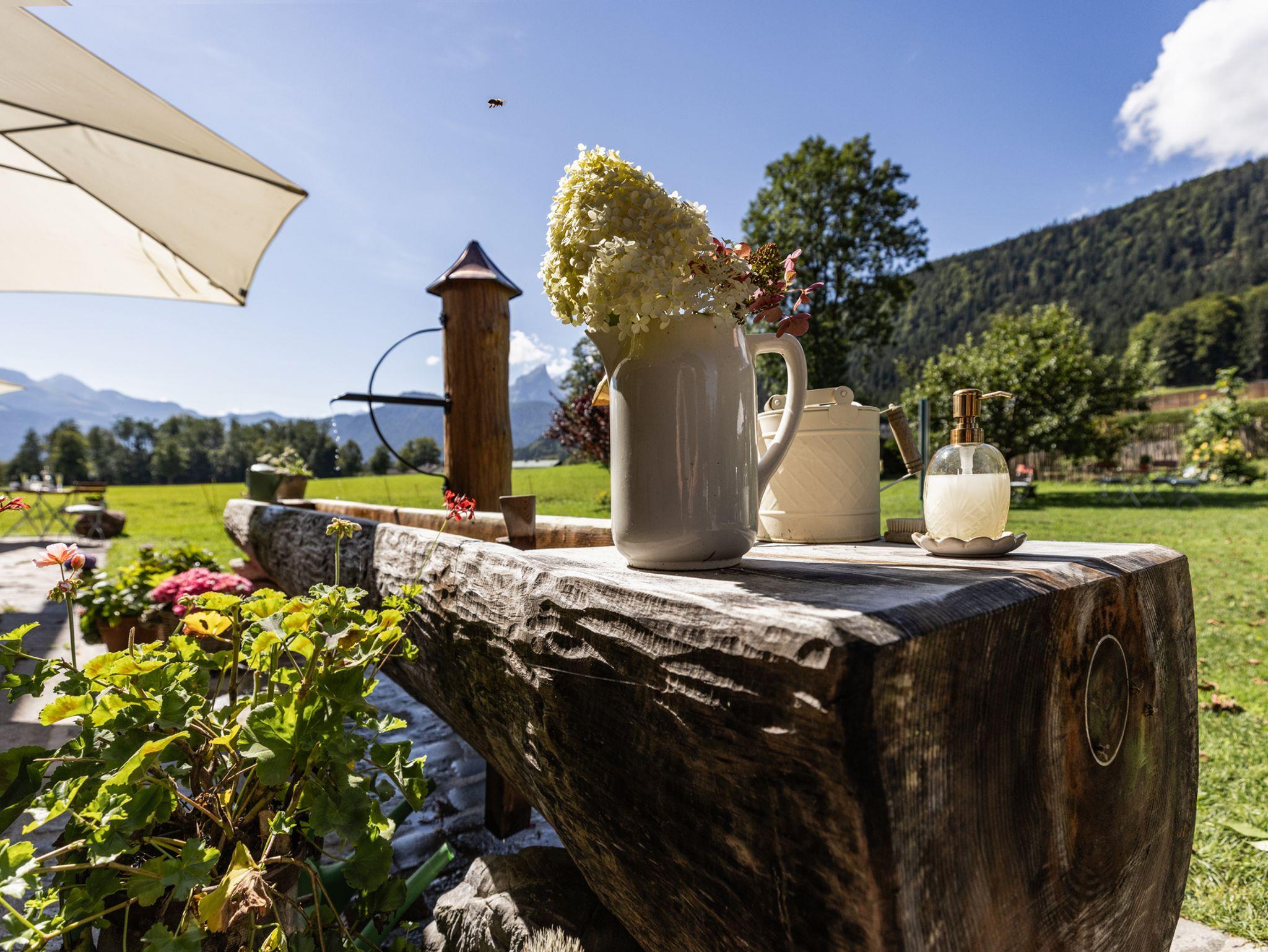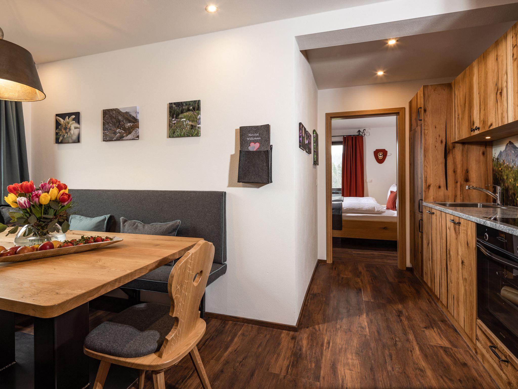 Sie suchen Erholung in einer Ferienwohnung, die komplett ausgestattet ist, bei traumhaftem Bergpanorama inmitten der Natur liegt und von der aus Sie ideal Ihre Ausflugsziele erreichen? Dann sind Sie bei uns richtig!Unsere Ferienwohnung Alpendistel eignet sich perfekt für den Urlaub als Familie oder mit Freunden und bietet für Sie:- Verfügbarkeit bis zu 6 Personen- zwei Balkone mit herrlichem Bergblick- zwei separate Schlafräume mit Massivholzbetten und jeweils einer bequemen Schlafcouch und Flachbildfernseher- zwei separate Badezimmer mit Regendusche- eine komplett ausgestattete Küchenzeile mit Herd, Backofen, Kühlschrank, Geschirrspülmaschine, Kaffeemaschine, Wasserkocher und Toaster- eine gemeinsame Wohnstube mit gemütlicher Eckbank- eine Fußbodenheizung, die für angenehme Wärme sorgt- kostenlose WLAN-Nutzung- Hand- und Geschirrtücher, sowie Bettwäsche- Wäscheständer und Bügelbrett, sowie Wäscheservice auf Anfrage- täglicher Semmelservice und großzügige Getränkeauswahl im Haus- wöchentlicher WäschewechselAlle Möbel wurden exklusiv von einer heimischen Schreinerei gefertigt.