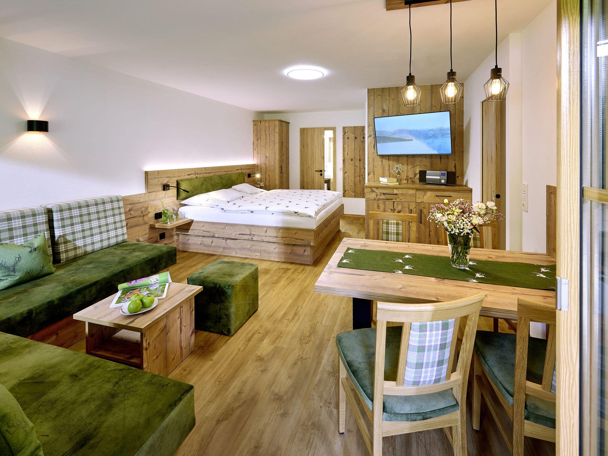 Mit viel Liebe haben wir versucht, eine gemütliche Atmosphäre zu schaffen, damit sie sich wohl fühlen. In dem großen Wohn-/Schlafraum können Sie erholsame Nächte genießen, bei einem Frühstück gestärkt in den Tag starten und abends auf der gemütlichen Couch den Urlaubstag ausklingen lassen.
