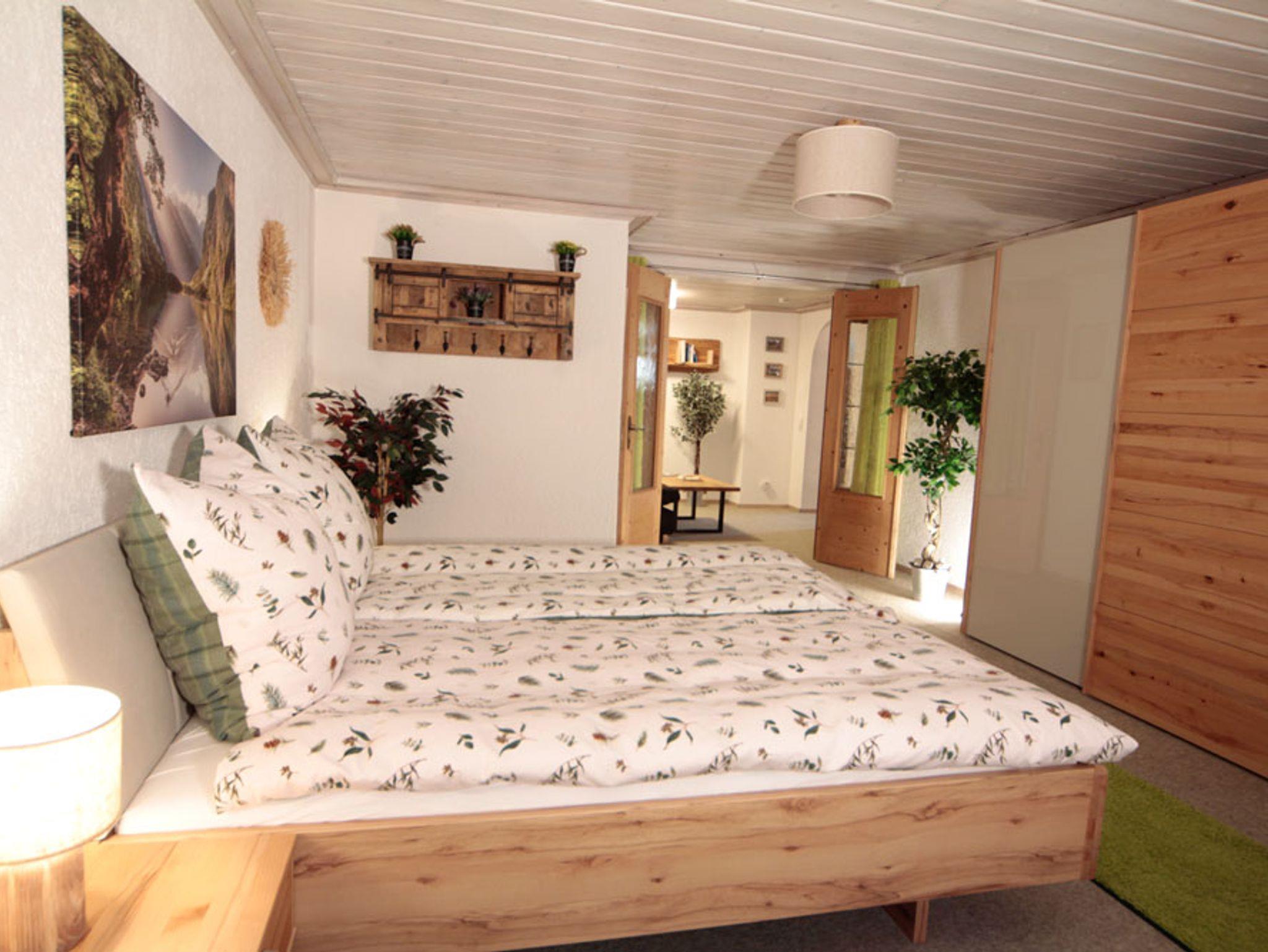 Lesezimmer mit ausziehbarer Couch und Holztisch. Schlafzimmer mit Doppelbett, Lattenrost mit verstellbarem Fuß- und Kopfteil, 3-türiger Schiebetürenschrank Massivholz. Kostenloses WLAN, elektrischer Schlüsselsafe