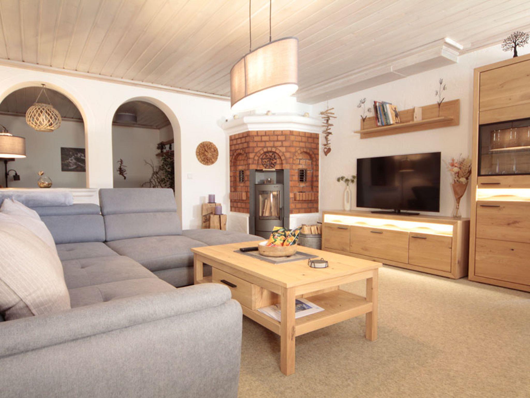 Geräumig ausgestattetes Wohnzimmer mit Wohnlandschaft, hochwertiger Nadelfilzboden, antibakteriell, antistatisch und wärmend, LED-Beleuchtung, Holzschwedenofen und Plasma-TV 55 Zoll.