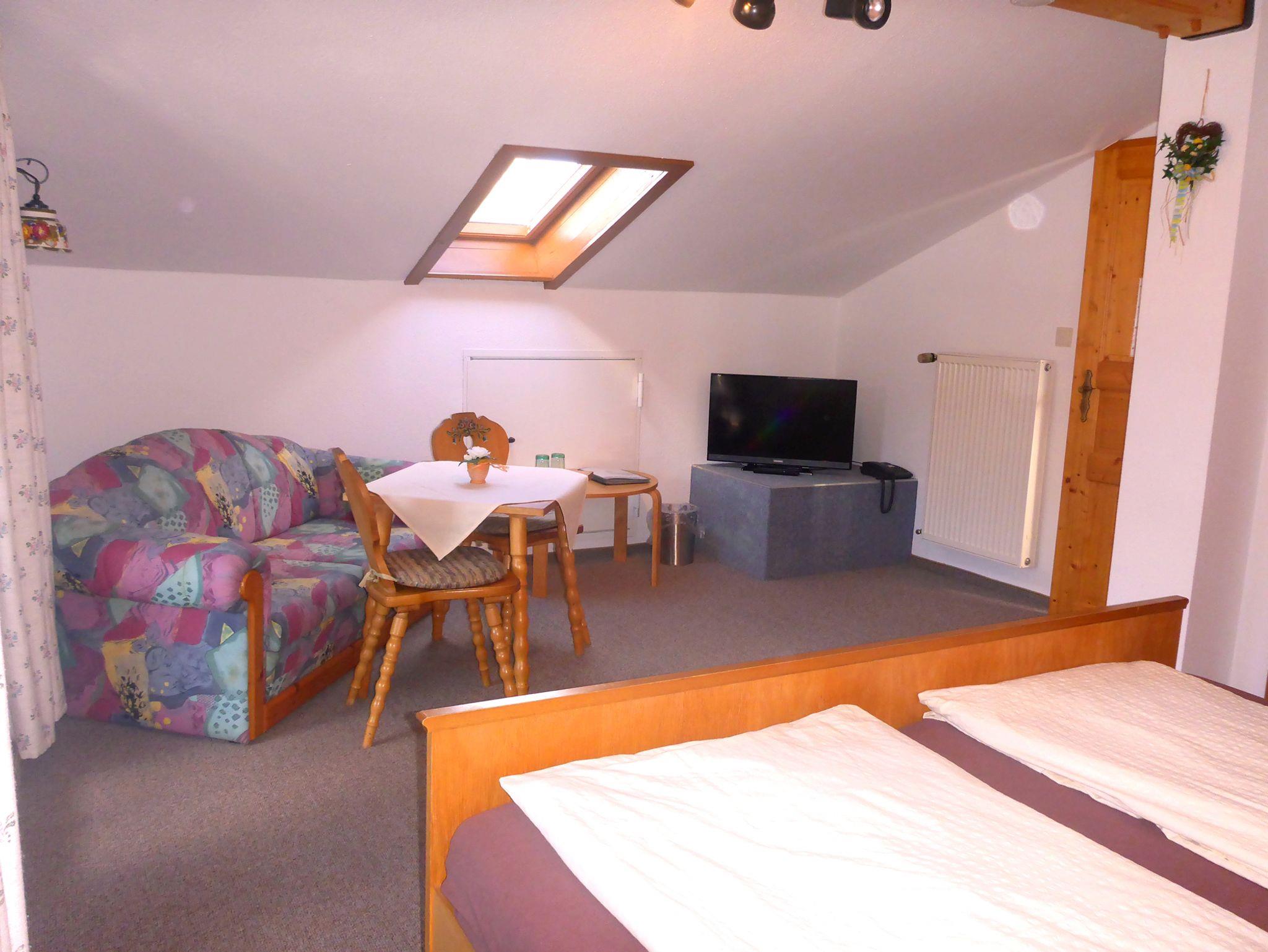 Familienzimmer mit eigenem Aufgang, kleiner Flur, 1 Schlafzimmer mit Doppelbett und 1 Kinder-Schlafzimmer mit französischem Bett (leichte Mansarde), ausziehbares Sofa, Balkon, Bad mit Dusch-Badewanne und WC.