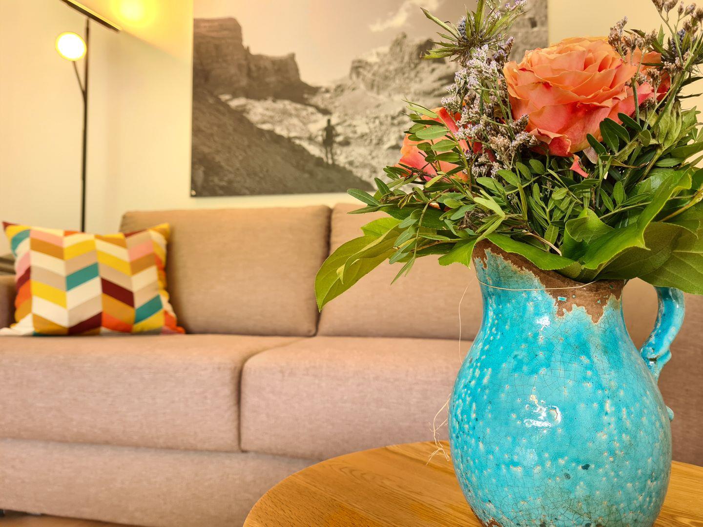 Die warmen Sonnenstrahlen fallen durch die große Fensterfront in die Wohnung und tauchen den gesamten Raum in helles Licht. Genießen Sie Ihren Urlaub in