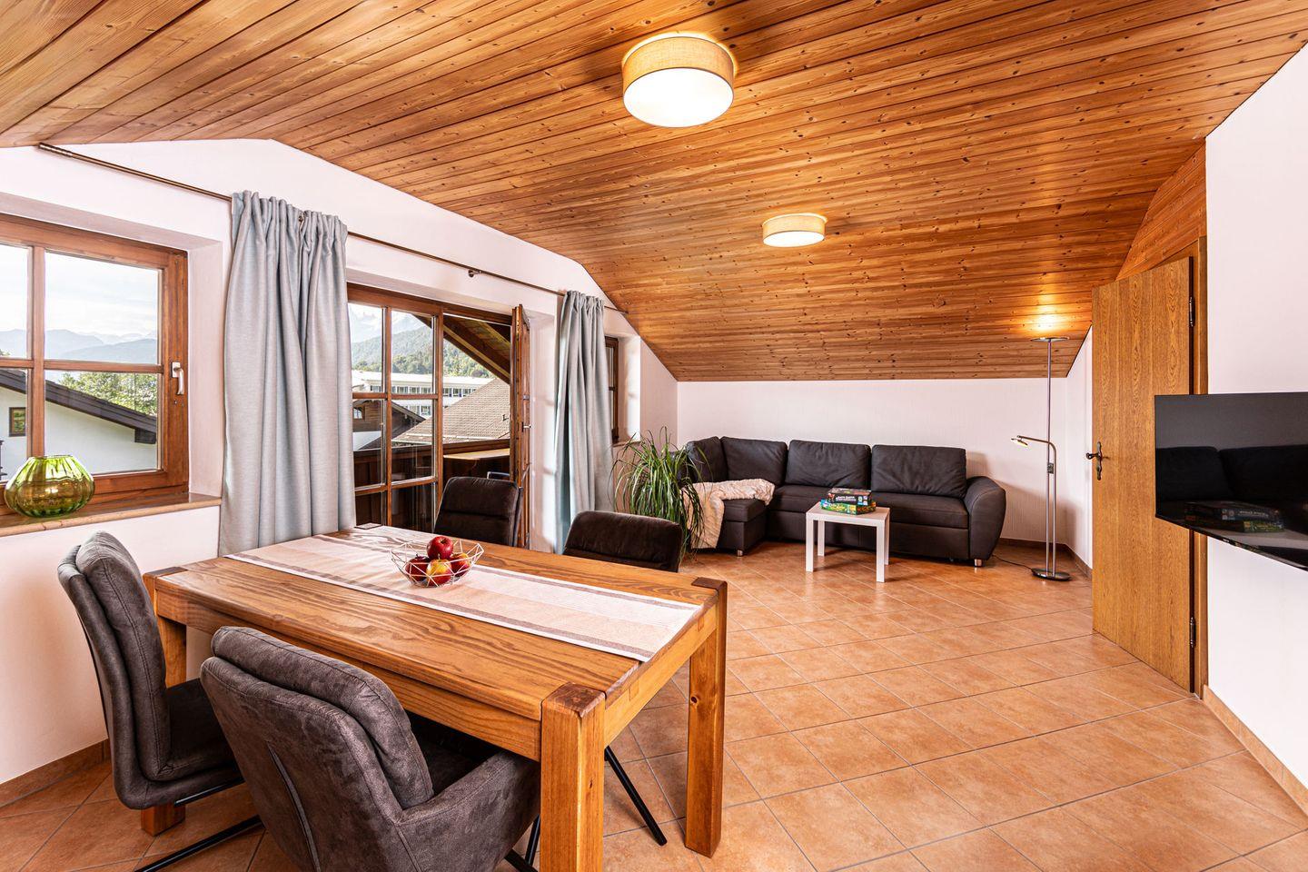 Die kürzlich teilrenovierte Ferienwohnung "Watzmann Family" ist für eine Familie mit zwei Erwachsenen und einem Kind geeignet. Das in 2024 neu möblierte Wohnzimmer mit Esstisch und Sofa lädt zum gemeinsamen Essen ein. Genießen Sie von Ihrem Balkon den umwerfenden Bergblick auf die Berchtesgadener Alpen inkl. Watzmann. Die neue separate Küche ist mit allen notwendigen Utensilien, Senso Kaffeemaschine und Spülmaschine ausgestattet. Das Badezimmer mit Tageslicht bietet eine Dusche, WC und Bidet.