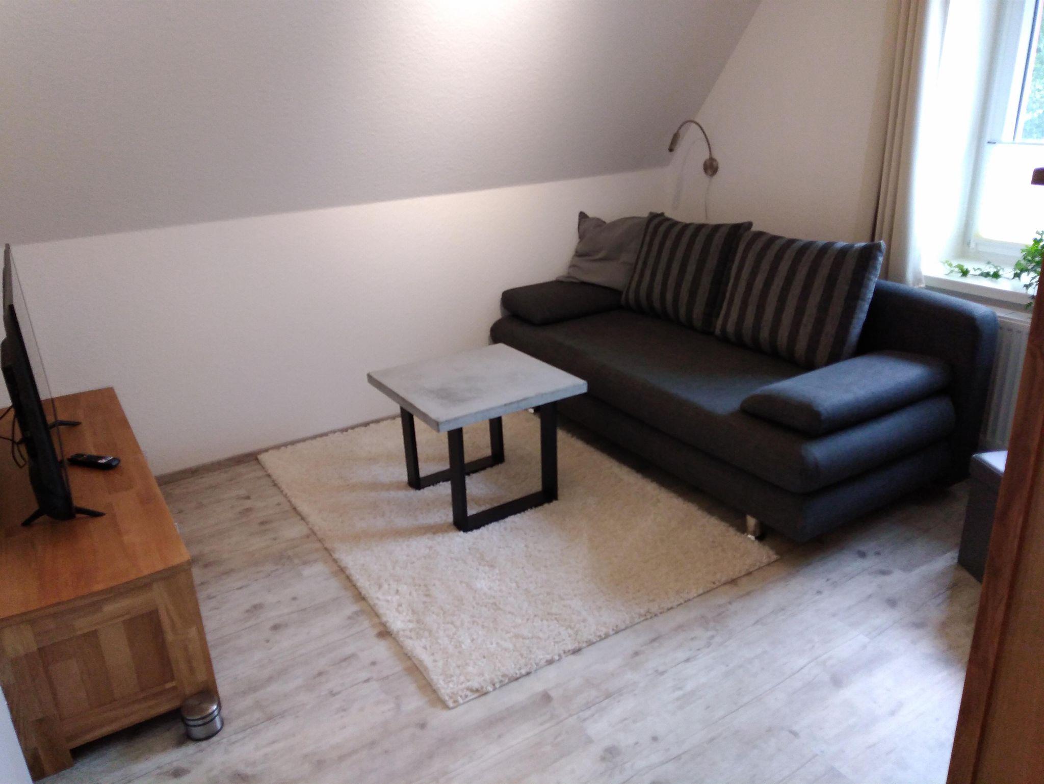 1 großer Raum mit Küche, übergehend ins Wohnzimmer, in dem sich auch noch ein großes Schlafsofa befindet.
