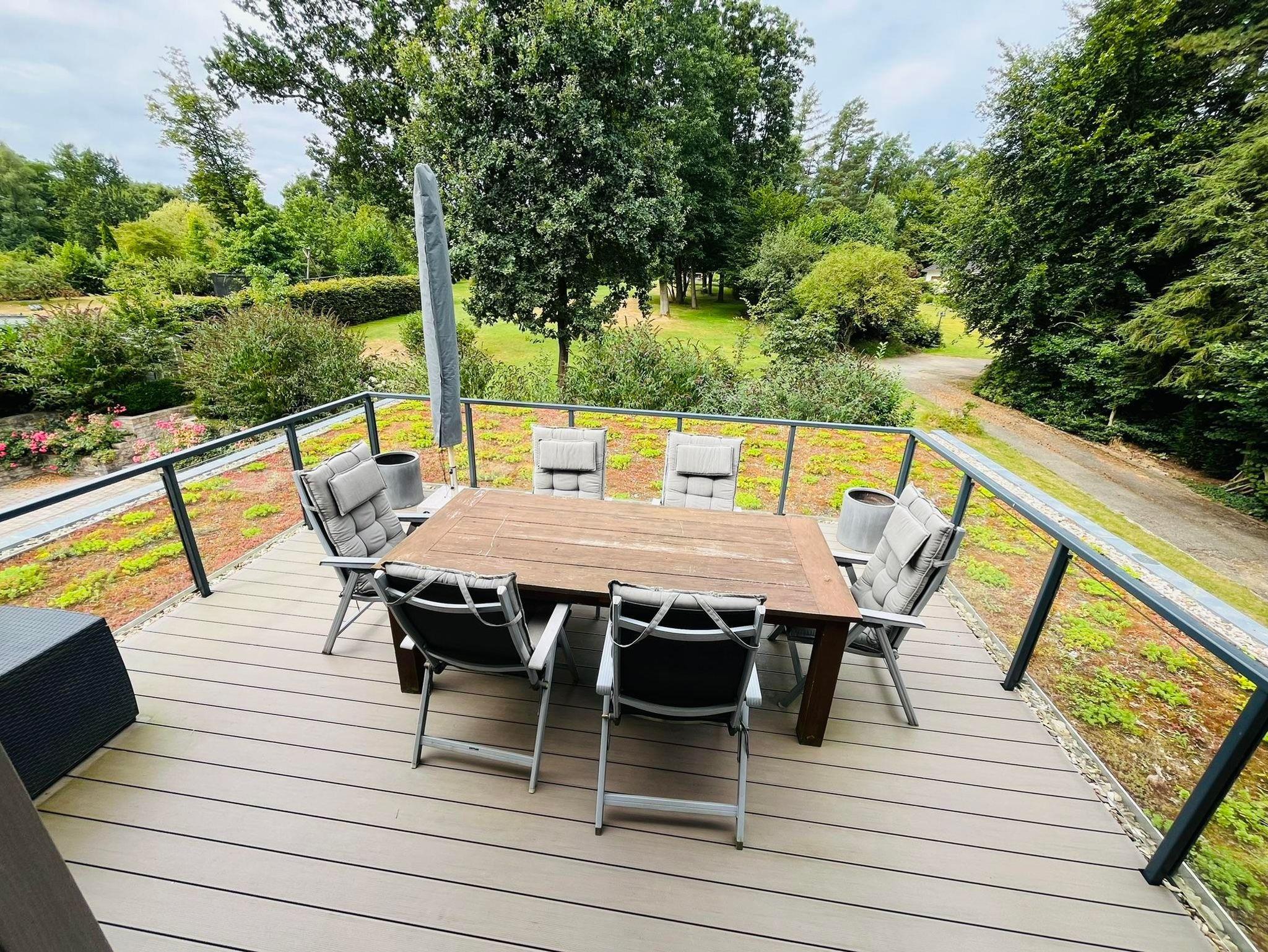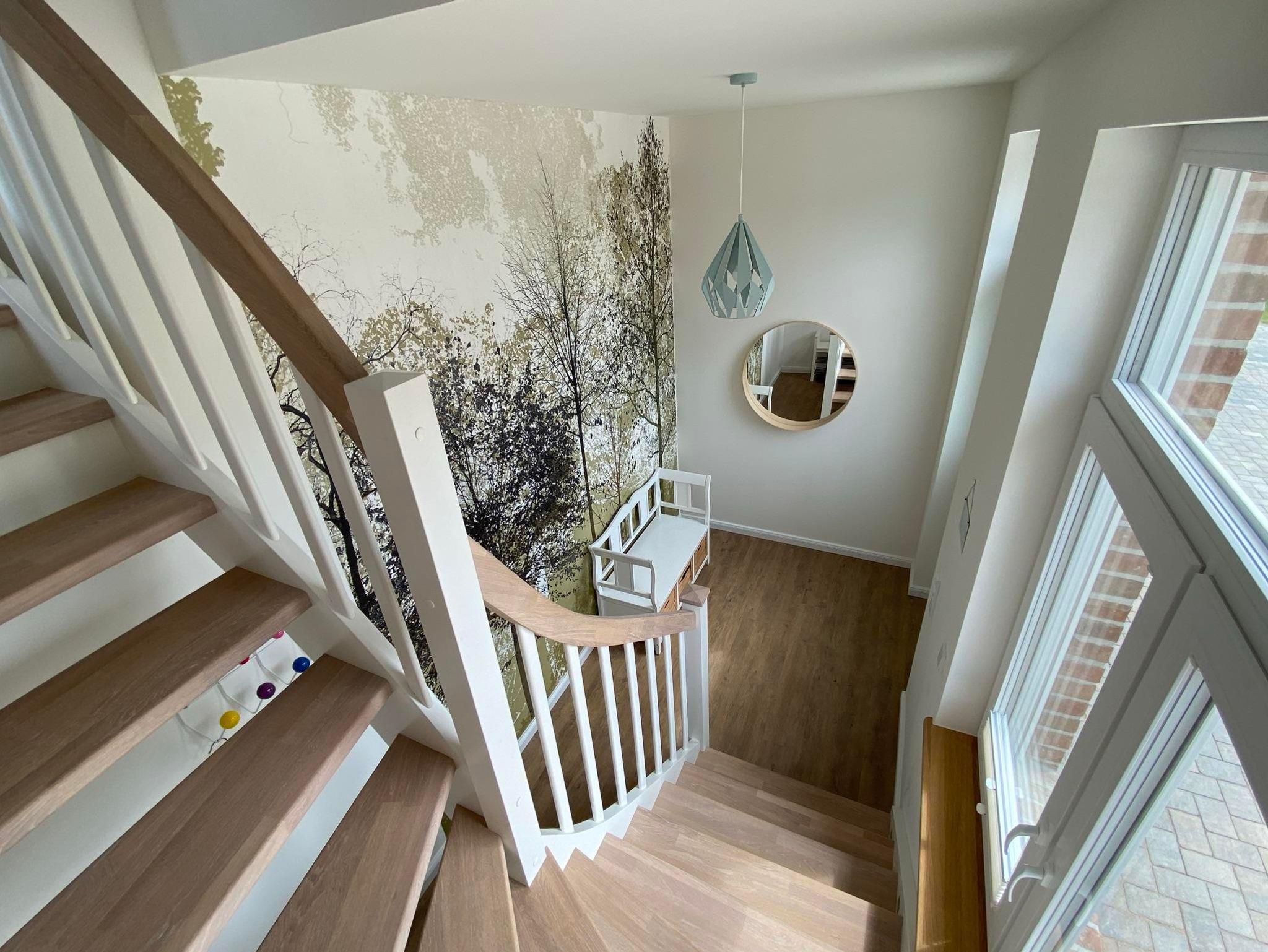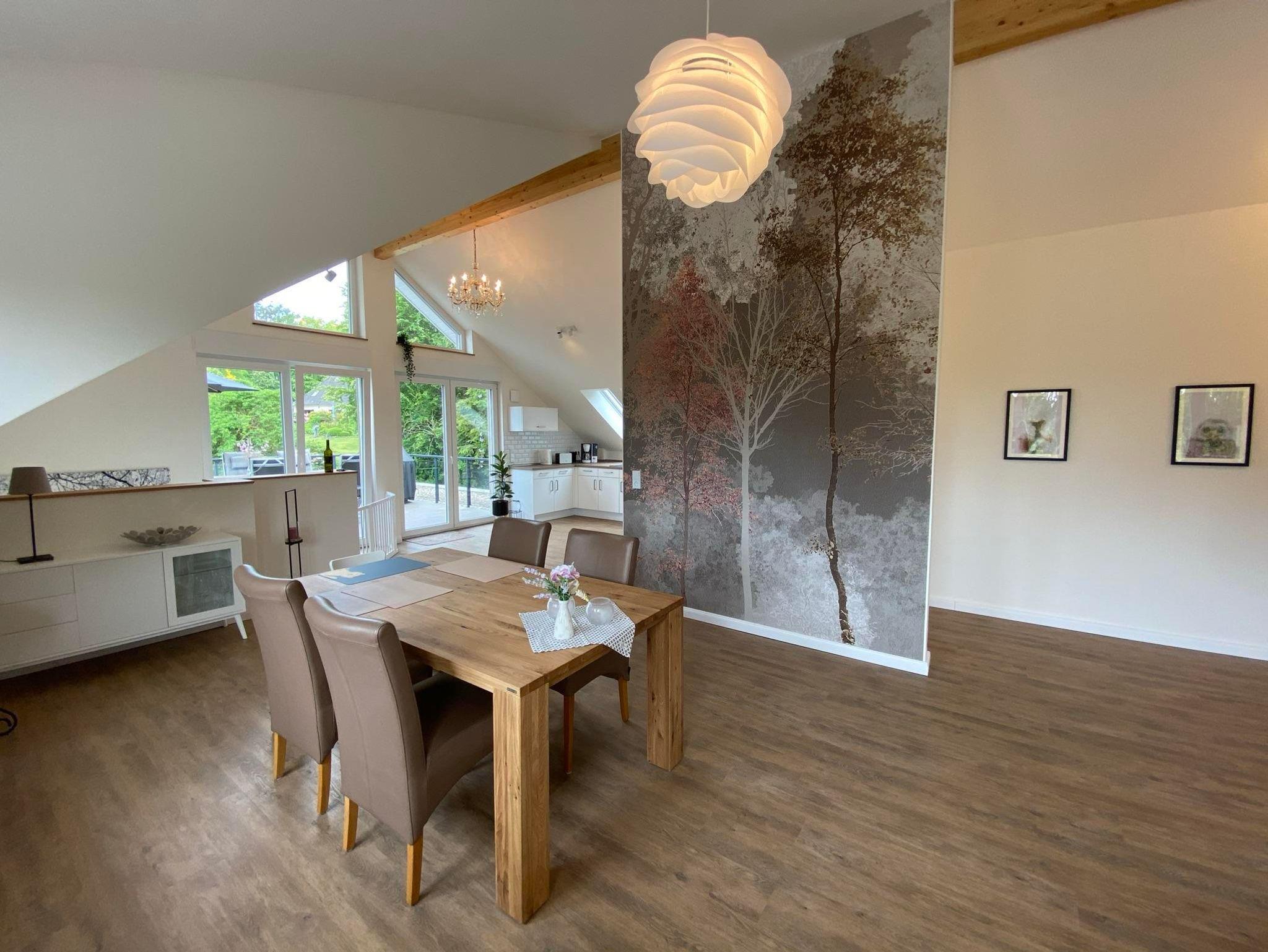 Die 2021 neu gebaute Ferienwohnung hat eine Größe von 100qm und liegt im Obergeschoss. Über den Eingangsbereich mit Garderobe im Erdgeschoss gelangen Sie über eine Holztreppe ins helle und lichtdurchflute Obergeschoss. Dort betreten Sie direkt den offenen und sehr großzügigen Wohn-, Ess- und Kochbereich mit seinen bis zu 4m hohen Decken. Die voll ausgestattete Küche und der große Esstisch ermöglichen Ihnen eine komfortable und kulinarische Versorgung während Ihres Aufenthalts. Der Wohnbereich mit Sofa und Sesseln lädt zur Entspannung ein. Auf der 21qm großen Süd-West-Dachterrasse mit umgebendem Gründach können Sie die Sonne genießen. Der große Außentisch lädt zum gemütlichen Beisammensein ein.