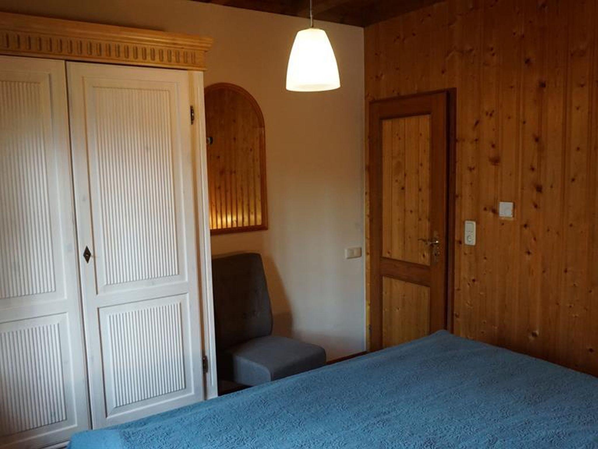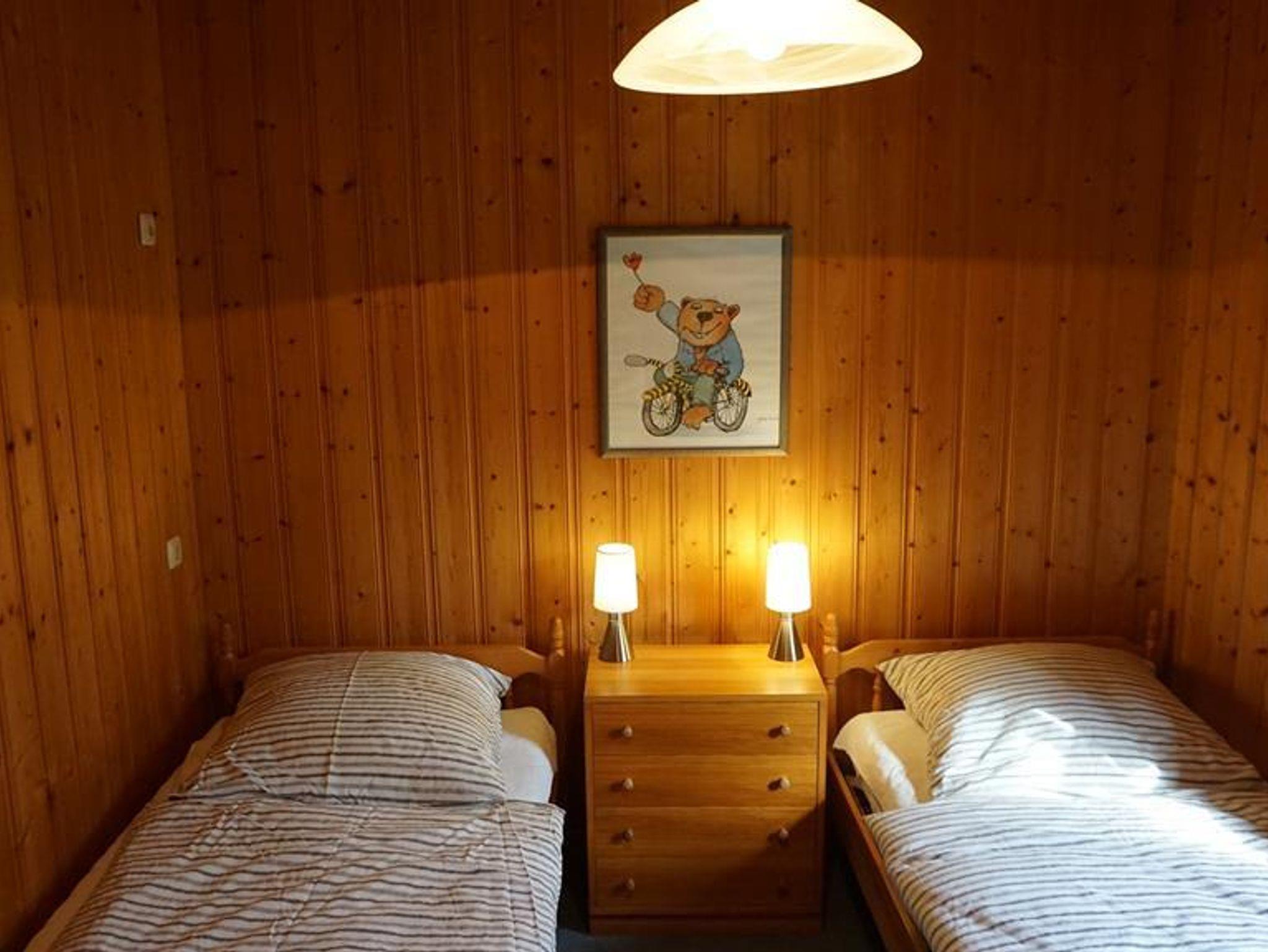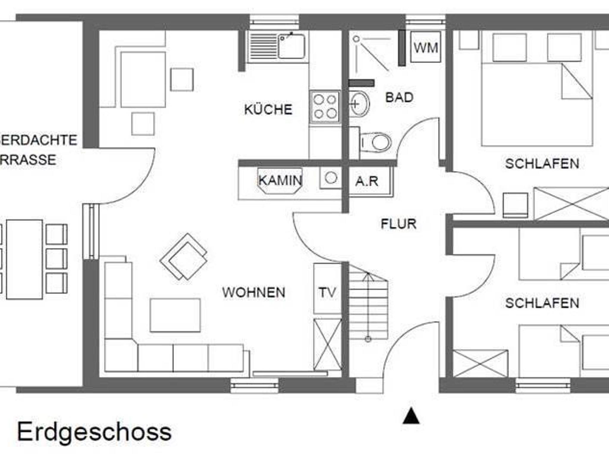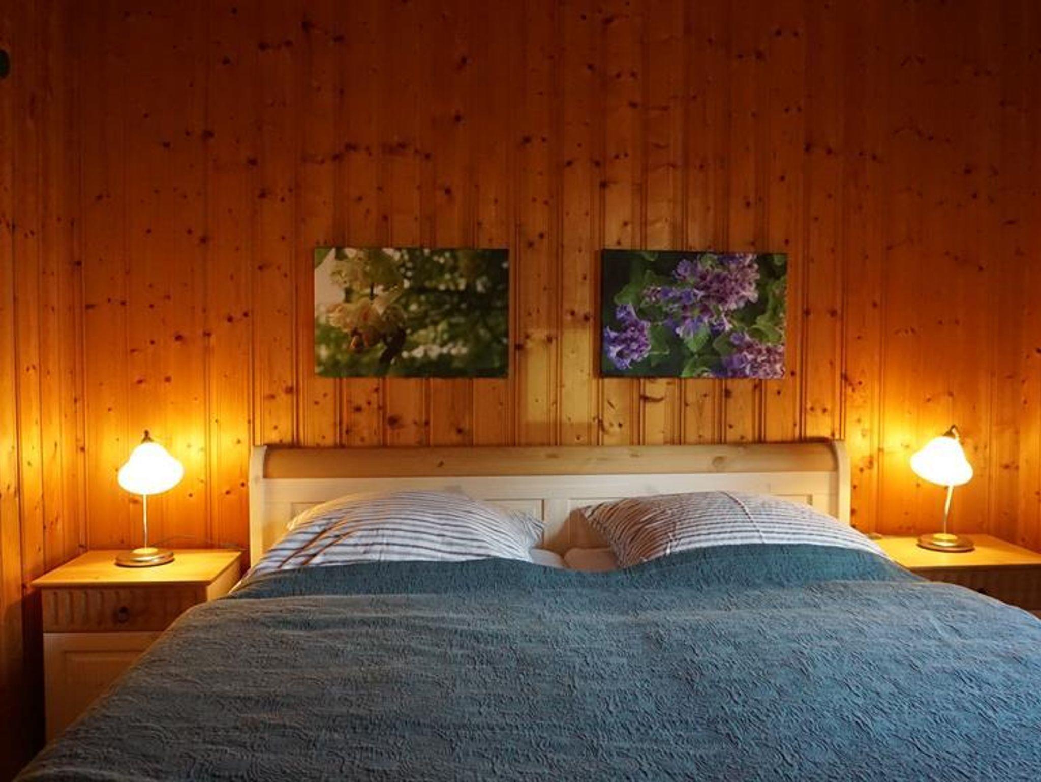 Im Erdgeschoß kommt man in einen Flur, links gelangt man in einen großen Wohnraum mit Kamin und Fernseher, einer gemütlichen Essecke und einer voll eingerichteten Küche mit Geschirrspüler. Die Terrassentür führt zu einer großen überdachten Terrasse, die mit Gartenmöbeln bestückt ist und einen Ausblick auf Feld und Wald bietet. Auf der rechten Seite vom Flur gelangt man in 2 Schlafräume (ein Schlafraum mit Doppelbett und ein Schlafraum mit 2 Einzelbetten). Desweiteren befindet sich im Erdgeschoss ein Bad. Ein kleiner Abstellraum ist ebenfalls vorhanden sowie eine Waschmaschine. Im Dachgeschoß befinden sich zwei weitere Schlafräume mit je einem Doppelbett, ein Bad mit Toilette und Waschtisch. Kinderbetten sind vorhanden.