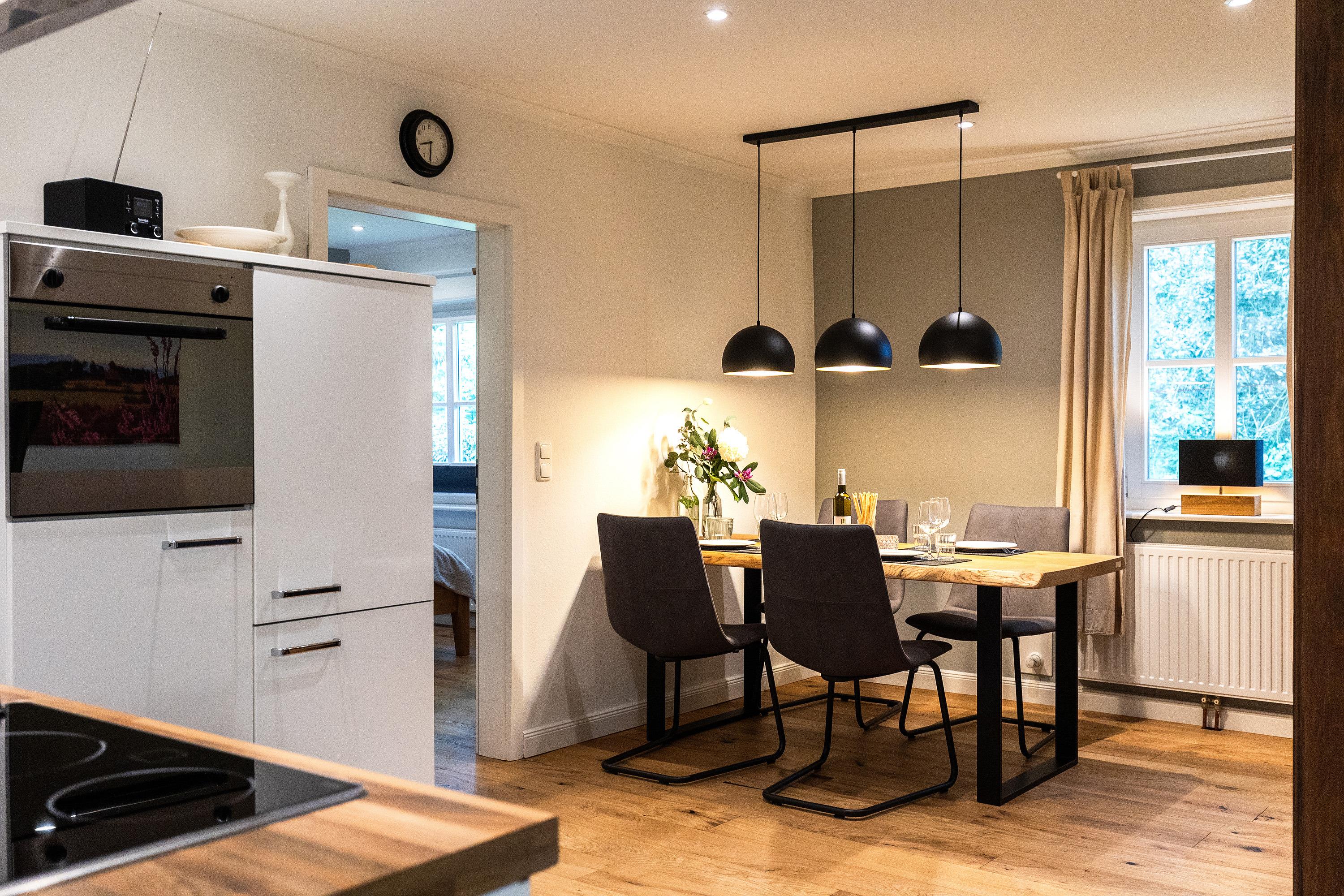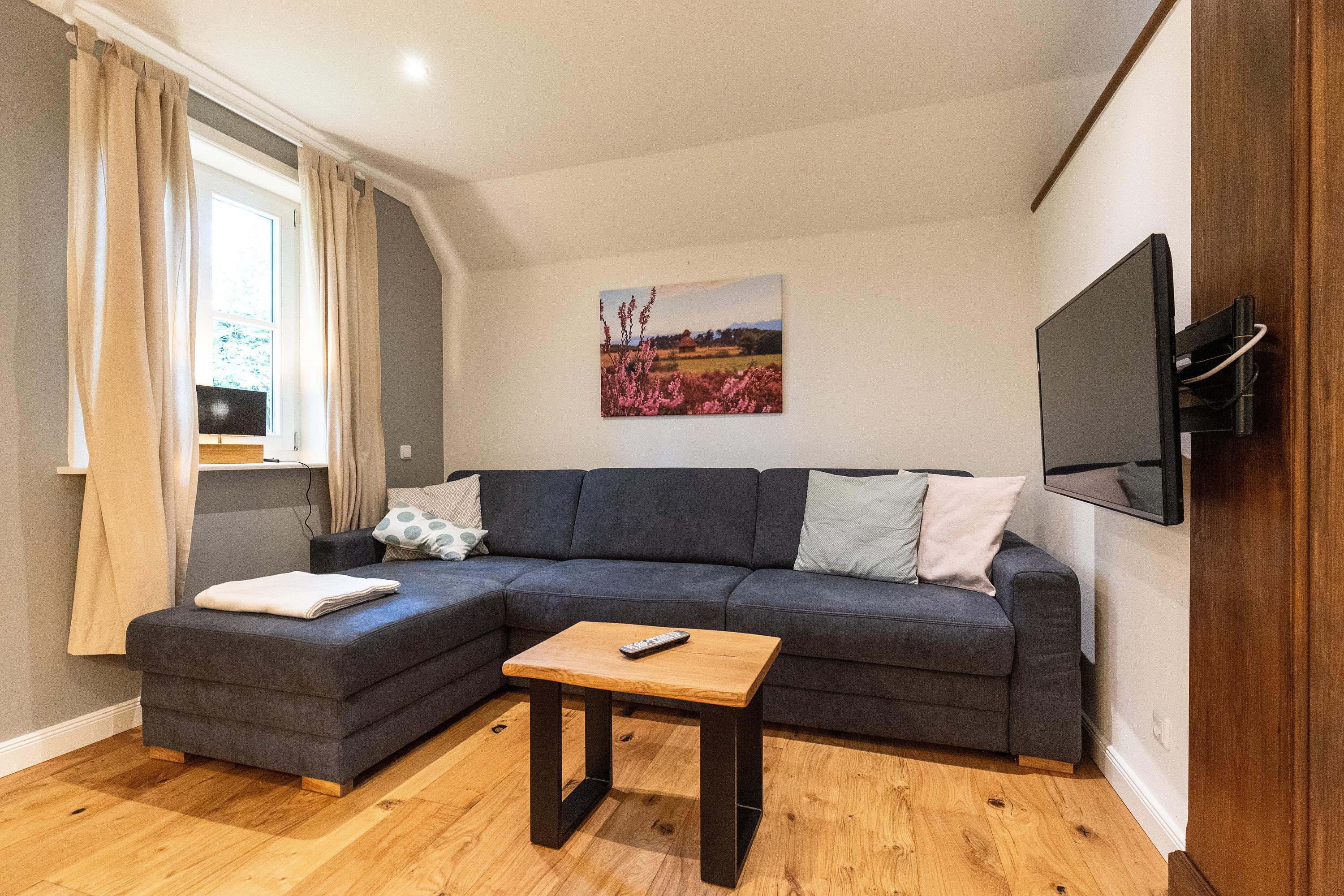 Das Reetdachhaus war das ehemalige Arbeiterhaus Hüßelhus (Häusslingshaus) des Hofes, wo bis Ende der 60er Jahre noch der Hüßel mit seiner Familie und seinen eigenen Tieren gelebt hat. Seid 1971 befinden sich in diesem Haus zwei Ferienwohnungen, die sich heute zu zwei wunderschönen, modernen Landhauswohnungen gewandelt haben. Jeder Doppelhaushälfte steht ein eigener abgeschlossener Garten mit Terrasse zur Verfügung. Die Wohnungen haben in 2 Schlafzimmern Platz für 4 Personen und verfügen über eine Schlafcouch im Wohnzimmer. Parken können Sie direkt vor dem Haus.