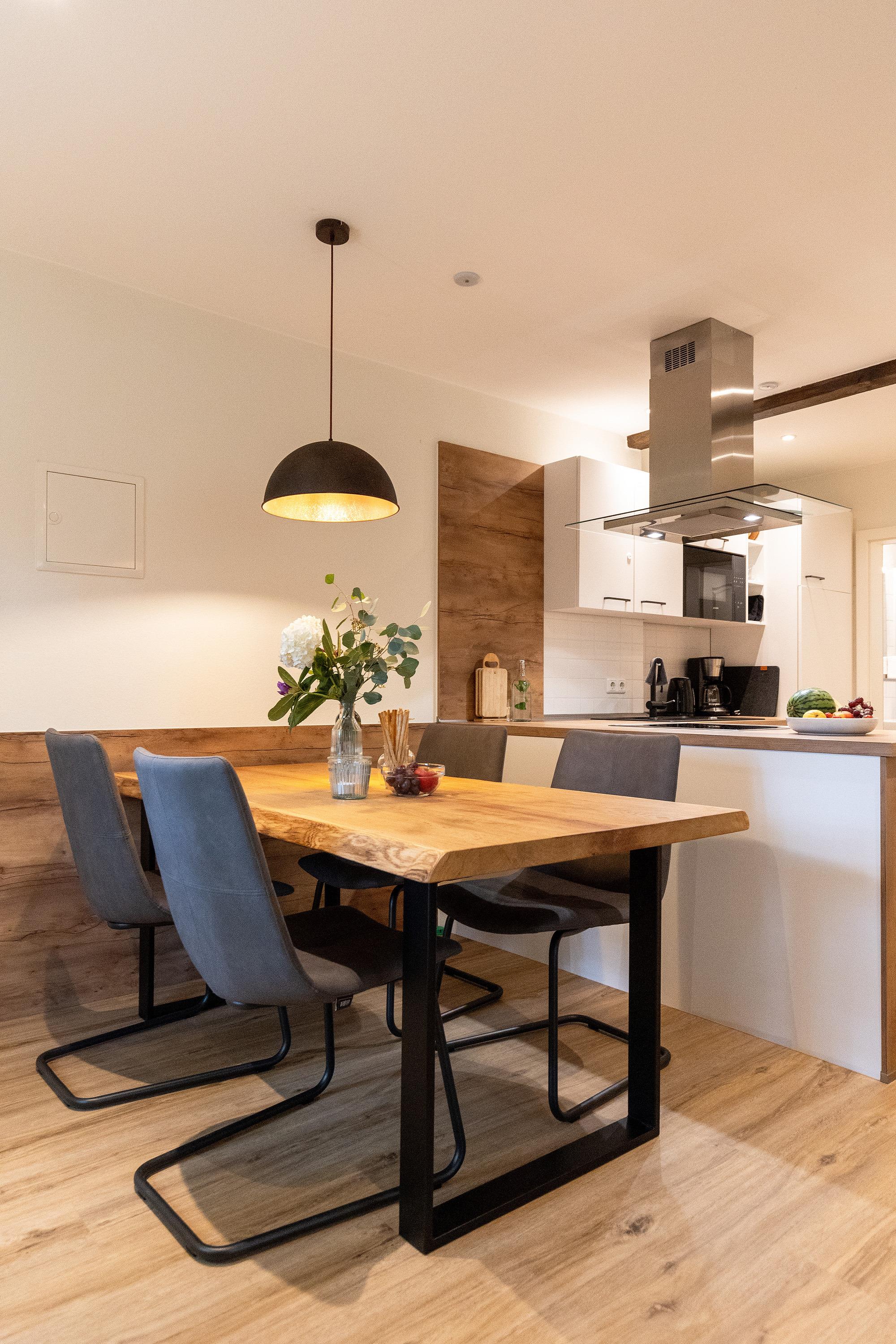 Das Fachwerkhaus war der alte Kuhstall des Hofes, der Anfang der 70er Jahre von der Hofmitte ab- und hier wiederaufgebaut wurde. Anfangs ungenutzt, sind hier seit 1974 vier Ferienwohnungen beheimatet die liebevoll im Landhausstil eingerichtet sind und regelmäßig renoviert werden. Die Wohnungen unten bieten je Platz für bis 6 Personen mit Nutzung Schlafcouch, und die gemütlichen oberen Wohnungen je bis 4Personen mit Nutzung Schlafcouch. Zur Verfügung stehen 2 Terrassen sowie ein Garten mit ausreichend Sitzmöglichkeiten. Parkplätze befinden sich direkt vor dem Haus.