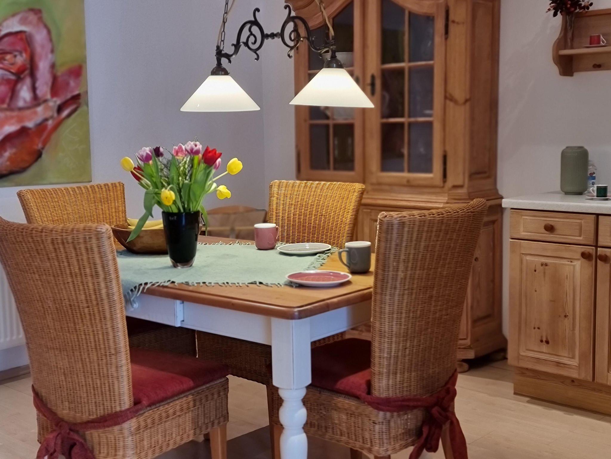 Die ca. 75 qm große, gemütlich möblierte Ferienwohnung im Luftkurort Schledehausen verfügt über eine offene Küche mit Essecke, ein Wohnzimmer mit einer Schlafcouch, ein großzügiges Duschbad, Flur und ein Schlafzimmer mit Doppelbett 180 X 200 cm. Alle modernen, elektrischen Haushaltsgeräte sind vorhanden, ebenso Sat-TV, Radio-CD Player und Internetzugang.