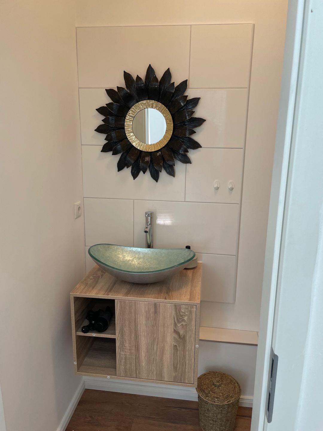 Für Ihre Verpflegung steht eine praktische Kochnische bereit. Sie ist mit einem Herd, Kühlschrank, Wasserkocher, Toaster, Kaffeemaschine sowie Küchenutensilien, Geschirr und Besteck umfangreich ausgestattet. Standardmäßig werden zudem Geschirrhandtücher bereitgestellt. Im modernen Badezimmer finden Sie eine Dusche, ein Waschbecken, einen Spiegel, WC, Fenster und selbstverständlich warmes Wasser. Handtücher und Bettwäsche sind im Service enthalten, sodass Sie mit leichtem Gepäck anreisen können.