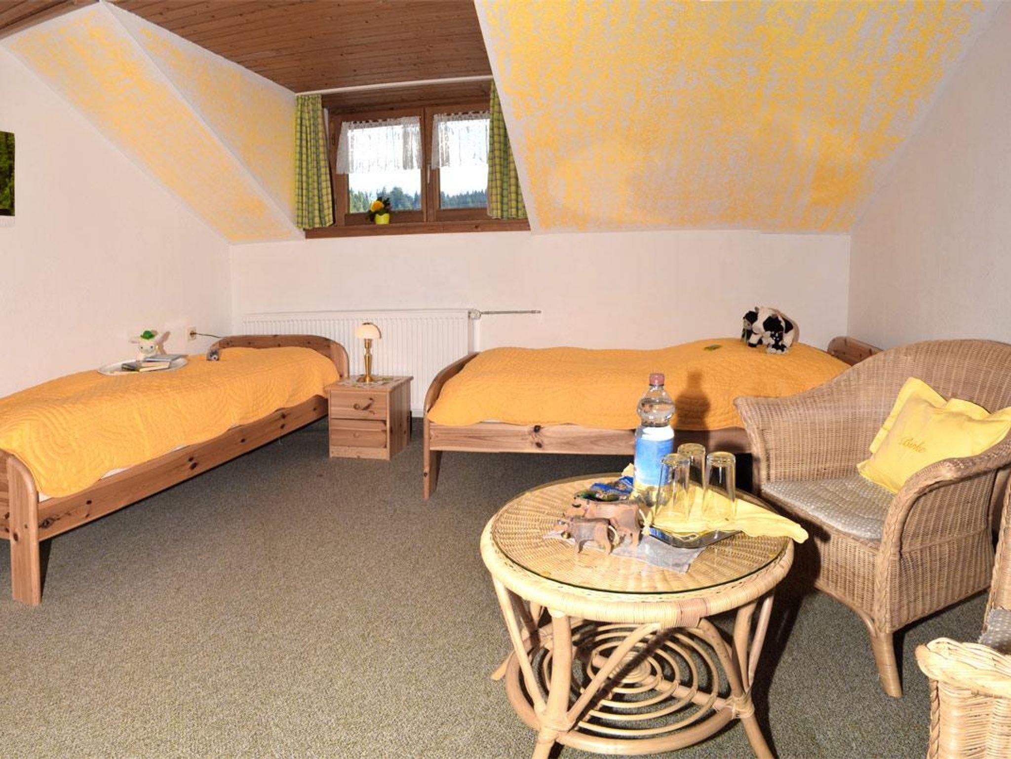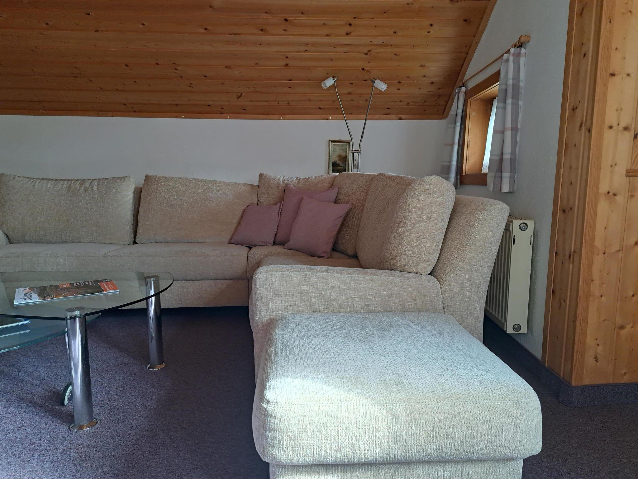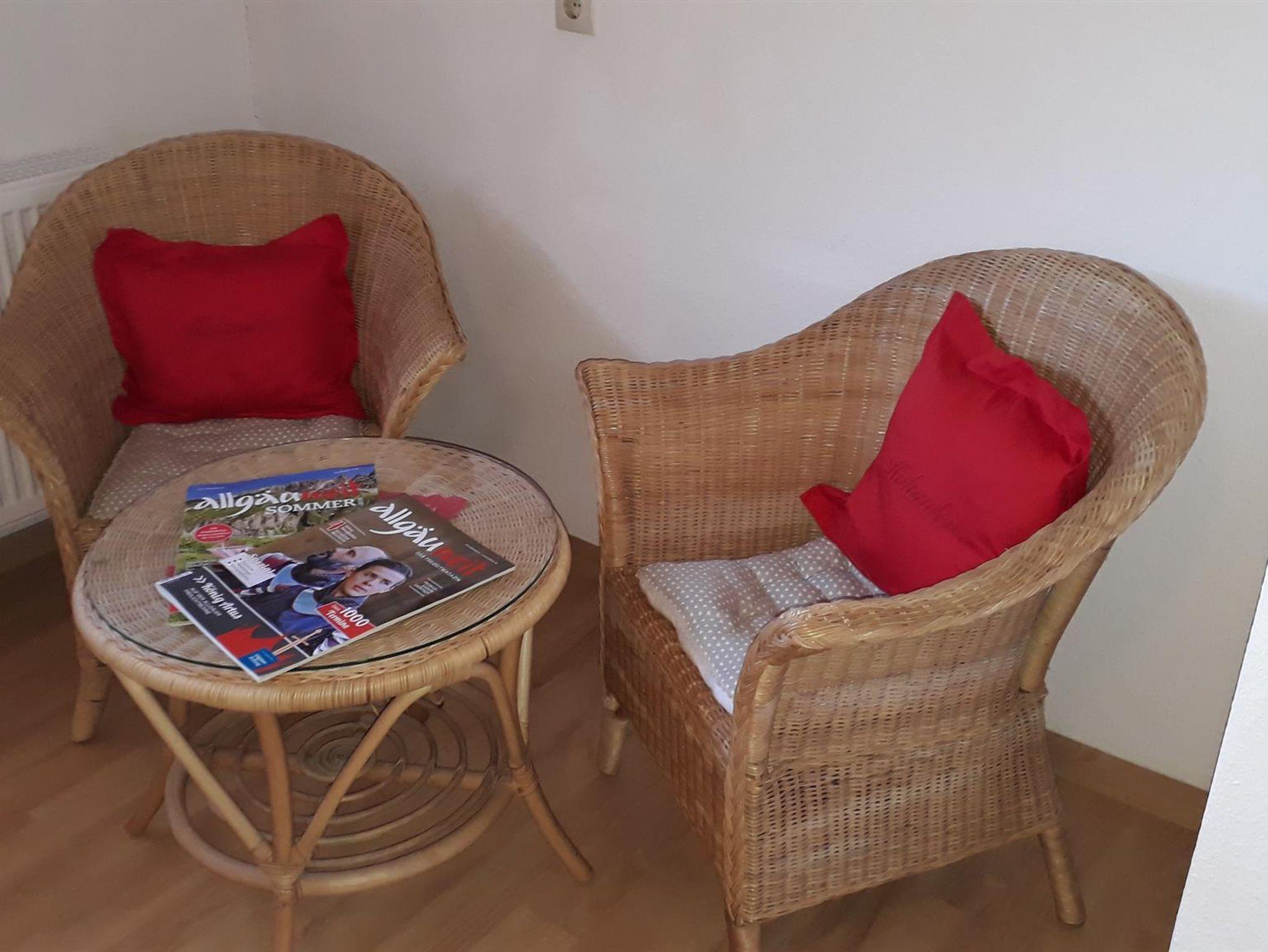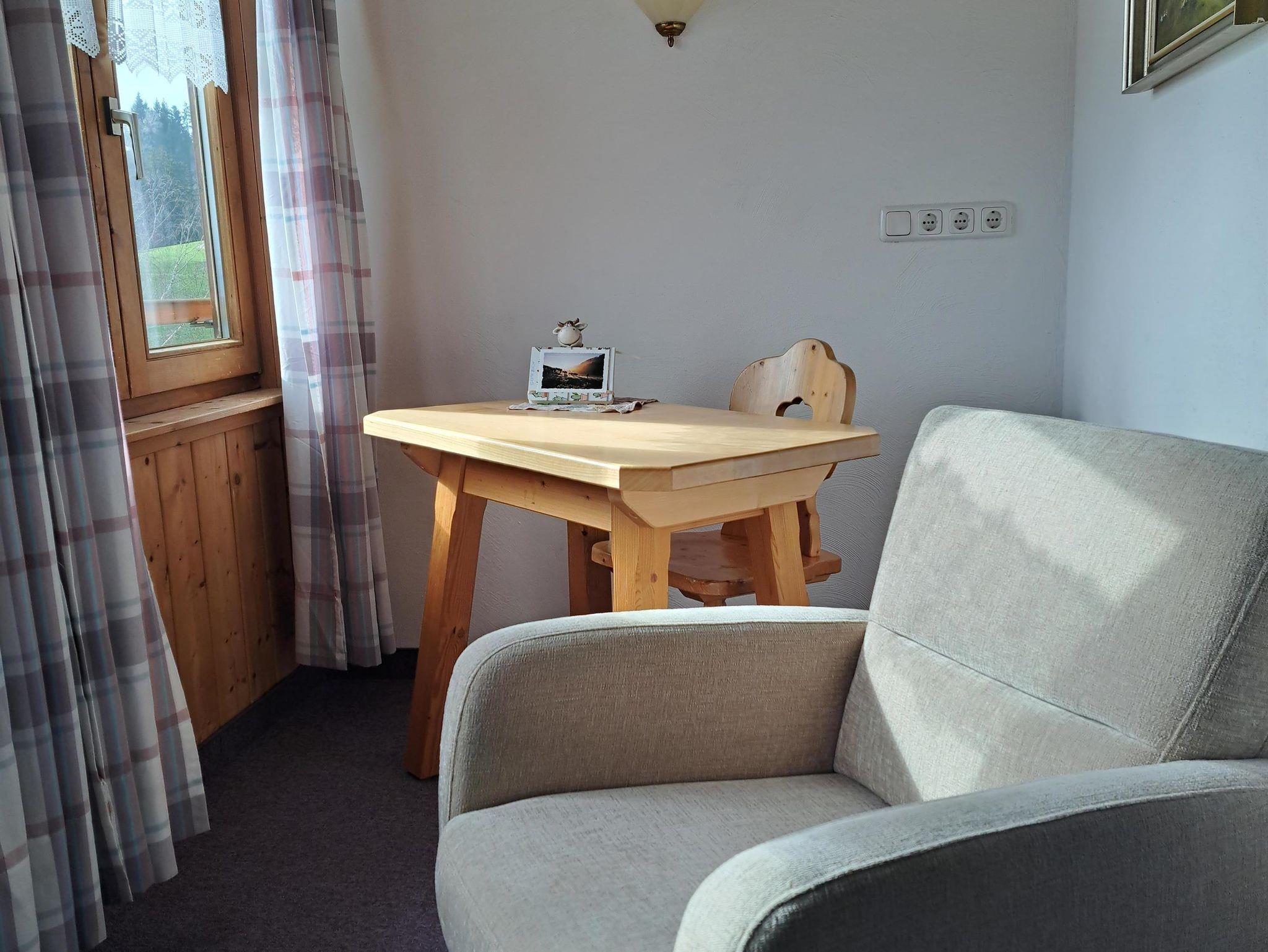 Im geräumigen, hellen Wohnzimmer befindet sich eine bequeme Sitzgruppe mit Schrankwand und Fernsehtischchen mit SAT-TV. Aus allen Fenstern haben Sie einen Blick ins Grüne in Richtung Grünten und das gesamte Illertal. Auch in der Ferienwohnung haben wir kostenloses WLAN bereitgestellt.