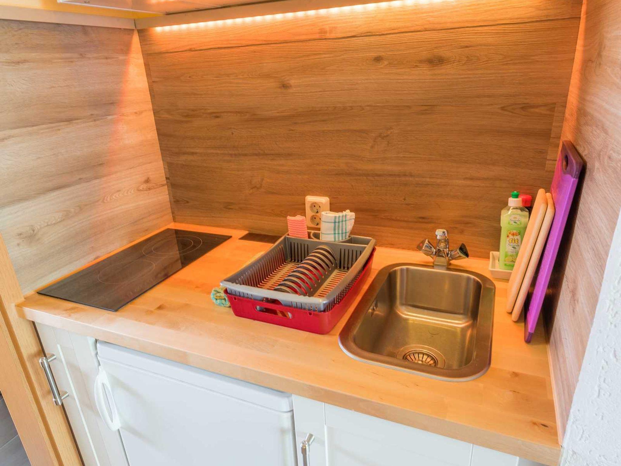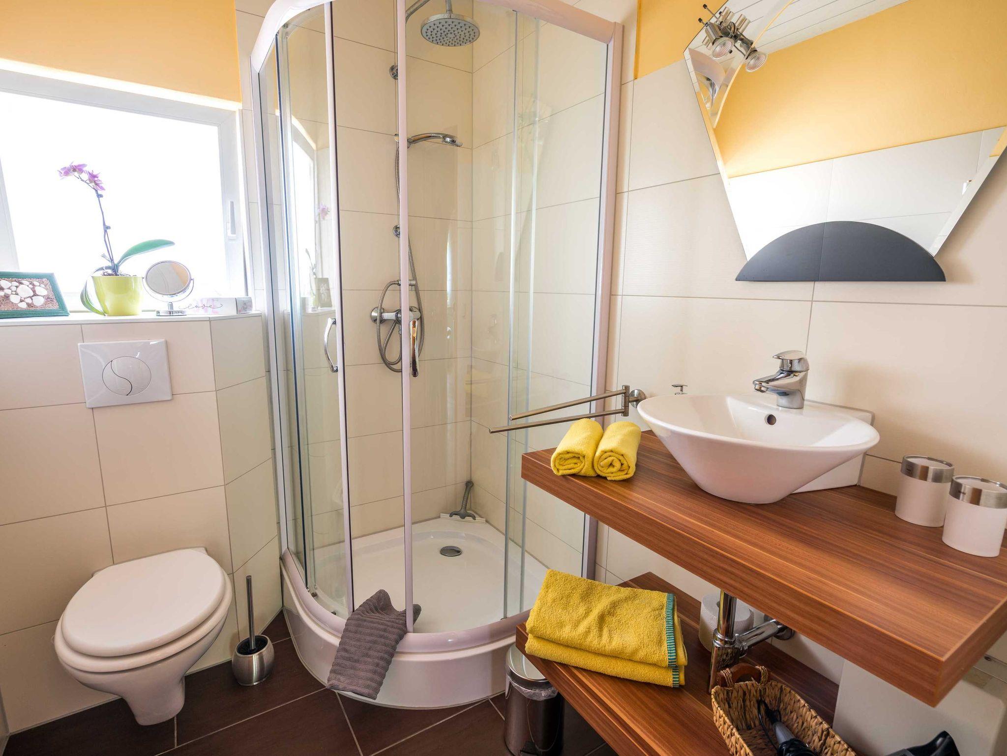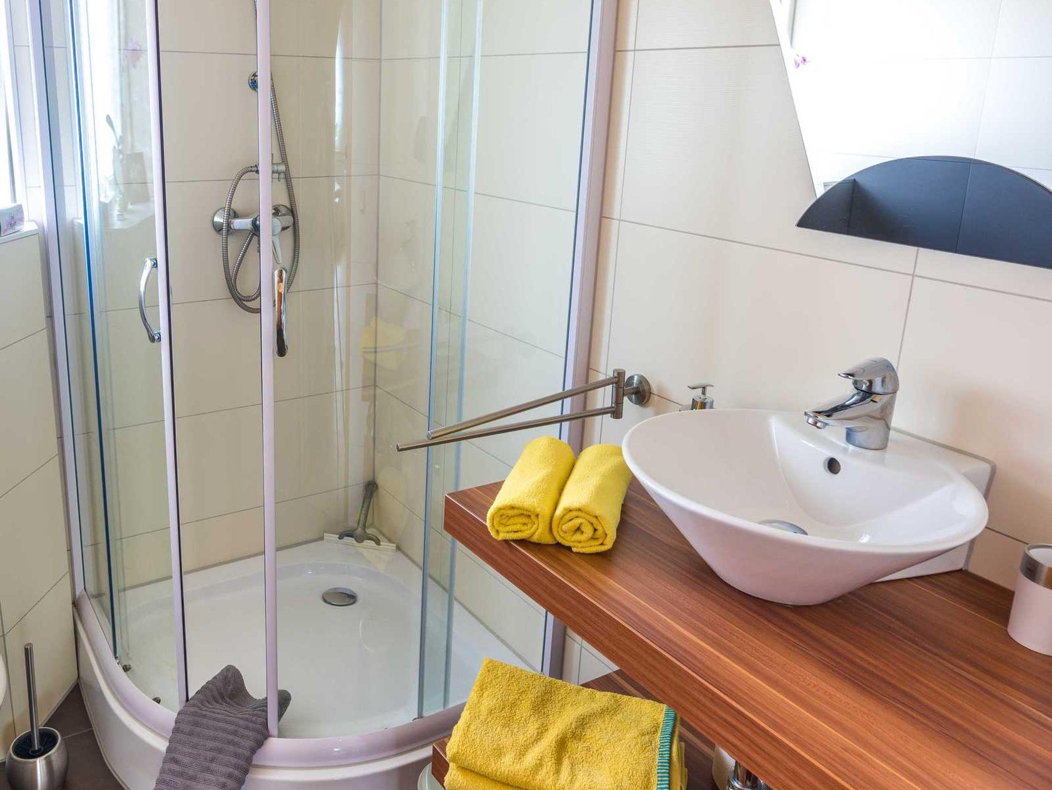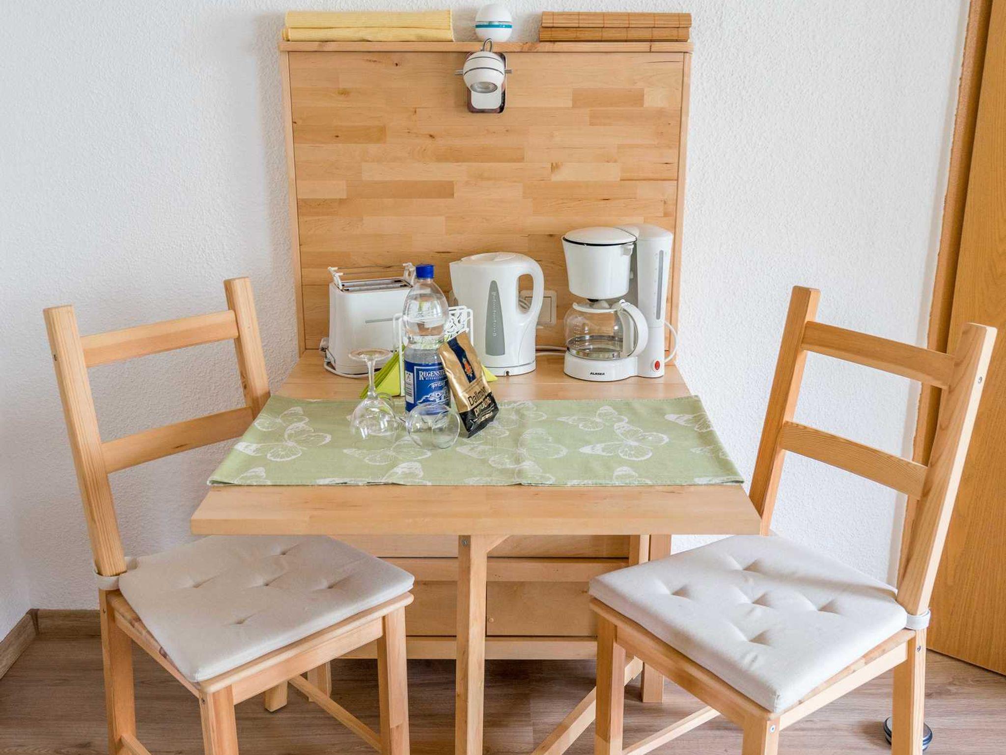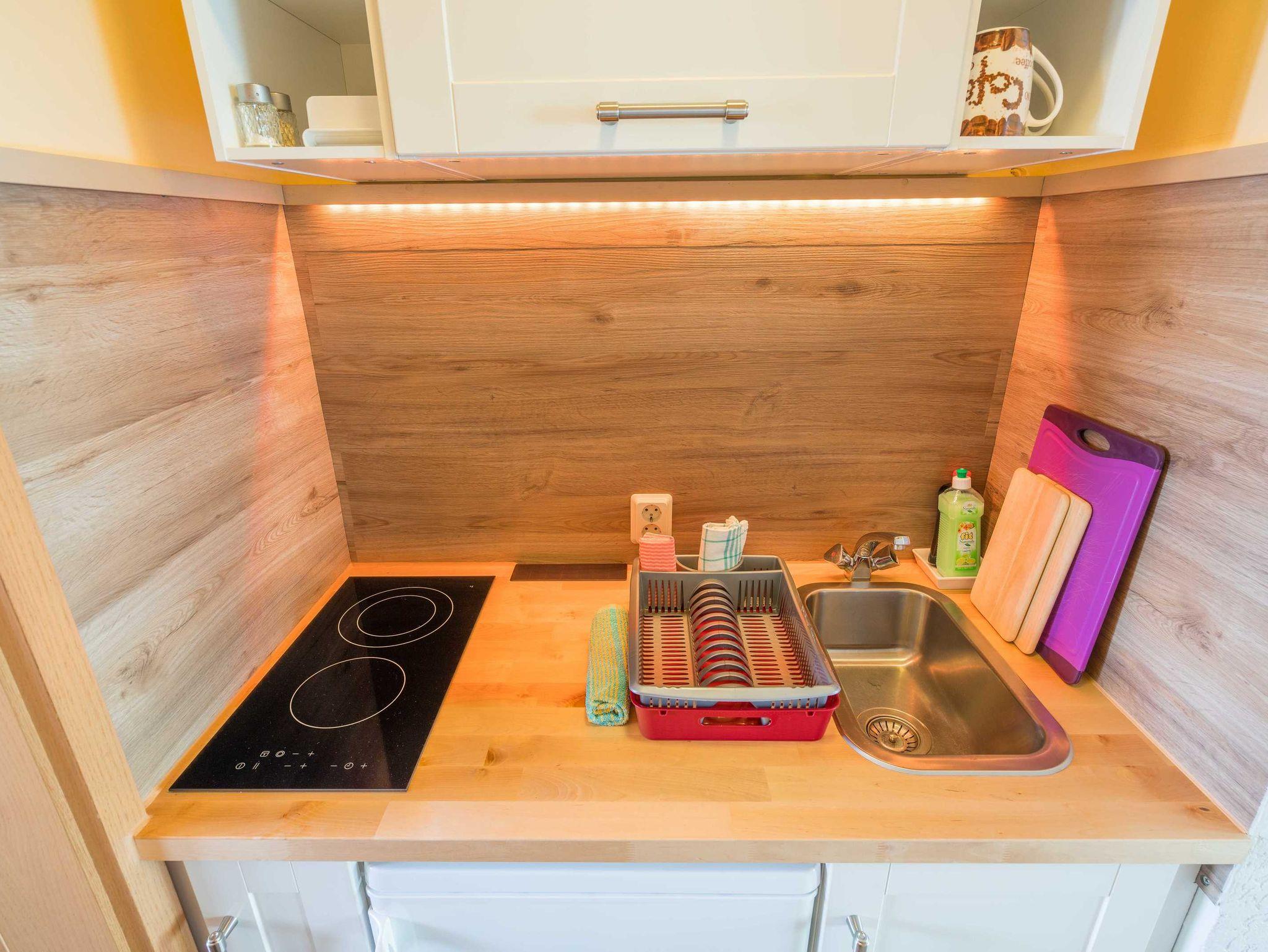 Diese hübsche, im April 2016 neu sanierte und möbelierte Ferienwohnung besticht durch gemütliche Eleganz. Das Wohnzimmer verfügt über eine gemütliche Couch mit Schlaffunktion, einen Flachbildfernseher, Gesellschaftsspiele und Lesematerial. Der Schlafraum ist ausgestattet mit einem Doppelbett und großem, mit Spiegel versehenden Kleiderschrank. Die Pantry Küche hat einen Kühlschrank mit Tiefkühlfach, Ceranfeld, Wasserkocher, Toaster, Kaffeemaschine sowie Geschirr und Töpfe. Im Tageslichtbad befindet sich eine Eckdusche, Wc, ein Waschtisch mit Föhn und Kosmetikspiegel. Außerdem verfügt die Wohnung über kostenloses W-LAN.