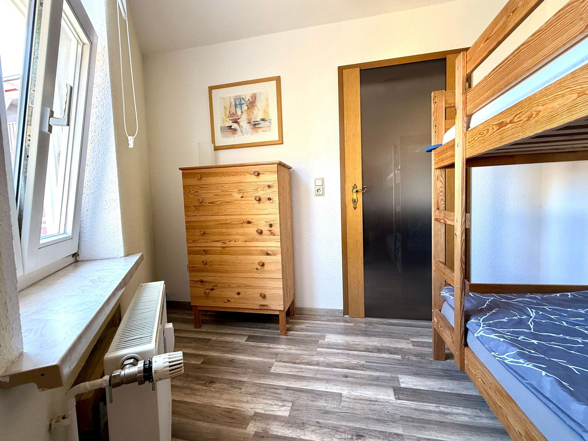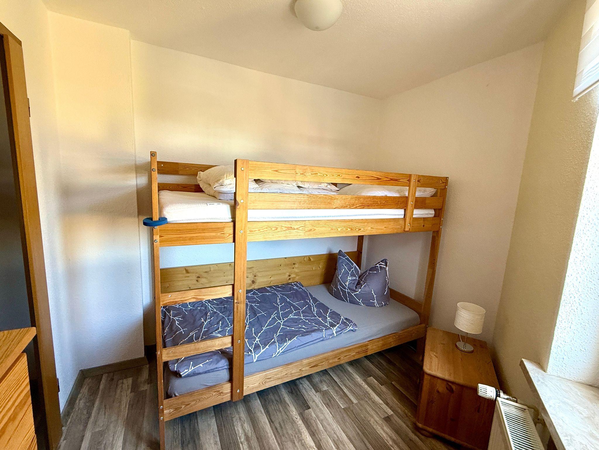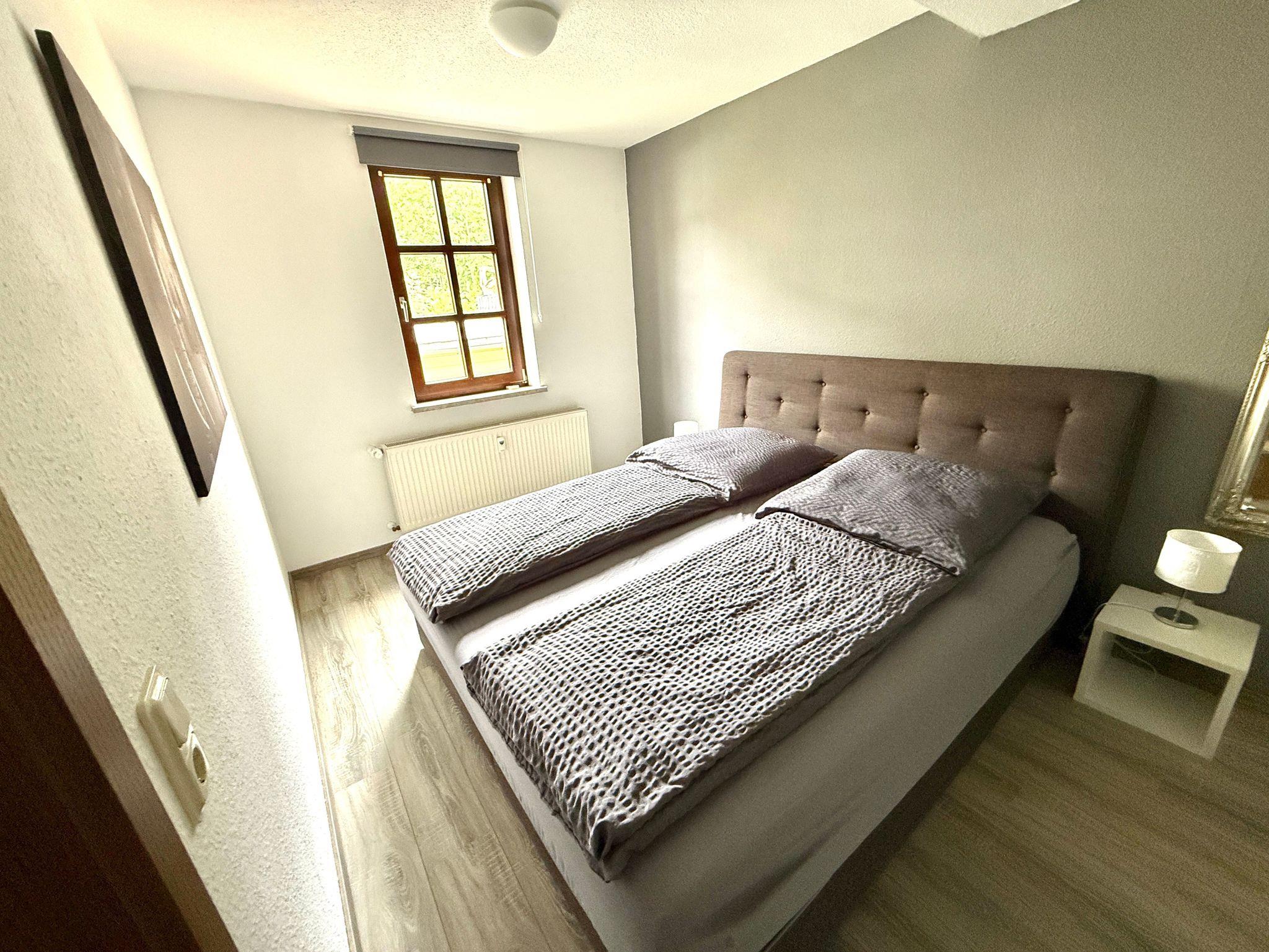 Harztraum - vom Fachwerk umarmt, vom Harz verzaubert: überzeugt das Appartement durch seine moderne Ausstattung im stilvollen Design, vom eleganten Bad bis hin zum Flachbildschirm.Im Schlafzimmer lädt ein großes Boxspringbett mit dick gepolstertem Kopfteil zu erholsamen Nächten ein. Ein zusätzliches Zimmer mit Etagenbett bietet Platz für zwei weitere Gäste. Für die Kleinsten stellen wir gern ein Babybett oder auch eine Hochstuhl bereit. Das Badezimmer ist mit einer ebenerdigen Regendusche ausgestattet und verbindet Komfort mit modernem Ambiente. Die voll ausgestattete Küche gewährt einen schönen Blick in den Garten und macht Selbstversorgung angenehm und unkompliziert. Im Wohnzimmer sorgen ein großes Sofa und sichtbare Fachwerkbalken für gemütliches Ambiente und besonderes Flair. Im Eingangsbereich rundet ein großzügiger Esstisch mit vier Stühlen das stimmige Gesamtbild ab ? ideal für gemeinsame Mahlzeiten oder Spielabende in geselliger Runde.