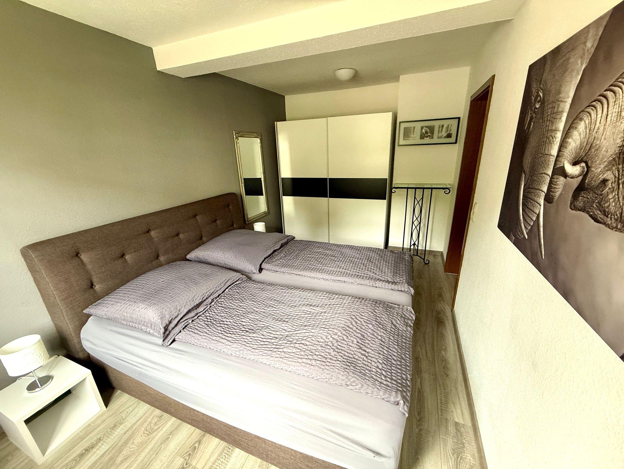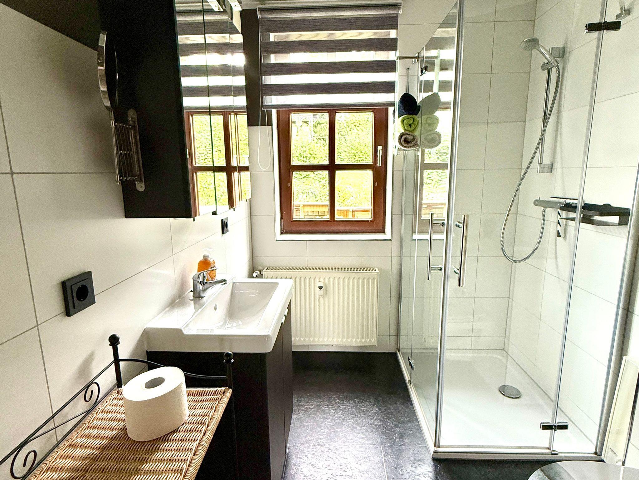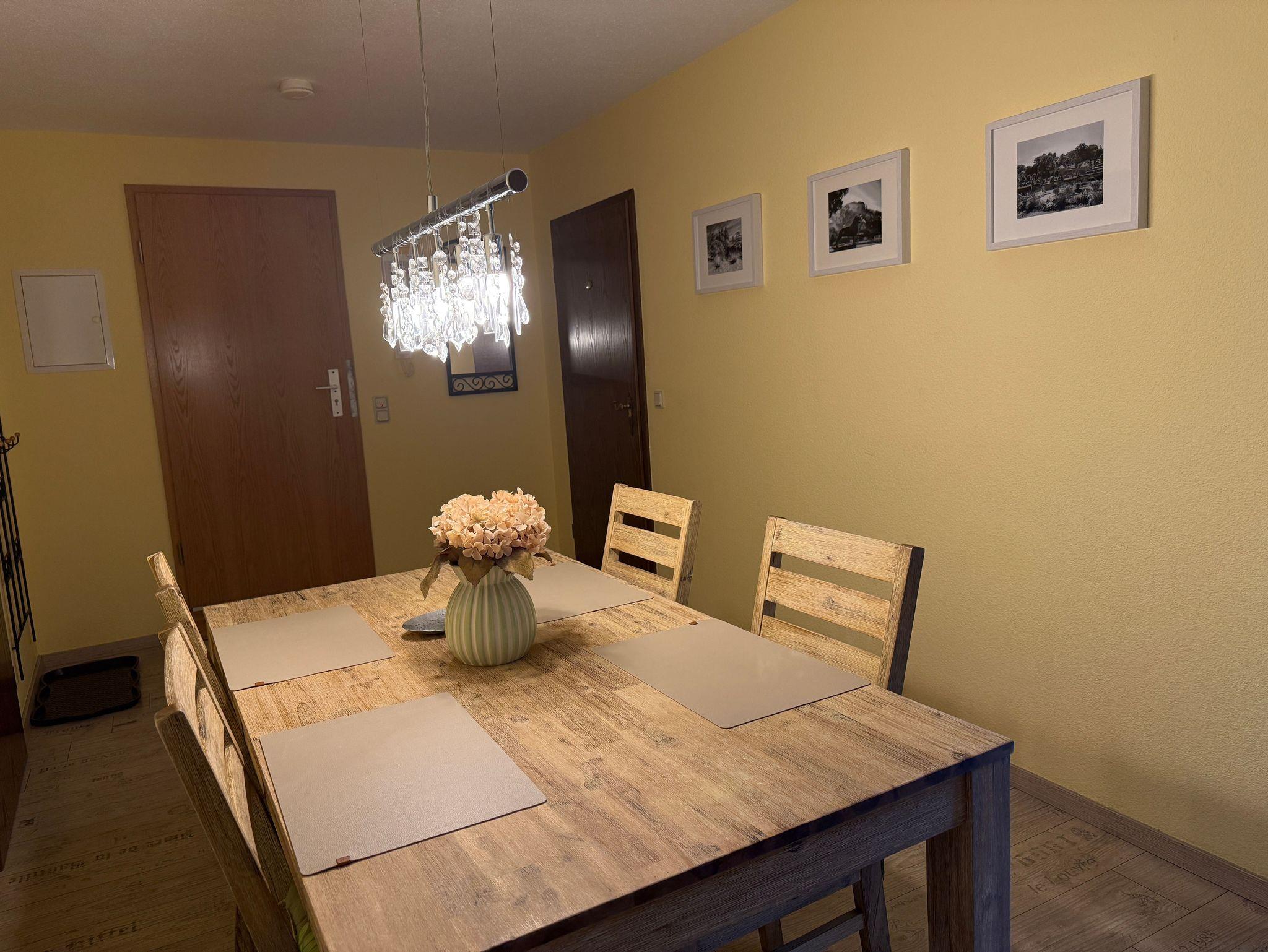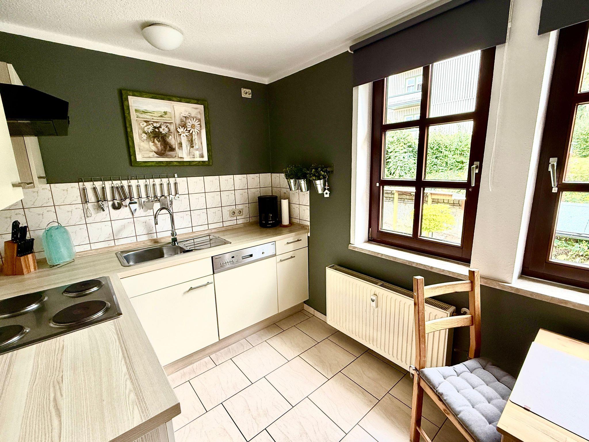 Harztraum - vom Fachwerk umarmt, vom Harz verzaubert: überzeugt das Appartement durch seine moderne Ausstattung im stilvollen Design, vom eleganten Bad bis hin zum Flachbildschirm.Im Schlafzimmer lädt ein großes Boxspringbett mit dick gepolstertem Kopfteil zu erholsamen Nächten ein. Ein zusätzliches Zimmer mit Etagenbett bietet Platz für zwei weitere Gäste. Für die Kleinsten stellen wir gern ein Babybett oder auch eine Hochstuhl bereit. Das Badezimmer ist mit einer ebenerdigen Regendusche ausgestattet und verbindet Komfort mit modernem Ambiente. Die voll ausgestattete Küche gewährt einen schönen Blick in den Garten und macht Selbstversorgung angenehm und unkompliziert. Im Wohnzimmer sorgen ein großes Sofa und sichtbare Fachwerkbalken für gemütliches Ambiente und besonderes Flair. Im Eingangsbereich rundet ein großzügiger Esstisch mit vier Stühlen das stimmige Gesamtbild ab ? ideal für gemeinsame Mahlzeiten oder Spielabende in geselliger Runde.