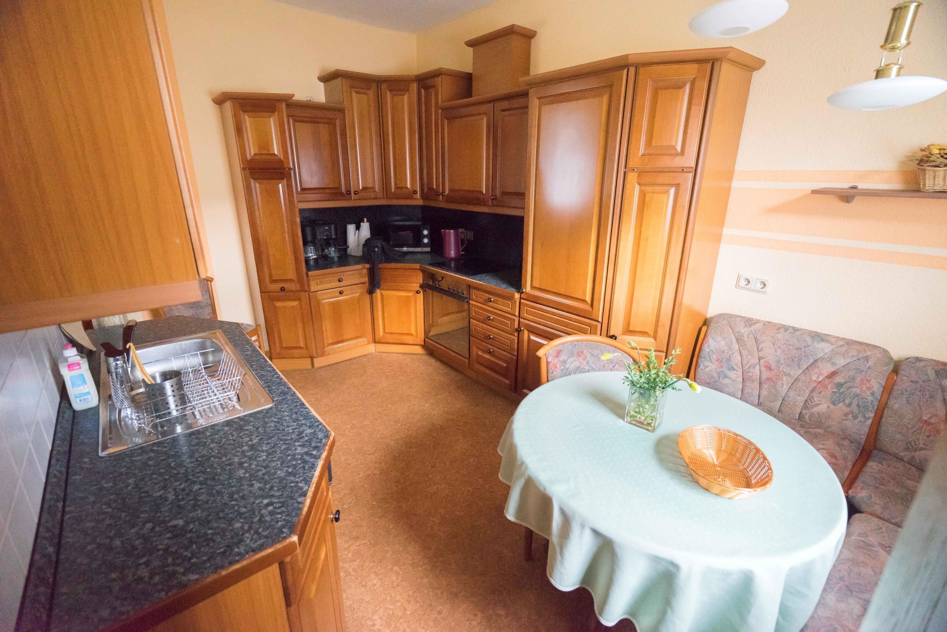 Die große Küche bietet neben der normalen Ausstattung wie Herd, Kühlgefrierkombination, eine Kaffeemaschine, einen Toaster sowie einen Geschirrspüler und eine Mikrowelle.