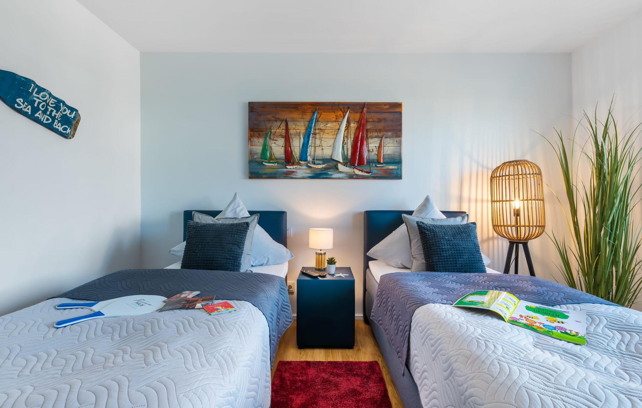 To soveværelser er tilgængelige for afslappende nætter. Et med dobbeltseng og et med to enkeltsenge. I skal dog selv sørge for de smukke drømme. Og hvis I ikke kan sove, er der et andet TV tilgængeligt. Ud over brugbare ting har det moderne badeværelse en infrarød sauna og en walk-in regnbruser på gulvniveau med håndbruser, og det er ikke sømandsgarn!
