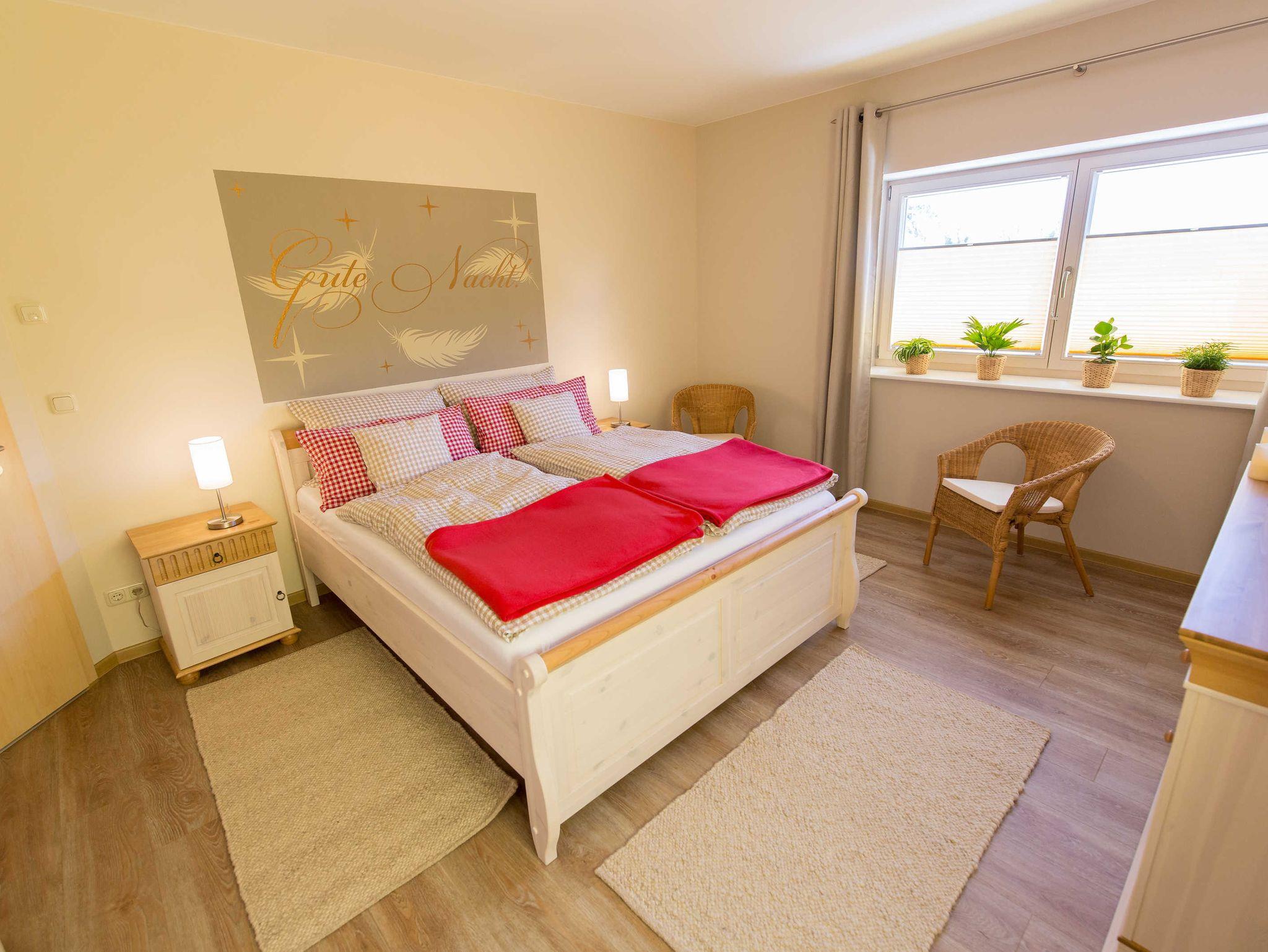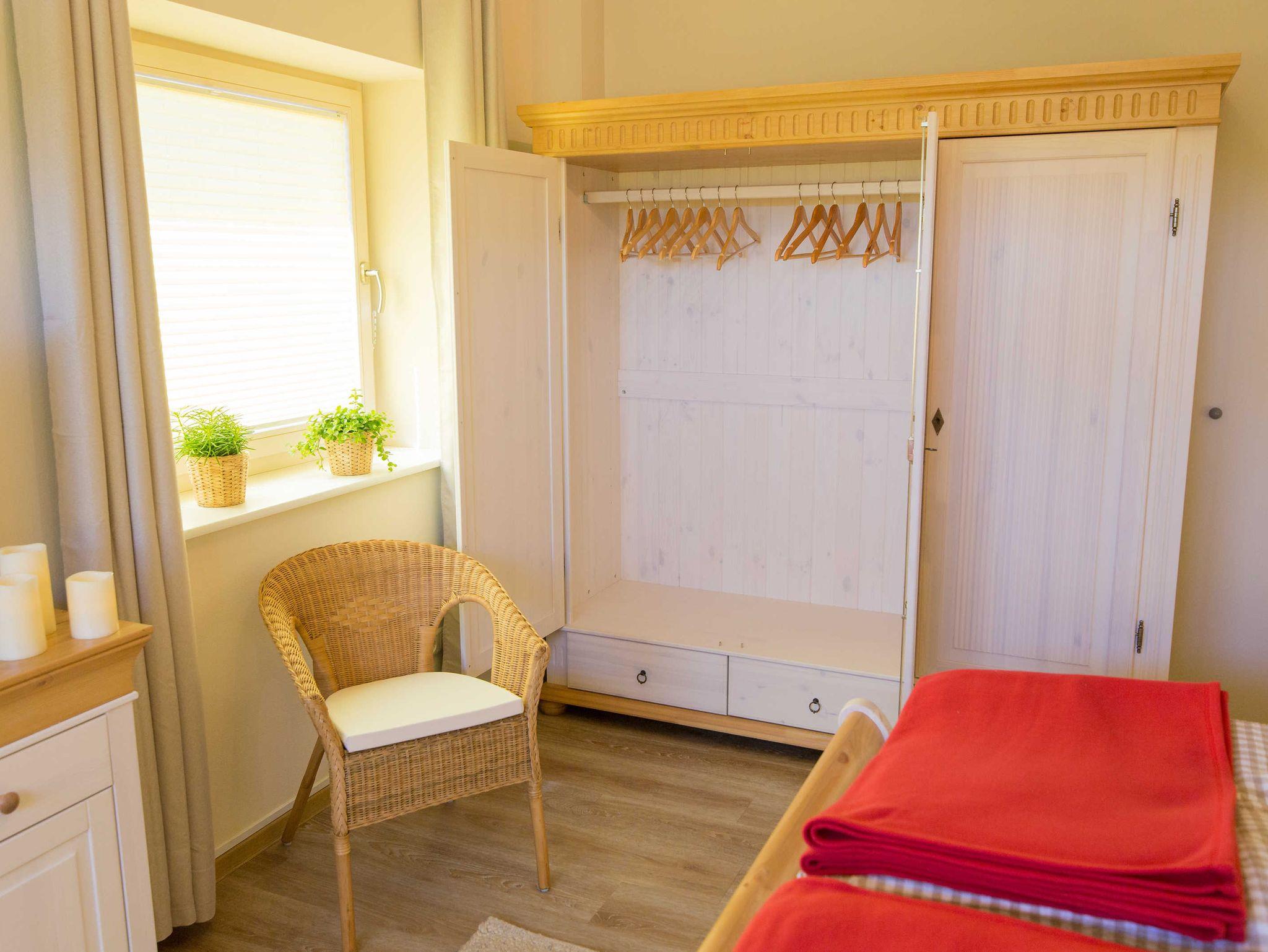 Ein geräumiges Schlafzimmer (17,4m²) zur linken ist ausgestattet mit gewachsten Massivholzmöbeln. Zu einem Doppelbett mit durchgehender Matratze 160x200 cm und mit Nachtschränken 48x60x40 cm, gehört ein großer Kleiderschrank 195x199x62 cm und ein Buffet 140x90x43 cm. Hierauf steht ein Flachbildfarbfernseher zur Ihrer Nutzung. Die Betten sind fertig bezogen, drei unterschiedlich große Kissen und je eine zusätzliche Fleecedecke befinden sich auf dem Bett. Zusätzliche Decken und Kopfkissen auf Wunsch. Drei Schurwollläufer sorgen für Wohlbefinden, wenn Sie das Bett verlassen. Zwei Rattansessel laden zum Ausruhen ein. Vor beiden Fenstern sind Fliegenrahmen montiert, damit Sie bei Lüfterstellung der Fensterflügel keinen Mückenbesuch bekommen. Plissees halten die Sonnenstrahlen, Verdunklungsvorhänge das Licht draußen.