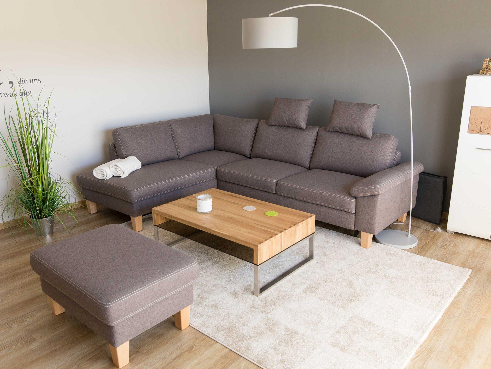 Das geräumig Wohnzimmer (25,8m²) ist für Sie ausgestattet mit einer Winkelsitzkombination mit Schlaffunktion (unter der breiten Sitzfläche lässt sich eine Fläche ausziehen) und einen Sitzhocker. Diese Sitzmöbel haben einen Federkern und bieten somit ein sehr angenehmes Sitzempfinden.