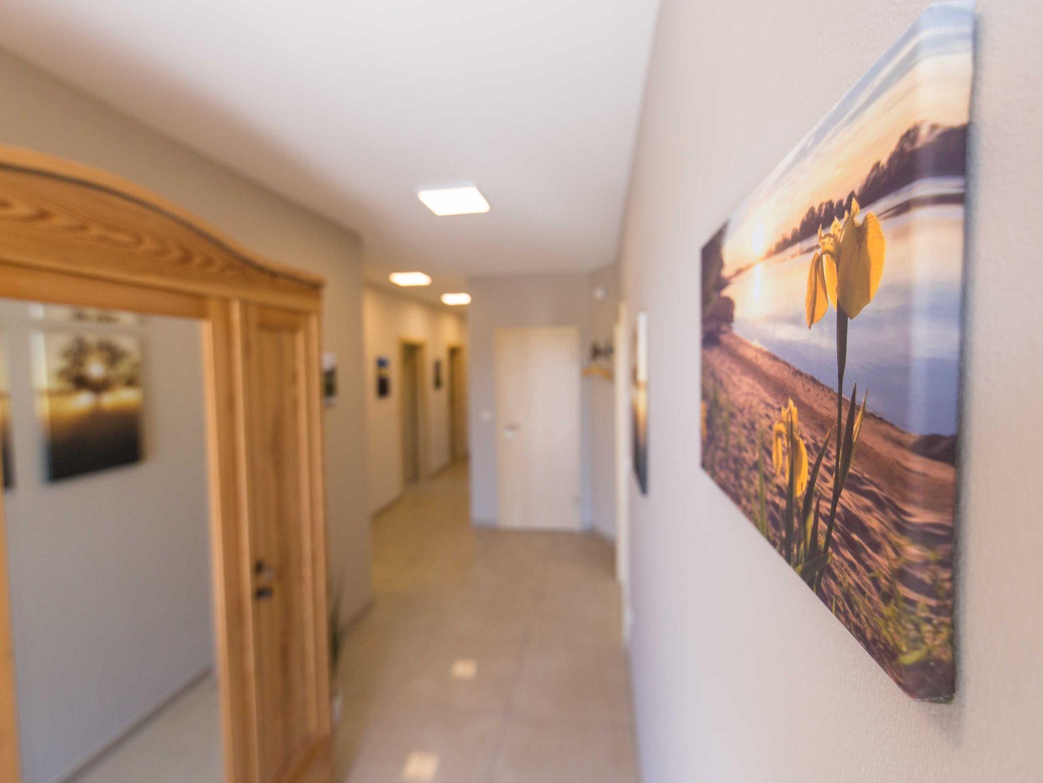 Im Eingangsflur steht neben einem Schirmständer besonderer Art, mit Leihschirmen für Sie, ein wunderschöner alter Kleiderschrank. In ihm befinden sich neben Putzmitteln in einen separaten Schrankteil, auch ein großer Bereich für Ihre Tageswechselgarderobe und Ihr Schuhwerk. Bilder aus der unmittelbaren Umgebung zieren die Wände.