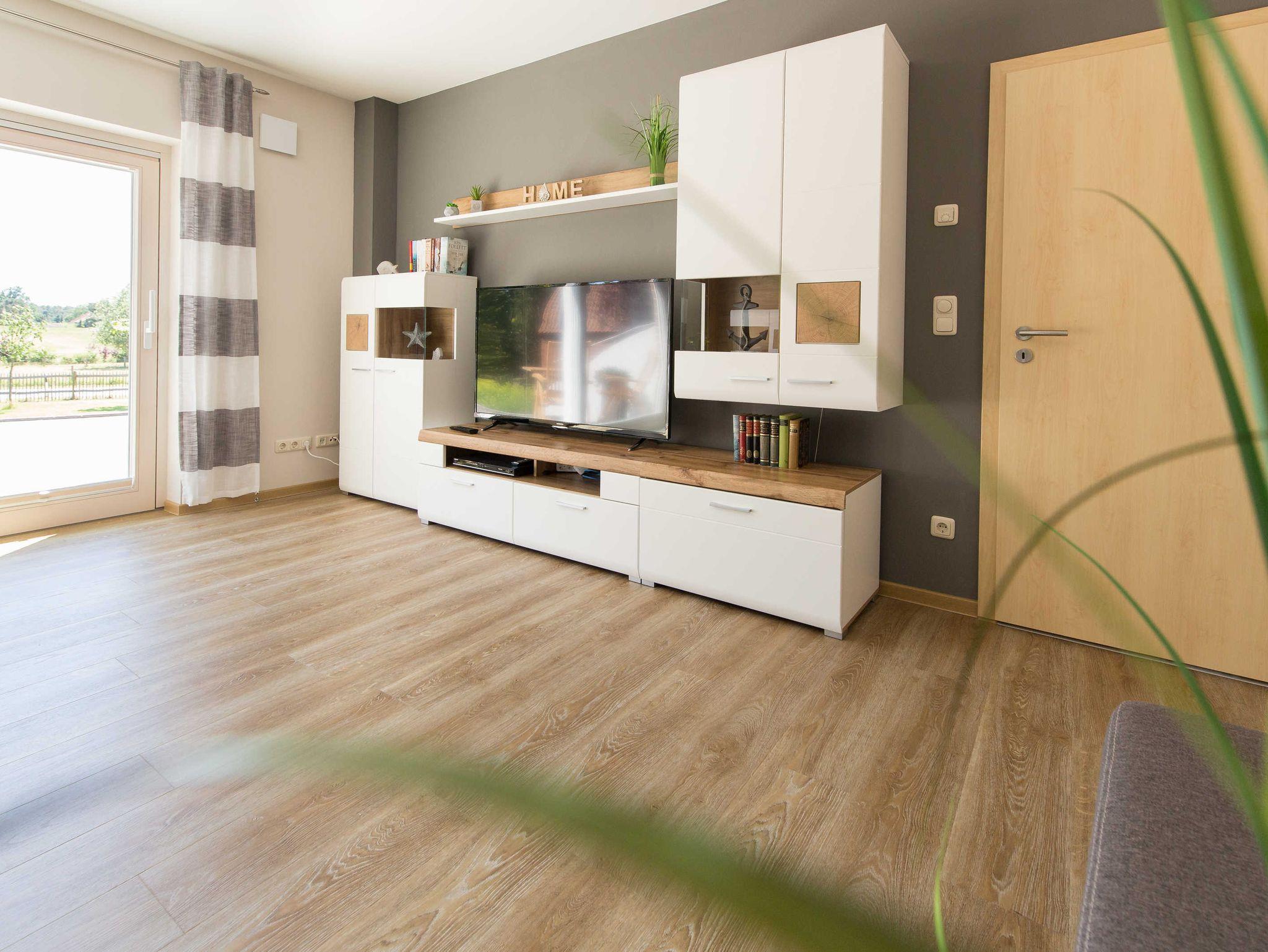 Auf der Wand gegenüber finden Sie links in der Standvitrine verschiedene Gläser, Flaschenöffner, Korkenzieher und Flaschenverschlüsse. In der rechten Hängevitrine finden Sie zahlreiche Spiele, DVD´s und Bücher. Auf dem mittleren Lowboard steht ein großer Flachbildfernseher (139cm Diagonale) mit zahlreichen Funktionen. Auf ihm können Sie beispielweise Ihre Bilder vom Smartphone oder Tablett schnurlos ansehen, oder Ihre App´s abspielen. Auch ein DVD-Spieler ist montiert. Die WLAN-Zugangsdaten sind auf beiden Vitrinentüren innen angebracht. Auch steht Ihnen ein LAN-Zugang zur Verfügung. Für fast alle Elektrogeräte liegen Bedienungsanleitungen für Sie bereit.