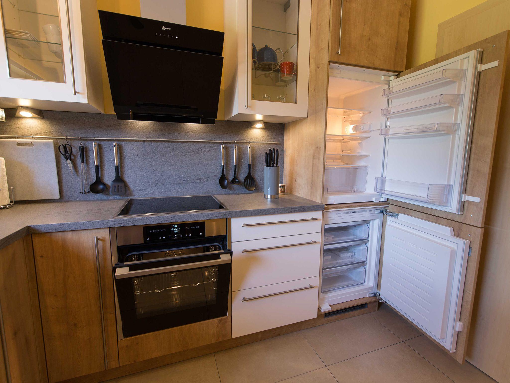 Die anschließende Küche (9,24m²) beinhaltet für Sie einen Esstisch mit 2 bzw. 3 Schwingstühlen, alternativ 2 Stühlen und einem Hochstuhl. Die „Nolte“ Qualitätsküche ist mit Neff-Küchengeräten ausgestattet. Ein Kühlschrank, ein Gefrierschrank, ein Geschirrspüler (Tabs vorhanden), ein Backofen, eine Dunstabzugshaube und ein Induktionskochfeld mit Magnetdrehschalter bieten alles was eine gut ausgestattete Küche auszeichnet. Weitere Elektrogeräte und zahlreiche „Pütt und Pann“, sowie ein Grundsortiment an Gewürzen stehen zu Ihrer Verfügung. Auch eine Grundausstattung mit verschiedenen Teesorten und Kaffee erwarten Sie.