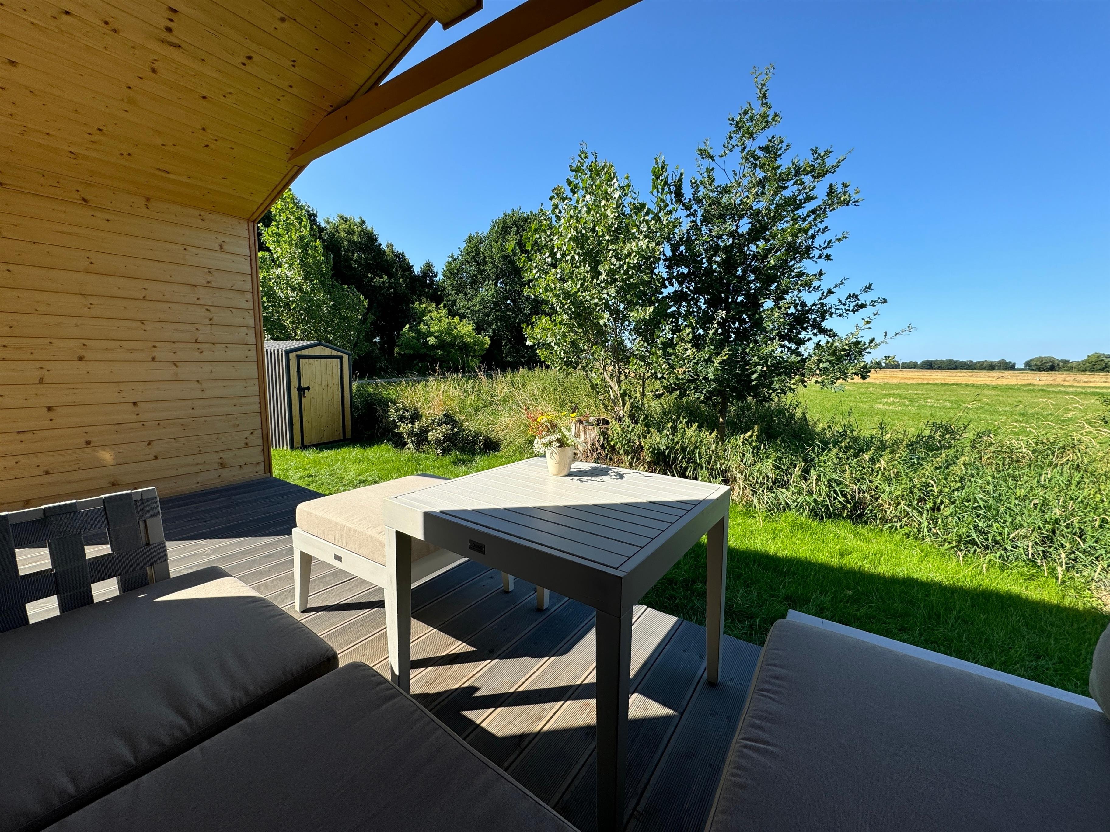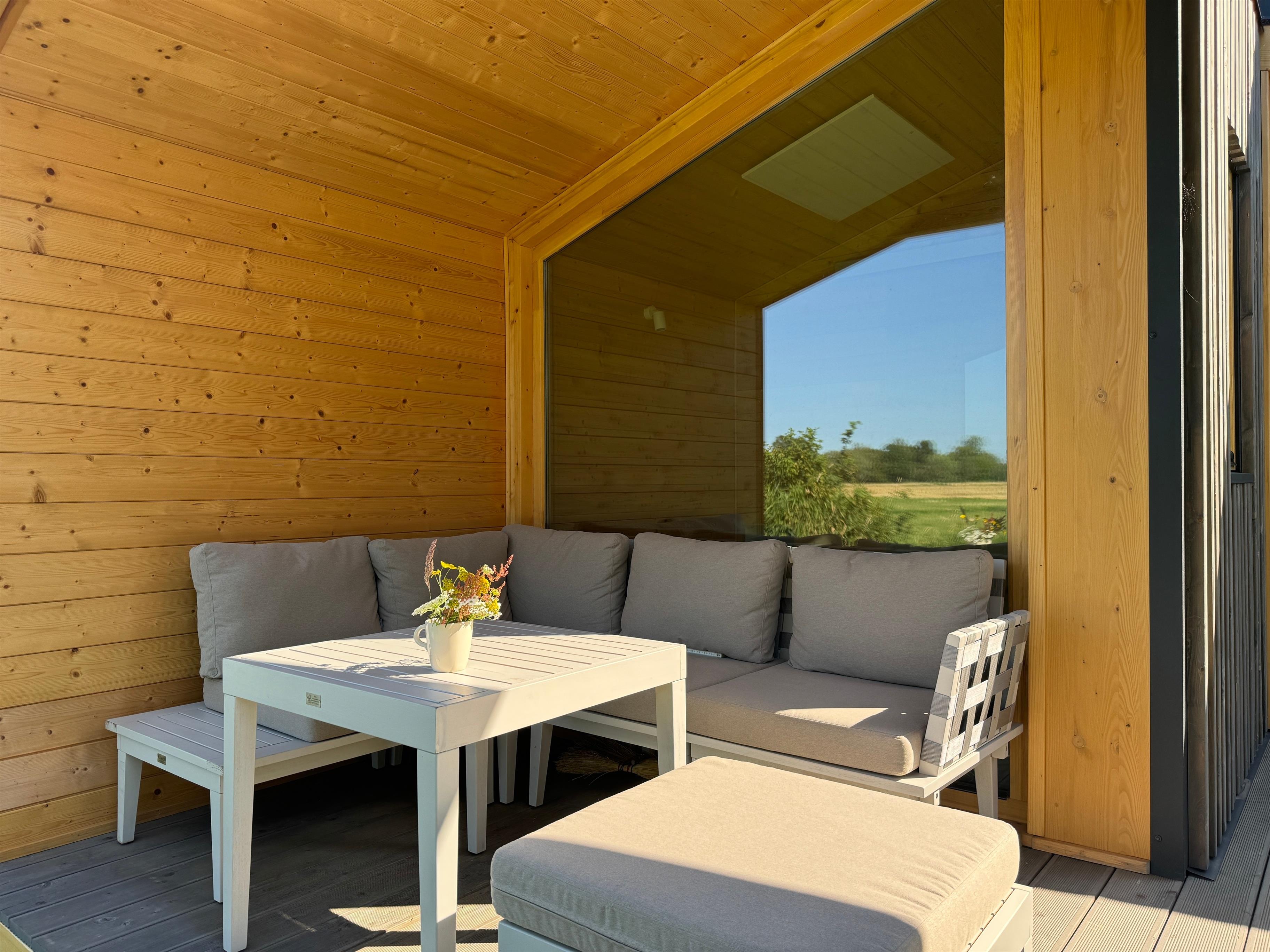 Als erstes Haus am Platz genießt ihr maximale Privatsphäre mit nur einem Nachbarhaus und ungestörtem Weitblick. Euch stehen zwei private Außenbereiche zur Verfügung: Eine großzügige, überdachte Terrasse mit Lounge-Möbeln und Esstisch sowie ein privater Gartenbereich mit einer zweiten möblierten Terrasse unter einer jungen Eiche – ideal für das Frühstück oder Abendessen unter freiem