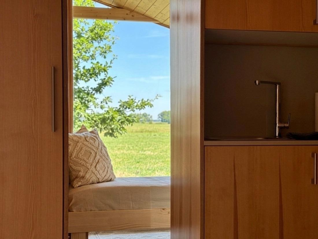 Ein echtes Juwel ist das separate dritte Zimmer in diesem Tiny House: Eine gemütliche Koje mit bodentiefer Fensterfront. Ob als Rückzugsort zum Lesen oder einfach, um bei einer Tasse Tee Rehe, Hasen und Gänse direkt vor dem Fenster zu beobachten – hier seid ihr der Natur ganz nah, völlig ungestört von Wind und Wetter.