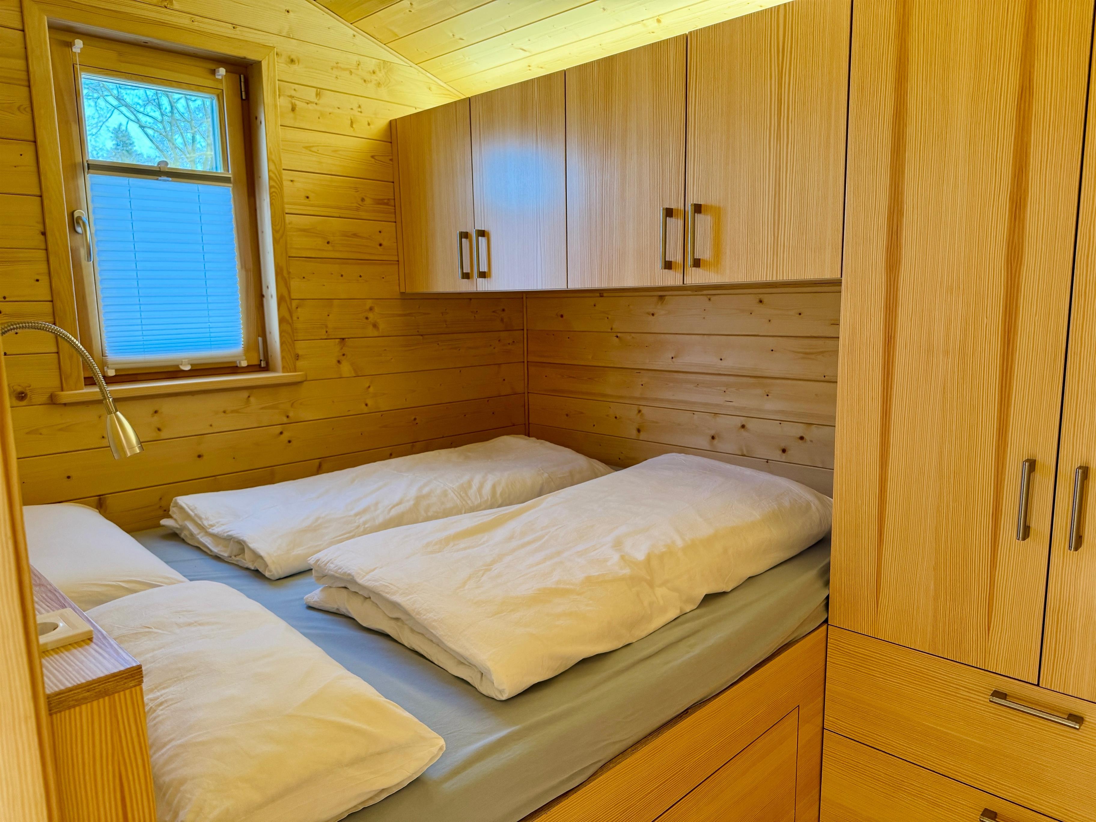 Im Schlafzimmer sorgt ein 160 cm breites Doppelbett für erholsame Nächte. Das separate Bad bietet eine bodentiefe Dusche und Fußbodenheizung - für Wohlfühltemperaturen, auch an kühleren Tagen.