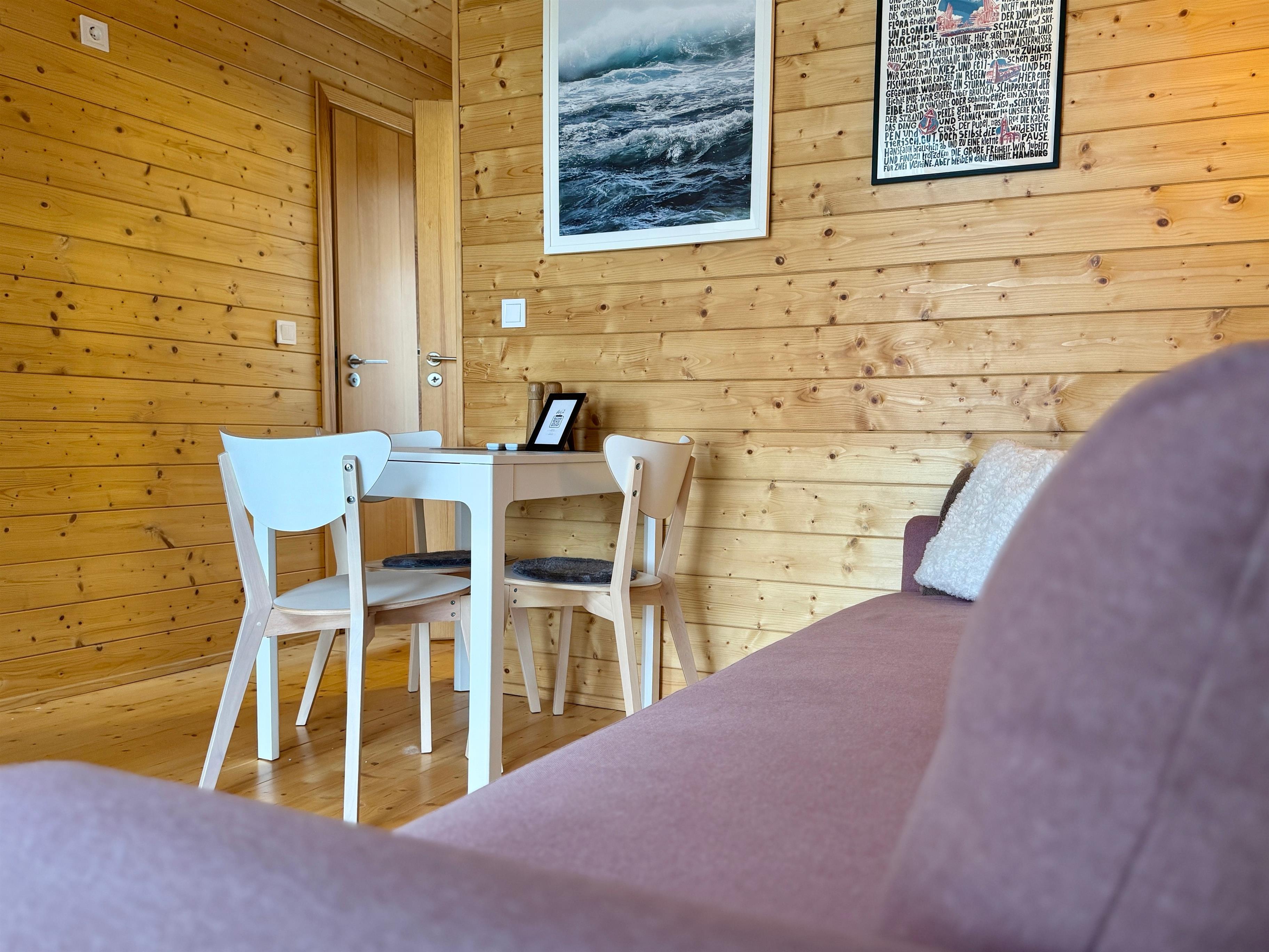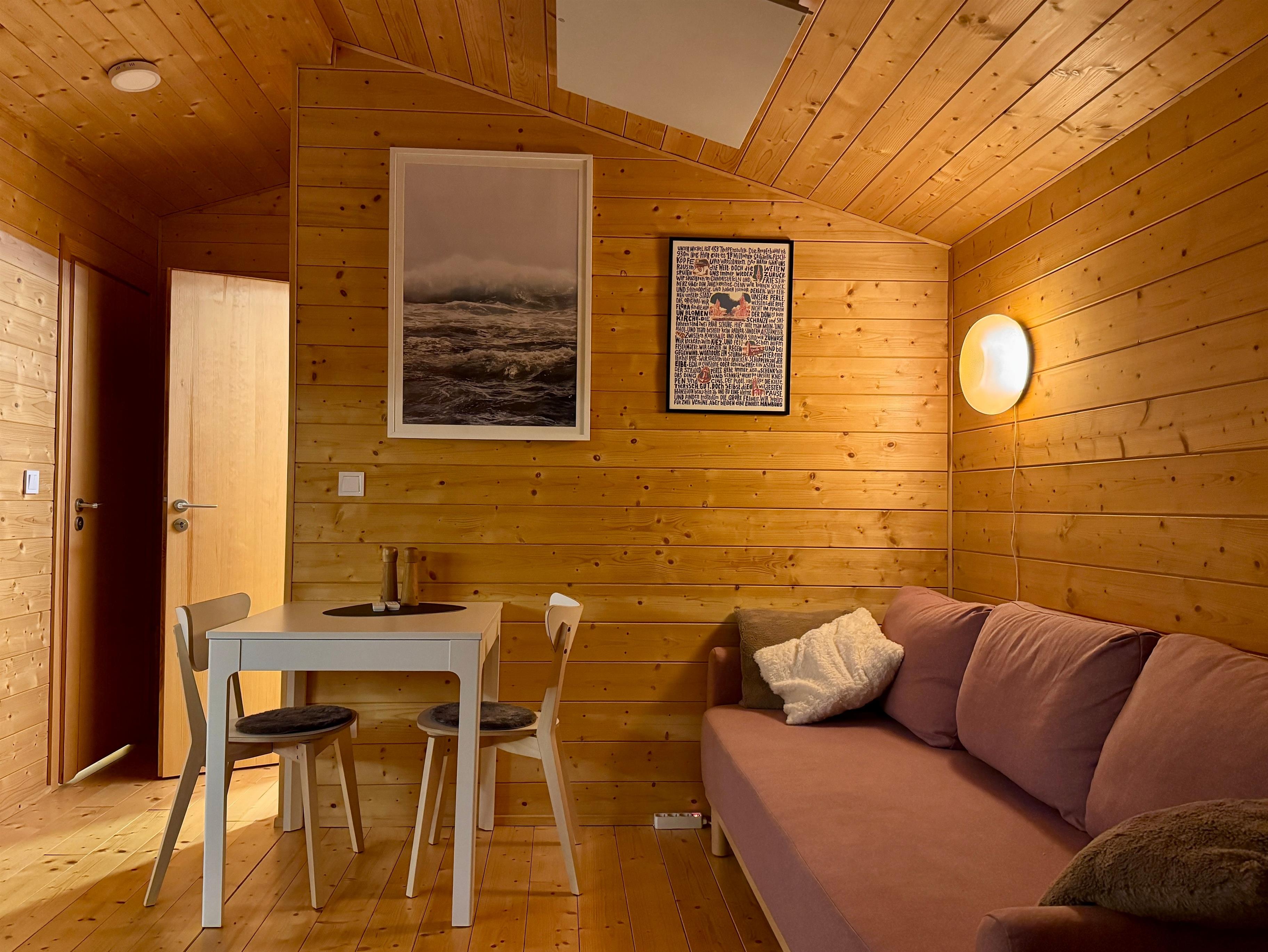 Auf rund 30 qm verbindet die Elbhütte natürliche Holzoptik mit durchdachter Funktionalität. Dank voller Erschließung (Strom, Wasser), 32 Zoll QLED-TV und schnellem WLAN fehlt es an nichts. Der lichtdurchflutete Wohnbereich mit offener Küche lädt zum Verweilen ein. Die Küche ist hochwertig ausgestattet mit Induktionskochfeld, Geschirrspüler und einem Ninja Foodi Backofen/Airfryer – perfekt für frische Sonntagsbrötchen oder eine knusprige Pizza.